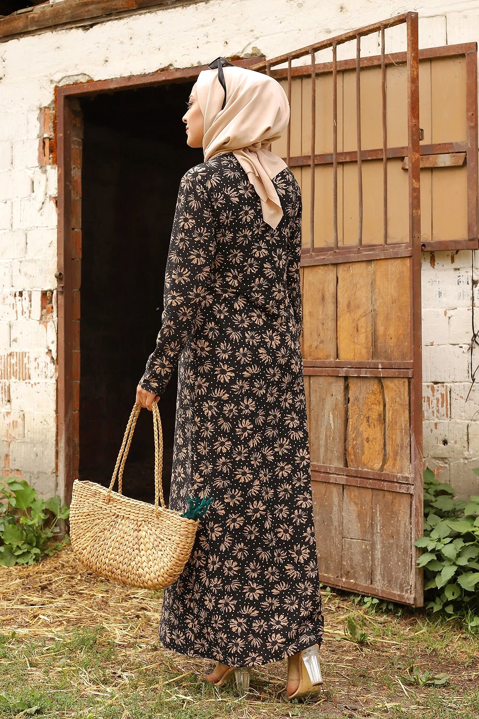 Robe longue en imprimé floral, col rond, coupe légèrement évasée.