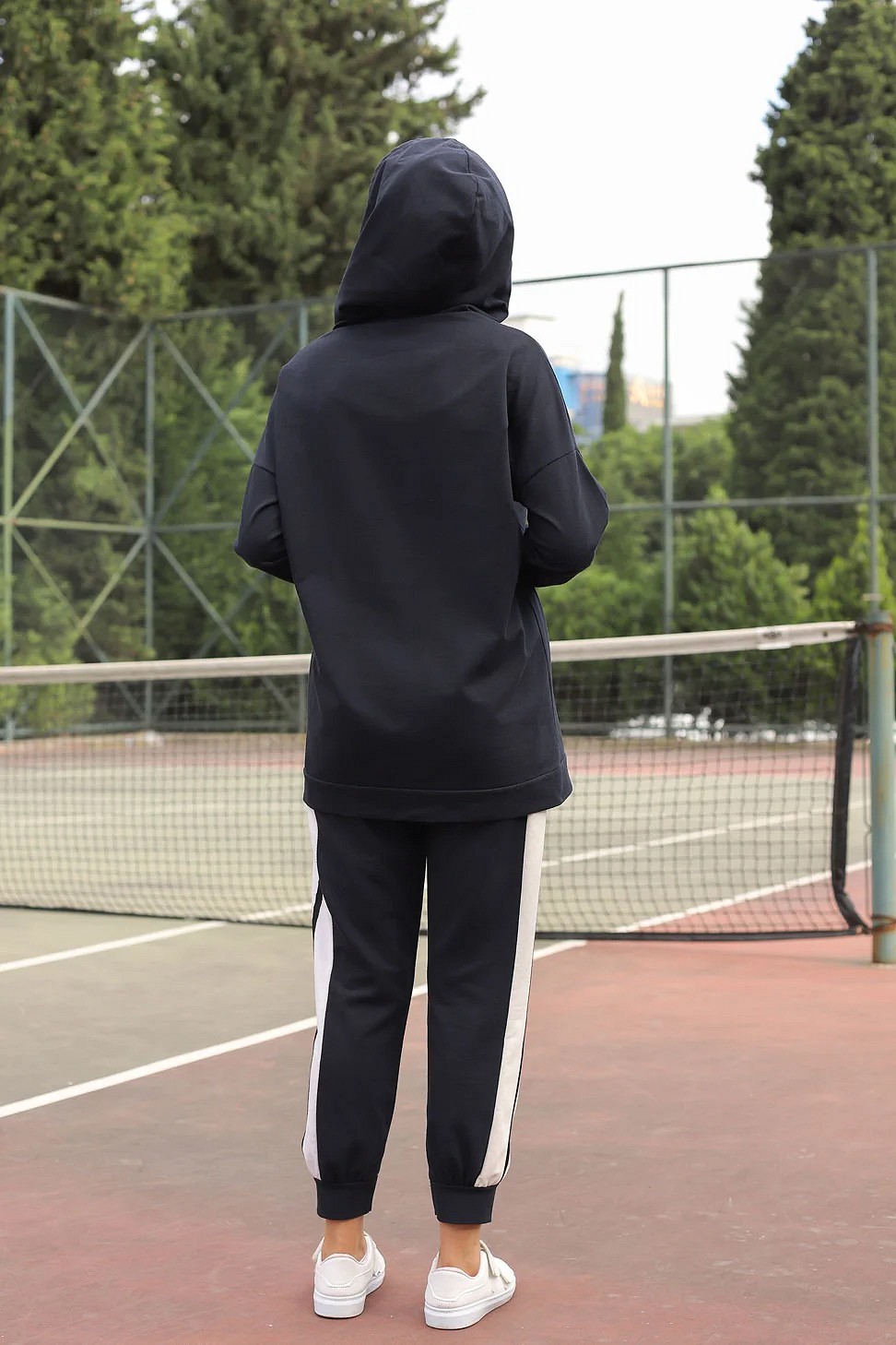 Survêtement 2 pièces composé d'un sweat mi long, capuche avec liens de serrage, coupe droite et d'un bas taille élastique. La signature de ce modèle : deux bandes larges blanches et une bande fine noire.