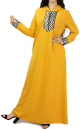 Robe longue type abaya marocaine moderne avec capuche et motifs dorés pour femme - Couleur jaune moutarde - REF. 29528 (29.00 €)