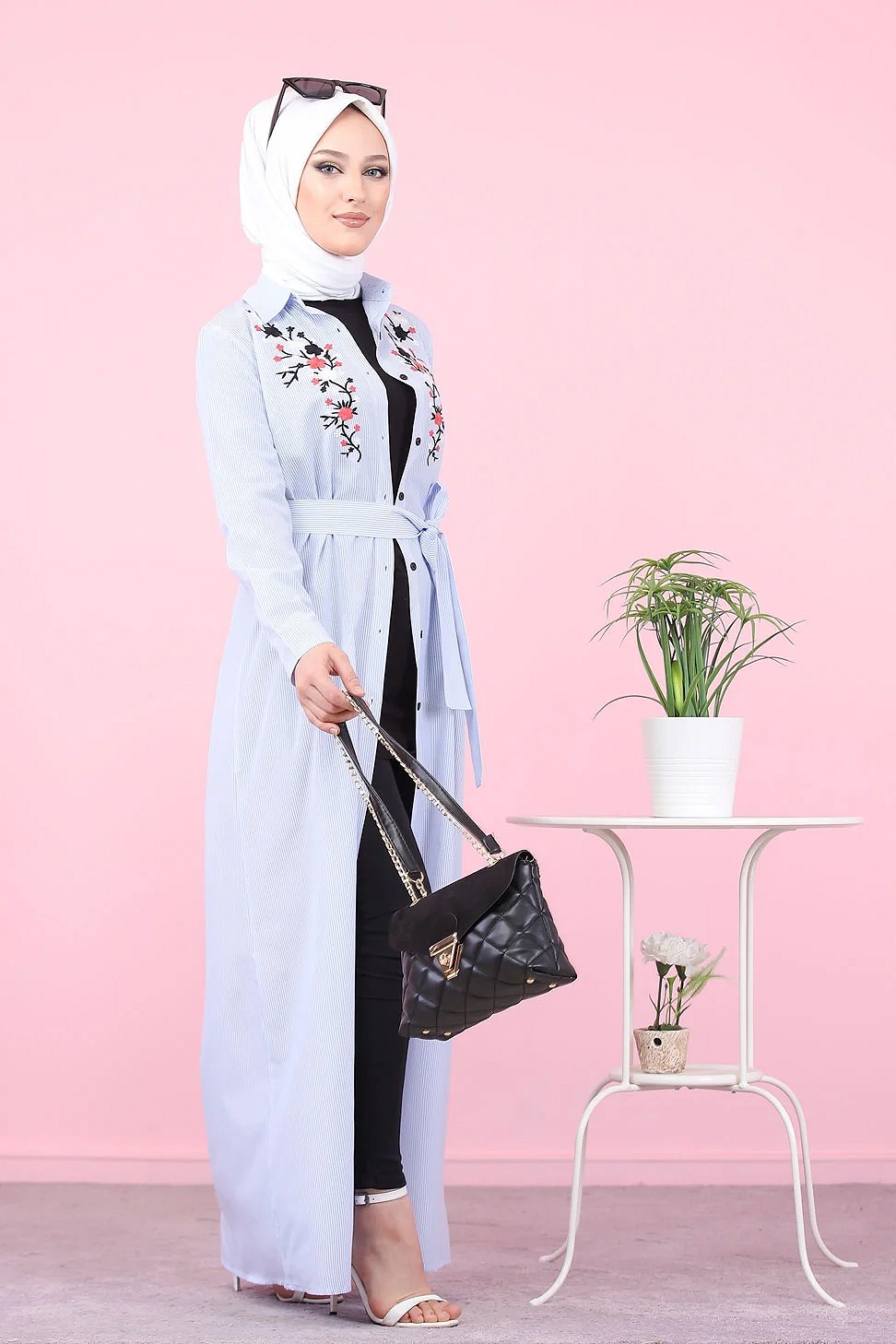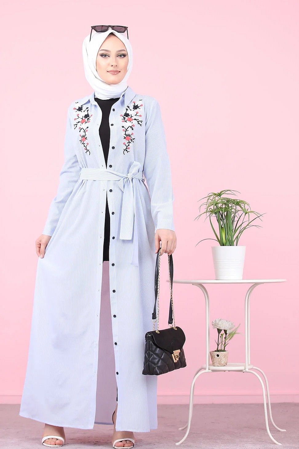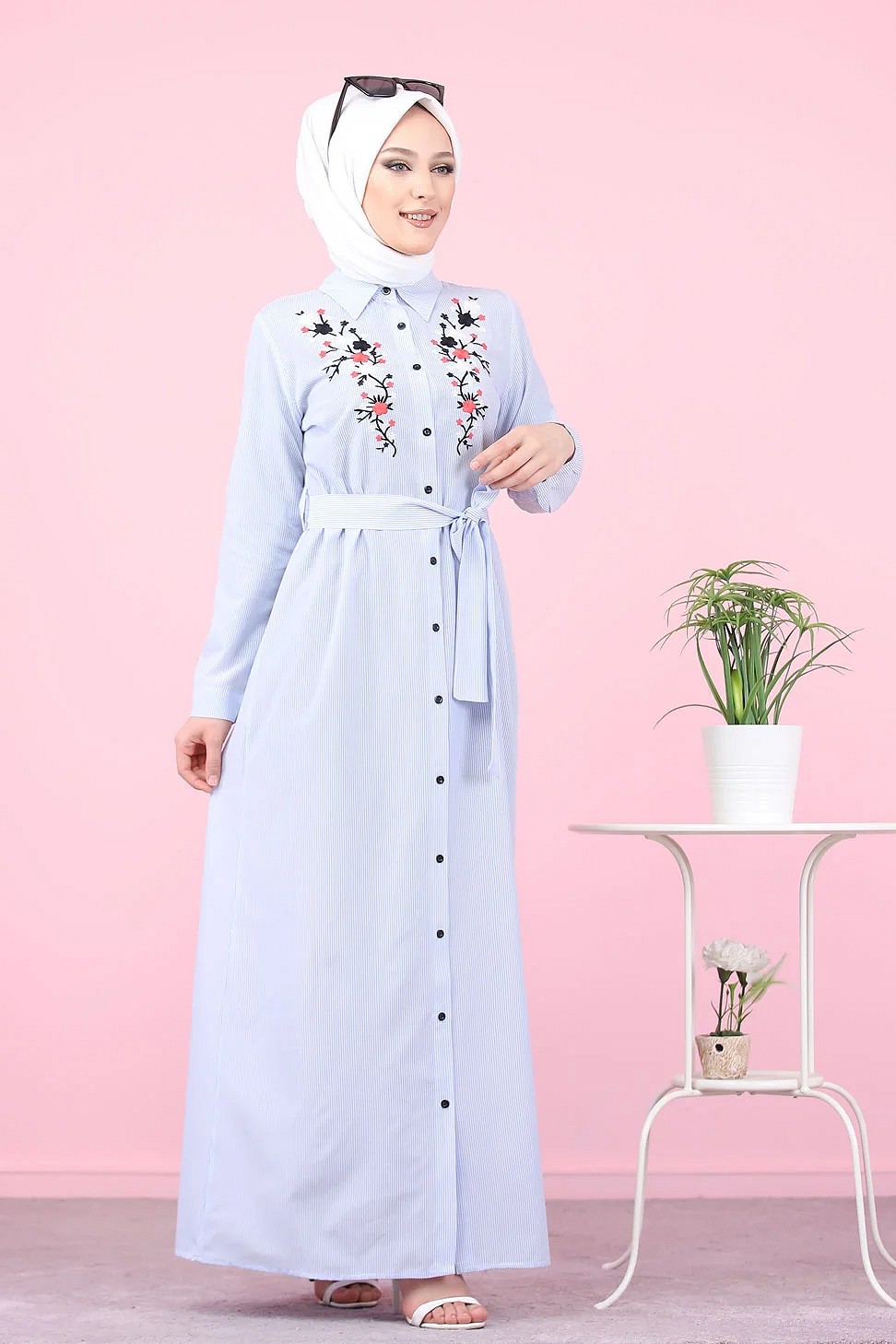 Robe chemise longue a rayures bleues avec ceinture (Vetement hijab femme musulmane)