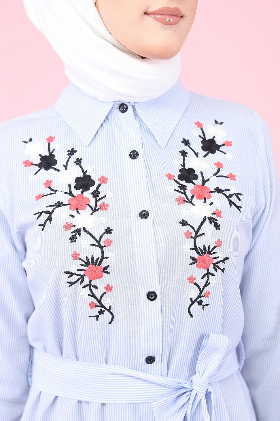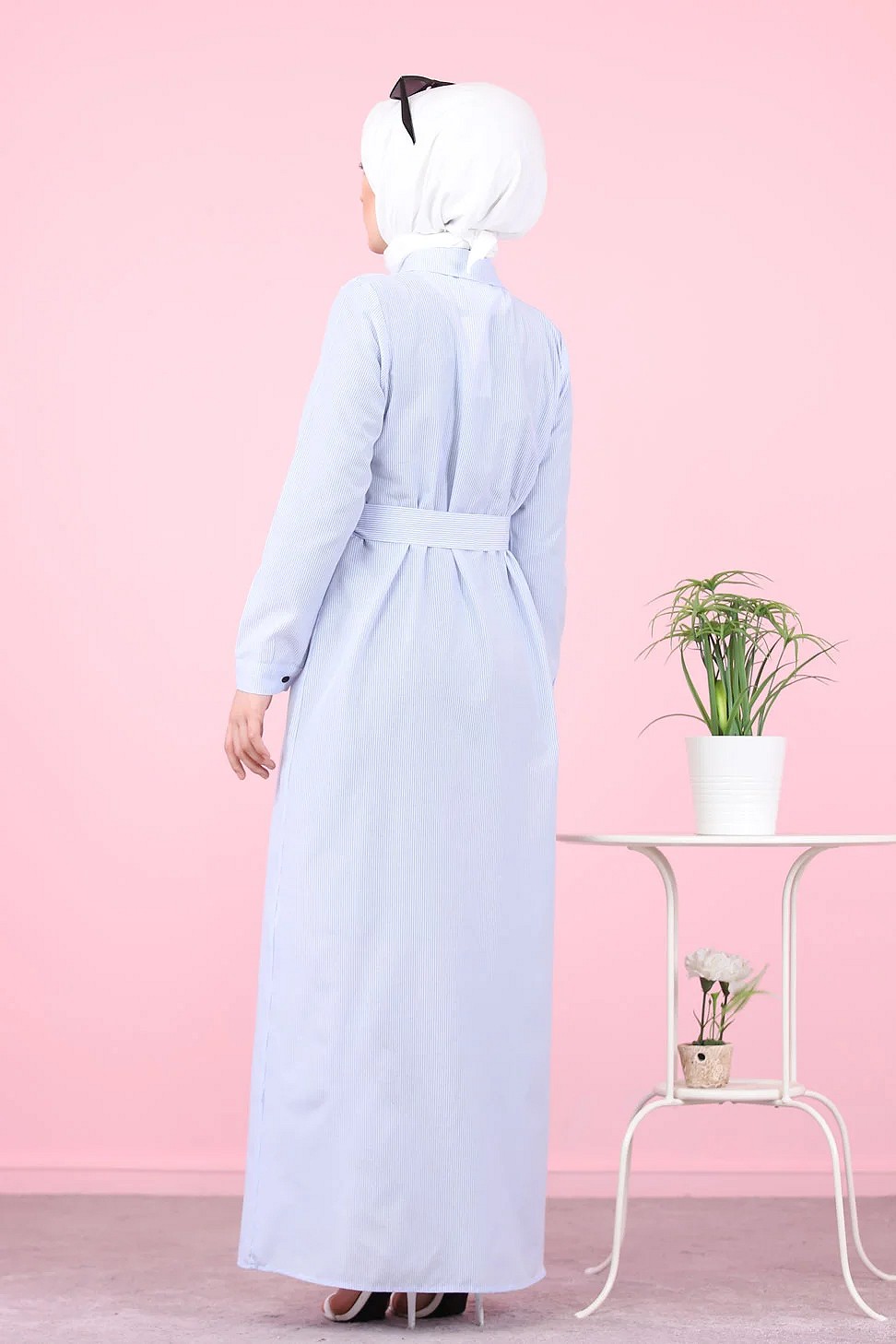Robe chemise longue à rayures bleues avec ceinture (Vetement hijab femme musulmane) Vetement & Accessoire
