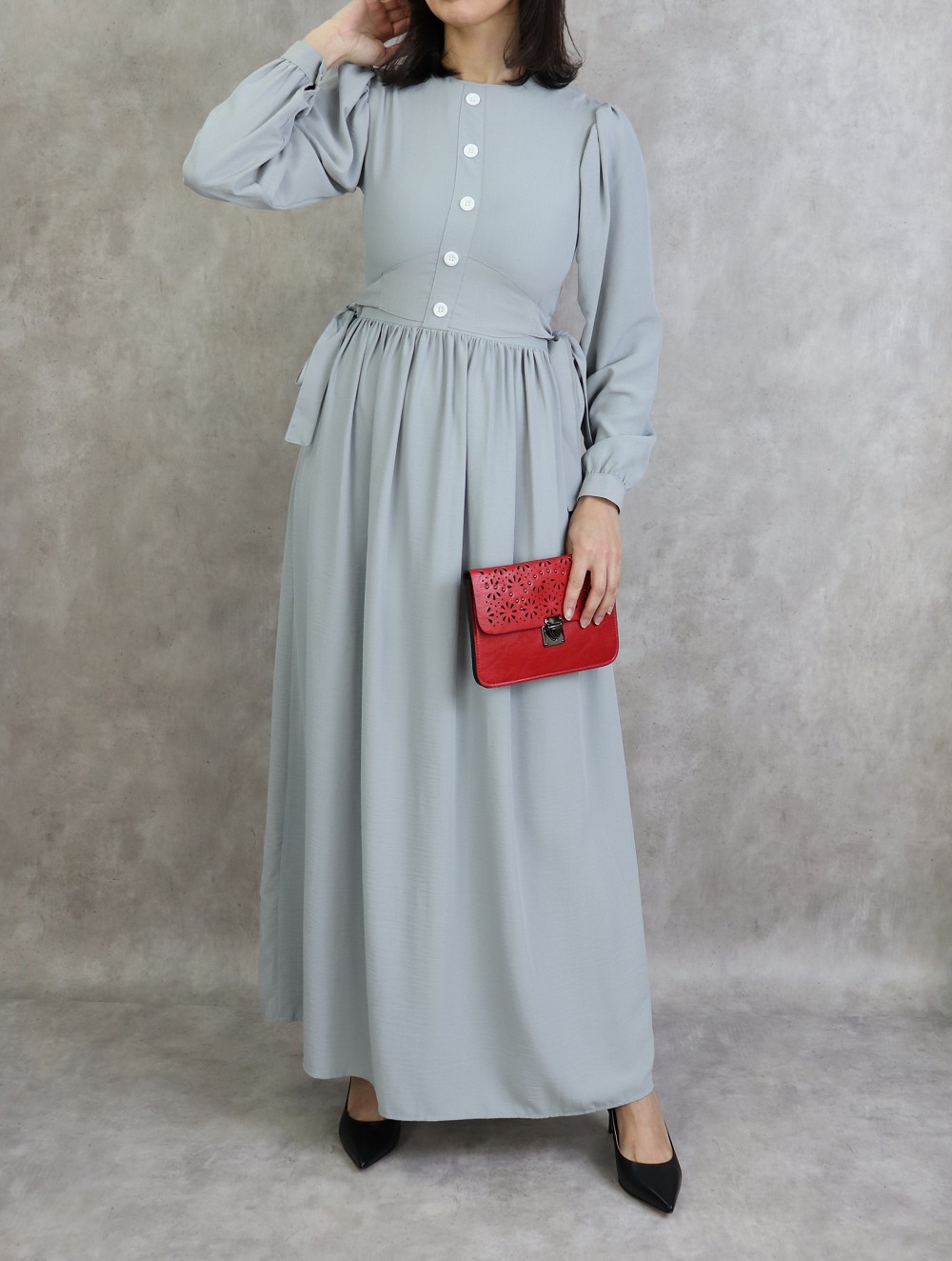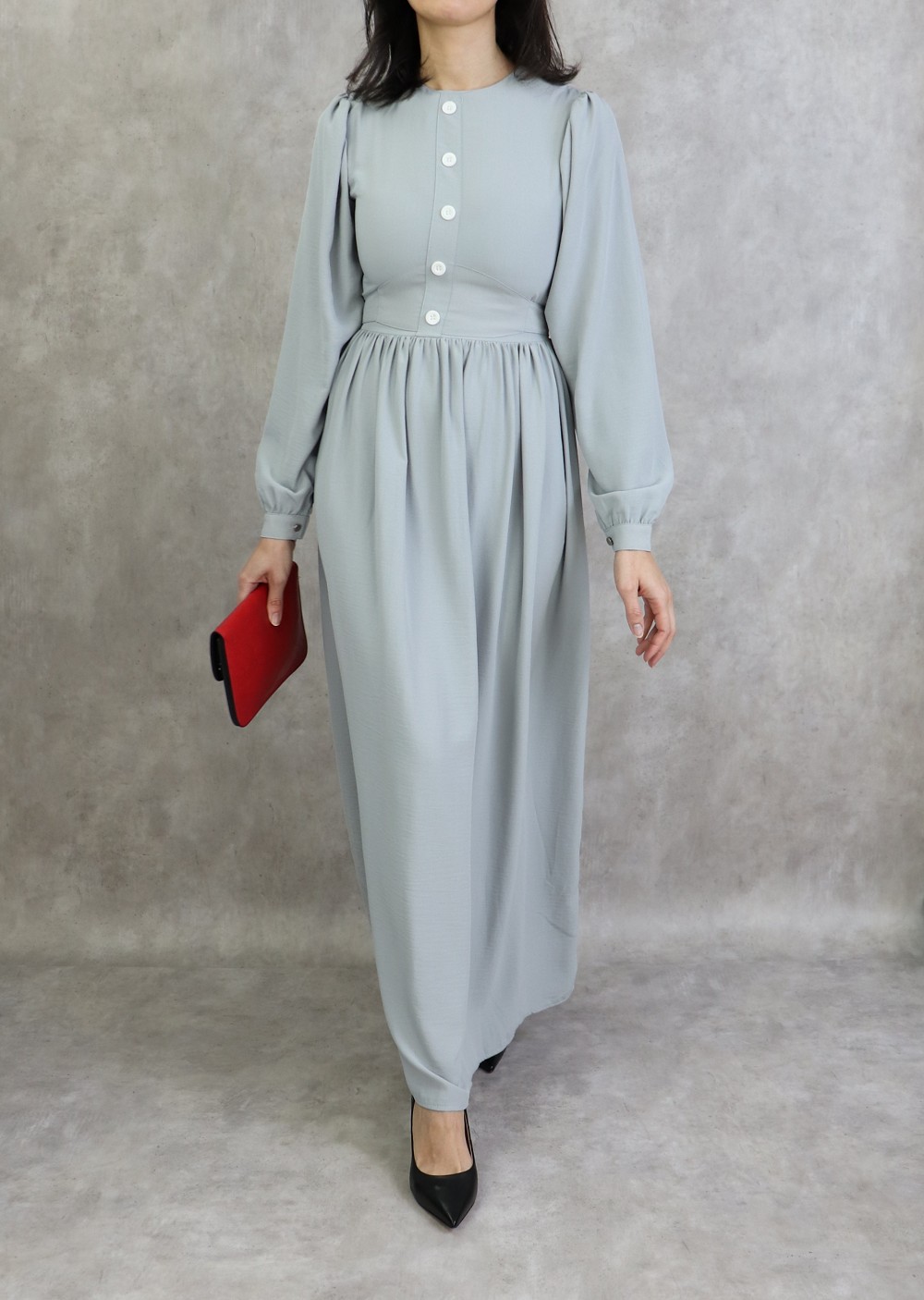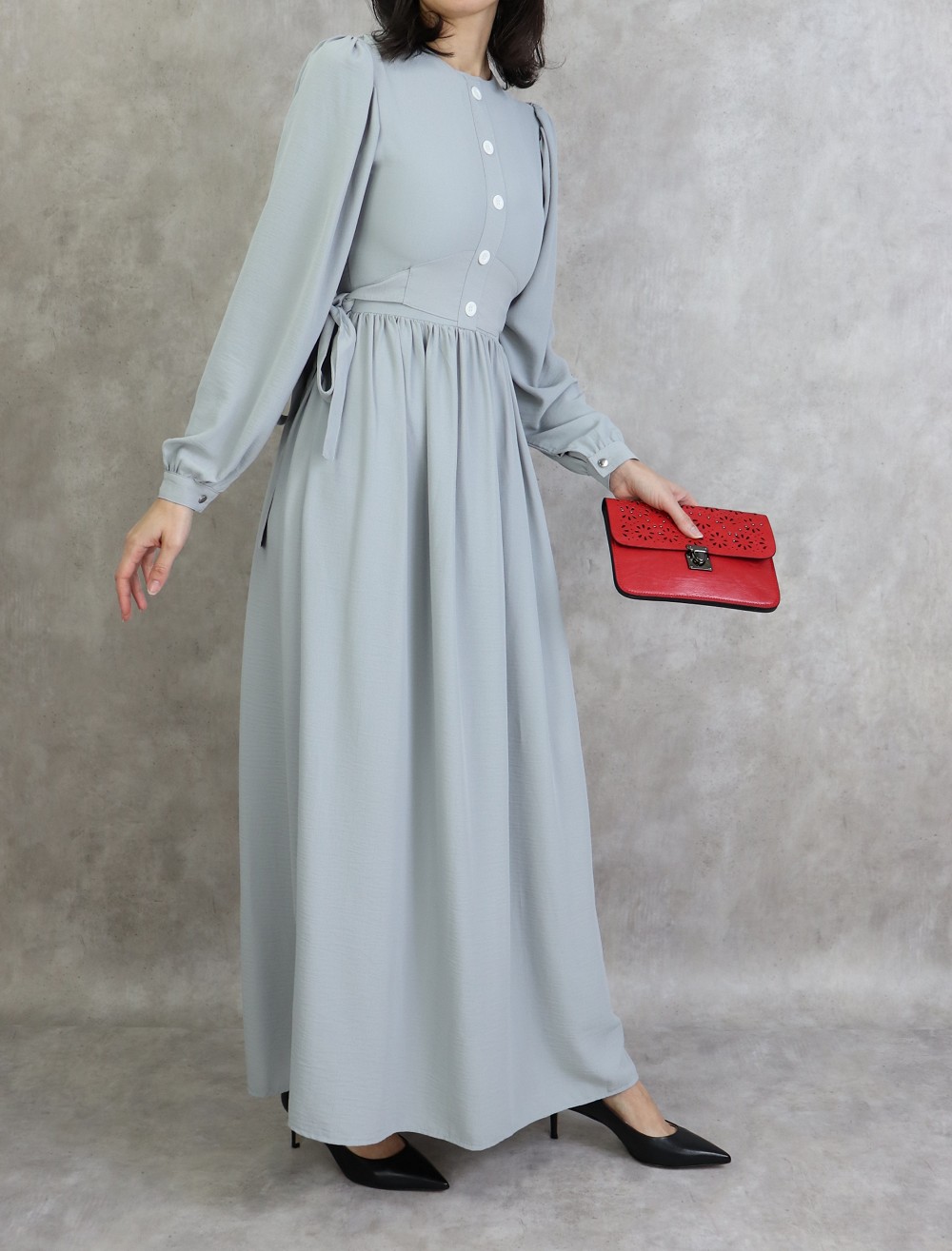 Robe longue, col rond, fermeture éclair dans le dos, manches longues finition bouton aux poignets, taille cintrée et froncée assortie de sa ceinture cousue qui peut s'attacher sur les côté, par derrière ou devant... Décoration boutons sur le buste. Coupe évasée sur le bas, tissu opaque et léger.
