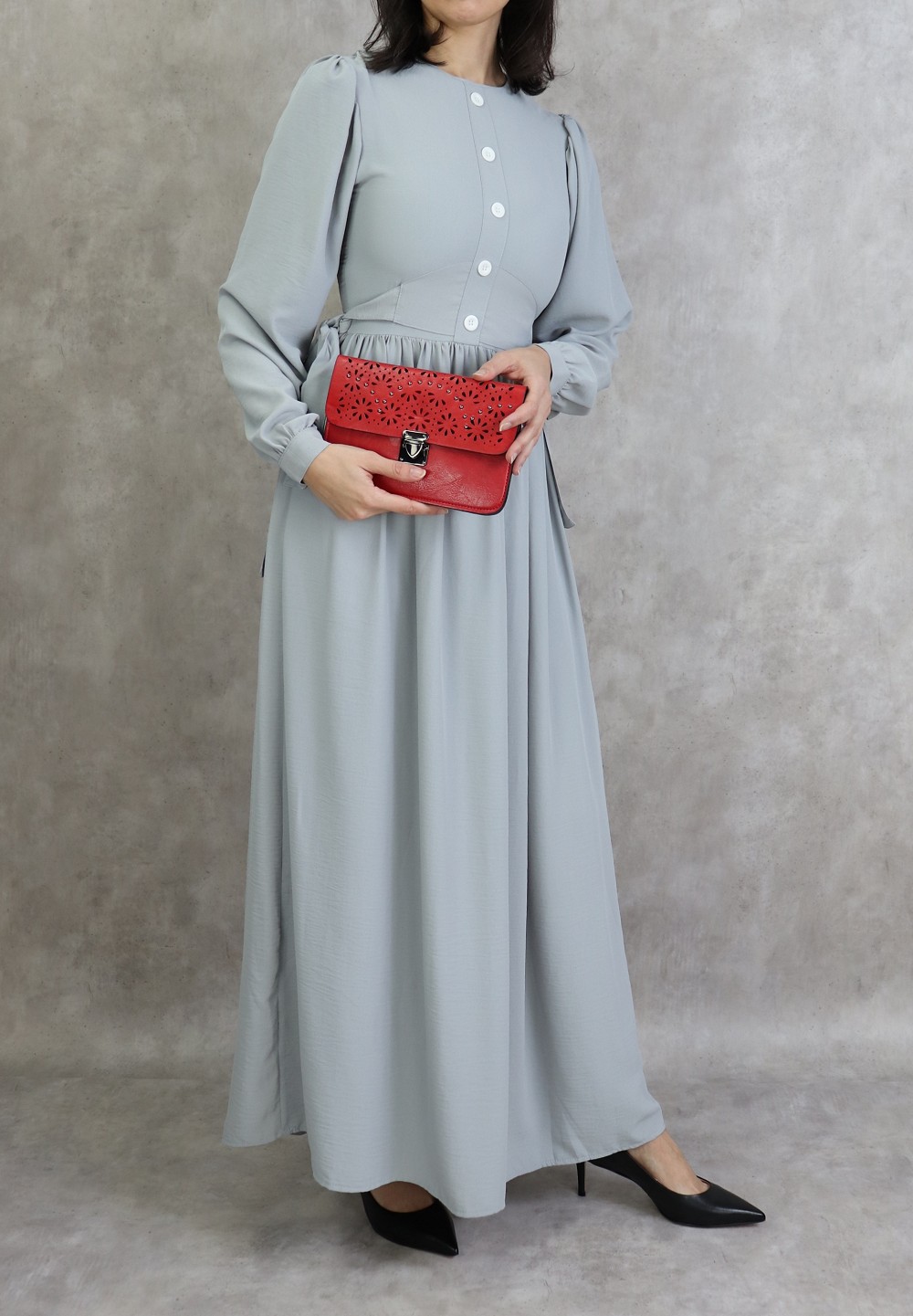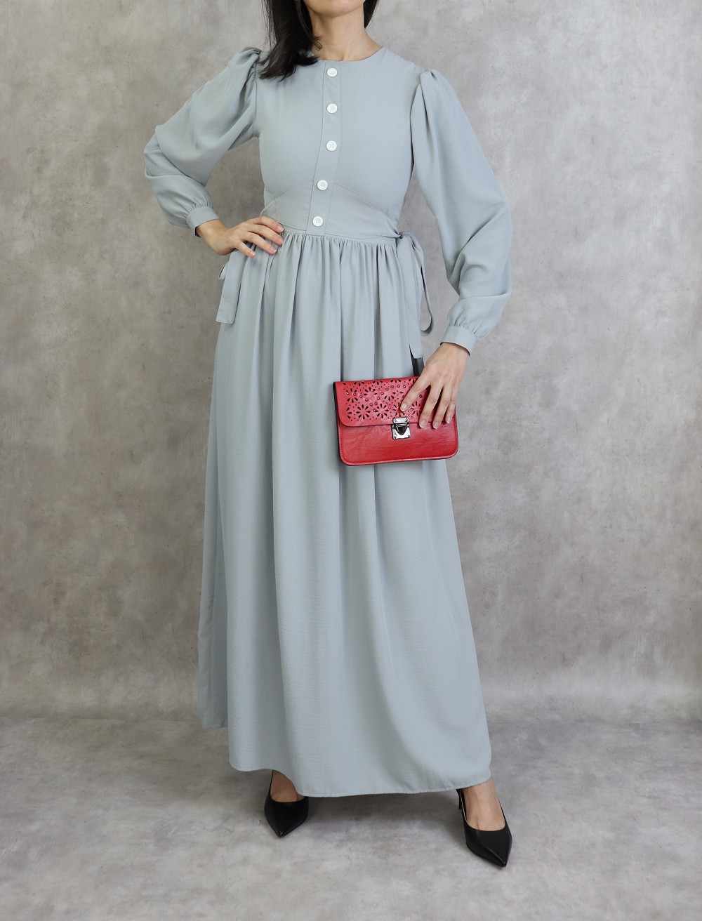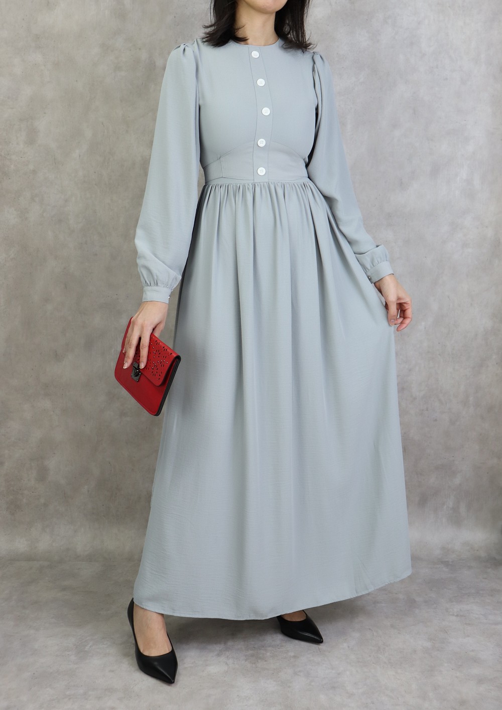 Robe longue, col rond, fermeture éclair dans le dos, manches longues finition bouton aux poignets, taille cintrée et froncée assortie de sa ceinture cousue qui peut s'attacher sur les côté, par derrière ou devant... Décoration boutons sur le buste. Coupe évasée sur le bas, tissu opaque et léger.