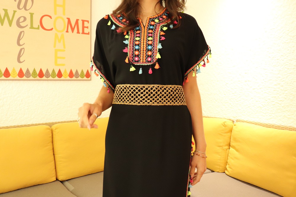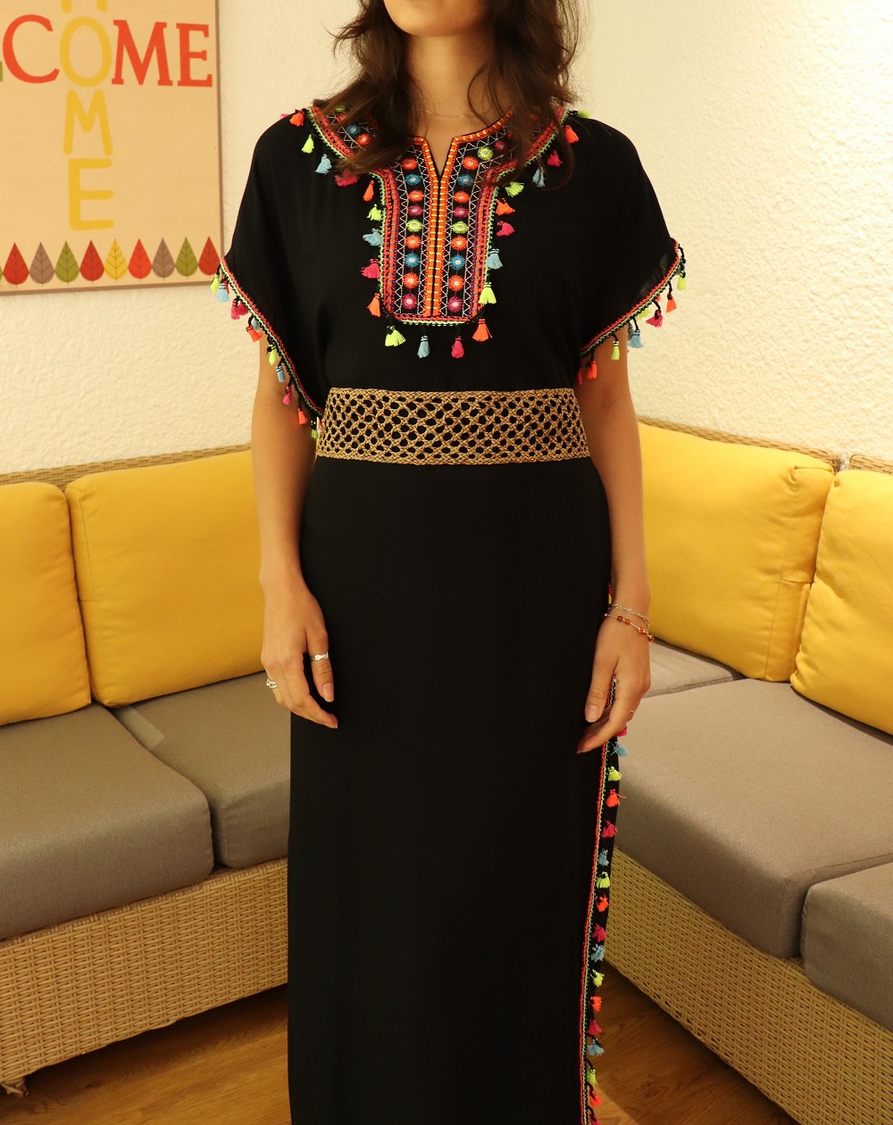 Ceinture large à motifs croisés, fermeture à l'aide de 2 liens tressés.