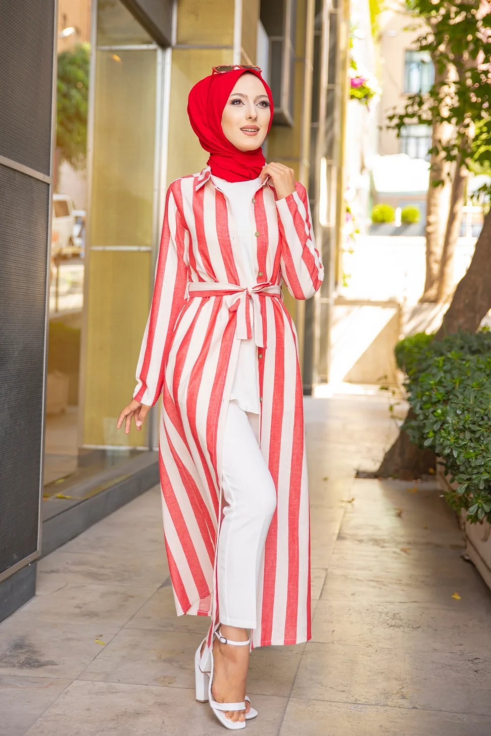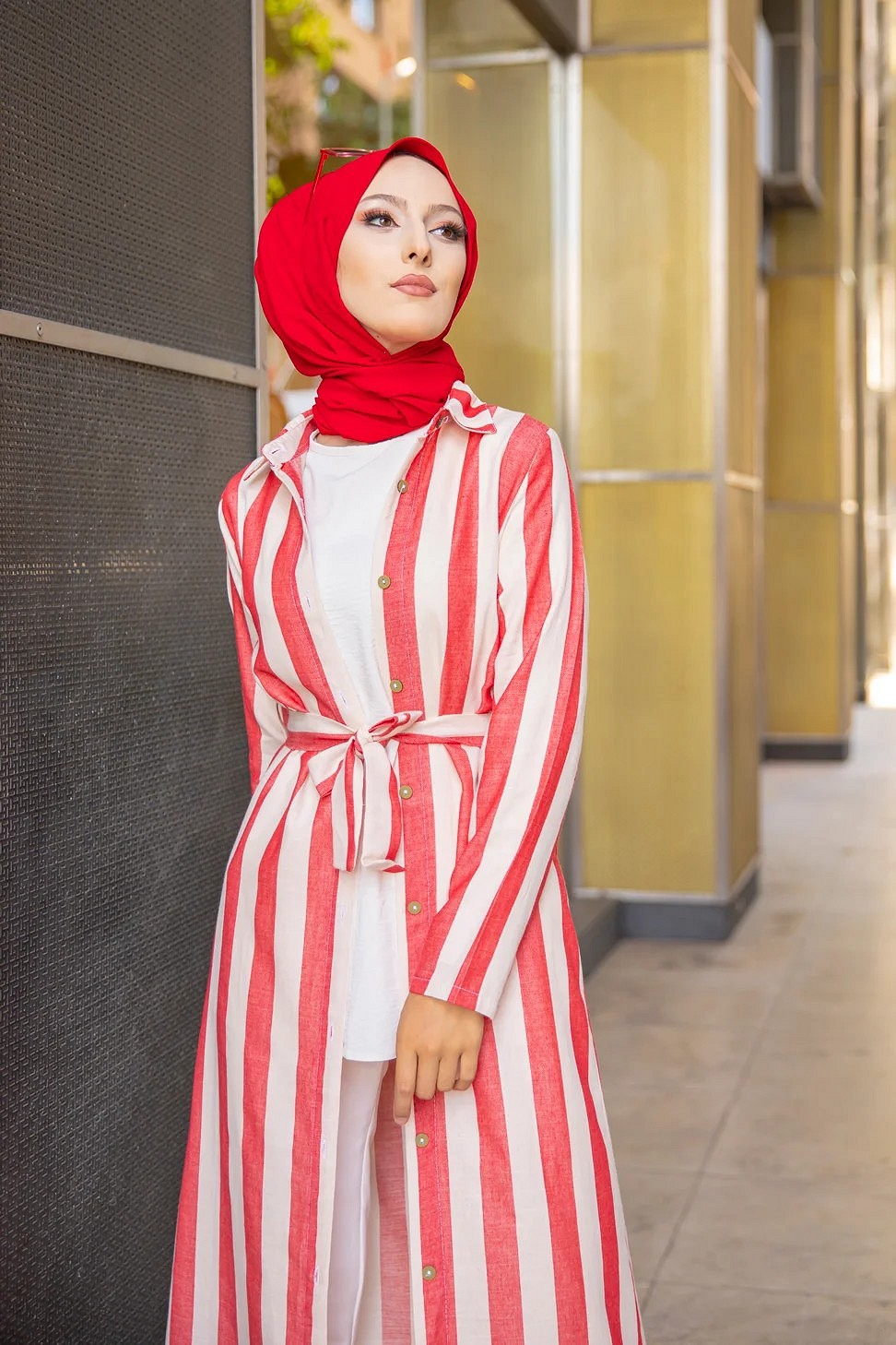 Robe à rayure boutonnée (ouverte) sur toute la longueur avec ceinture assortie pour femme (Vetement hijab été) - Couleur Crème et rouge Vetement & Accessoire