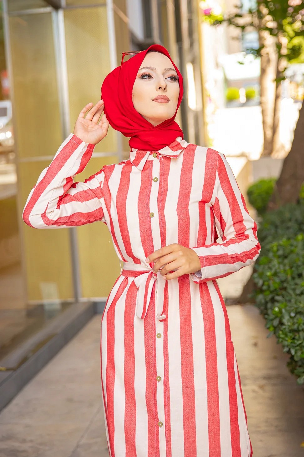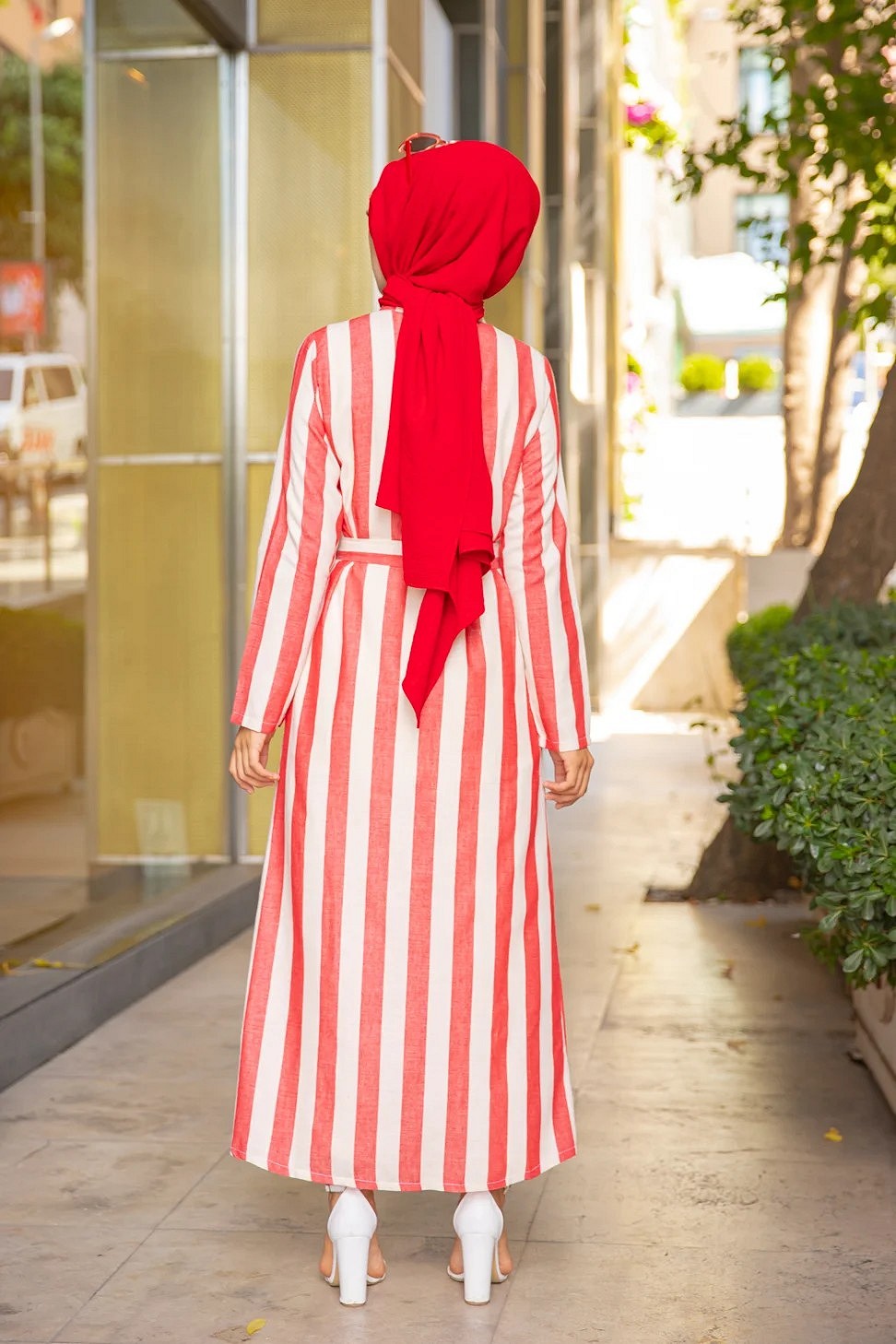 Robe a rayure boutonnee (ouverte) sur toute la longueur avec ceinture assortie pour femme (Vetement hijab ete) - Couleur Creme et rouge