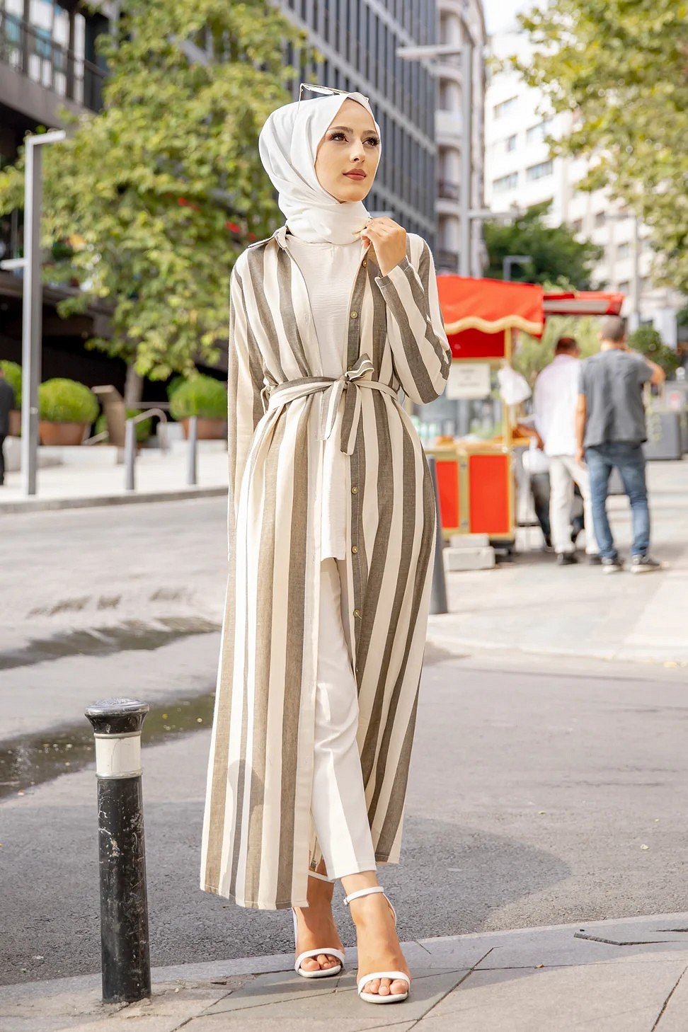 Robe a rayures boutonnee (ouverte) avec ceinture assortie (Vetement hijab ete femme musulmane) - Couleur creme et kaki