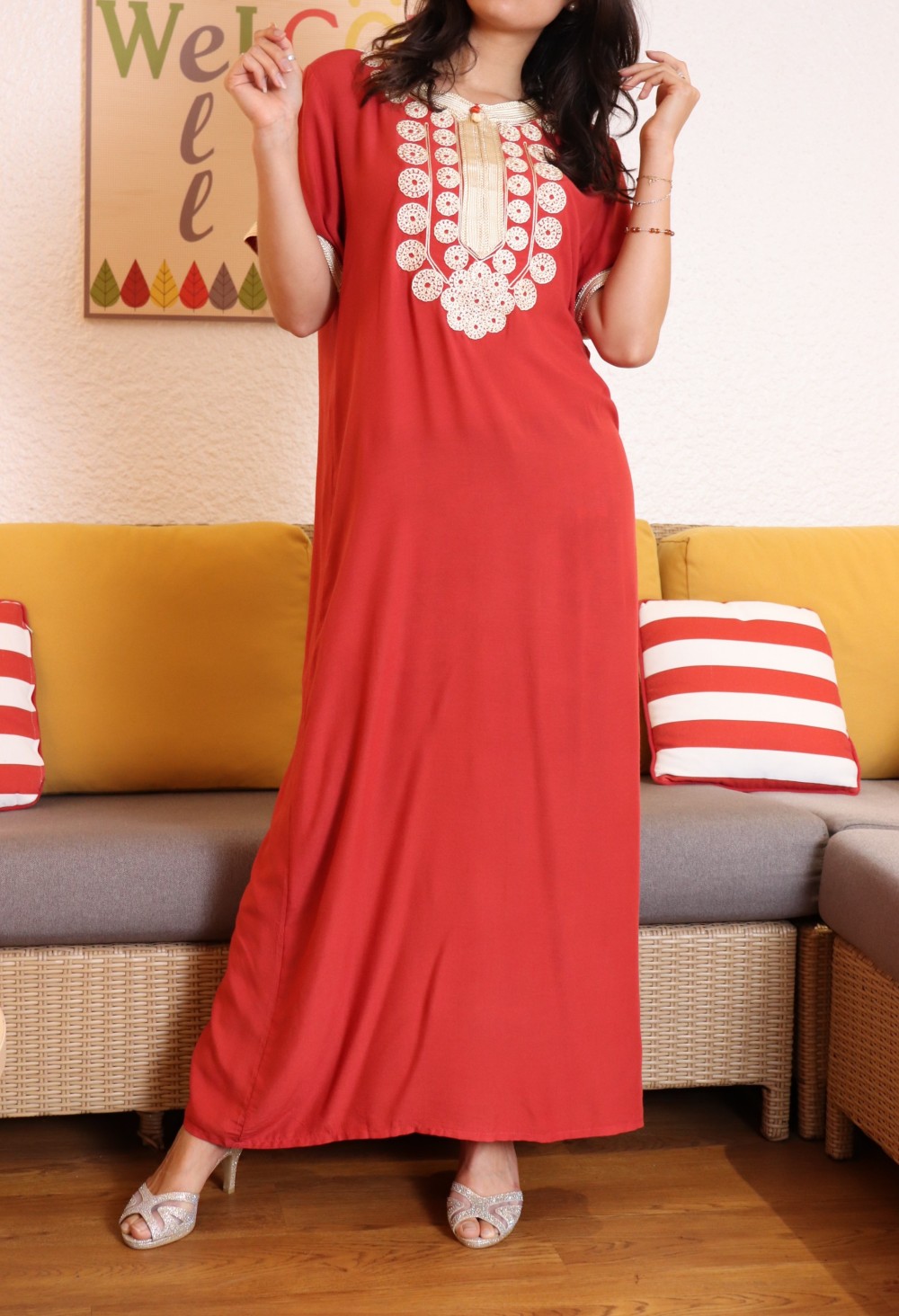 Robe orientale longue brodée décorée de strass et perle pour femme - Couleur Rouge coquelicot - REF. 30943 (26.00 €)