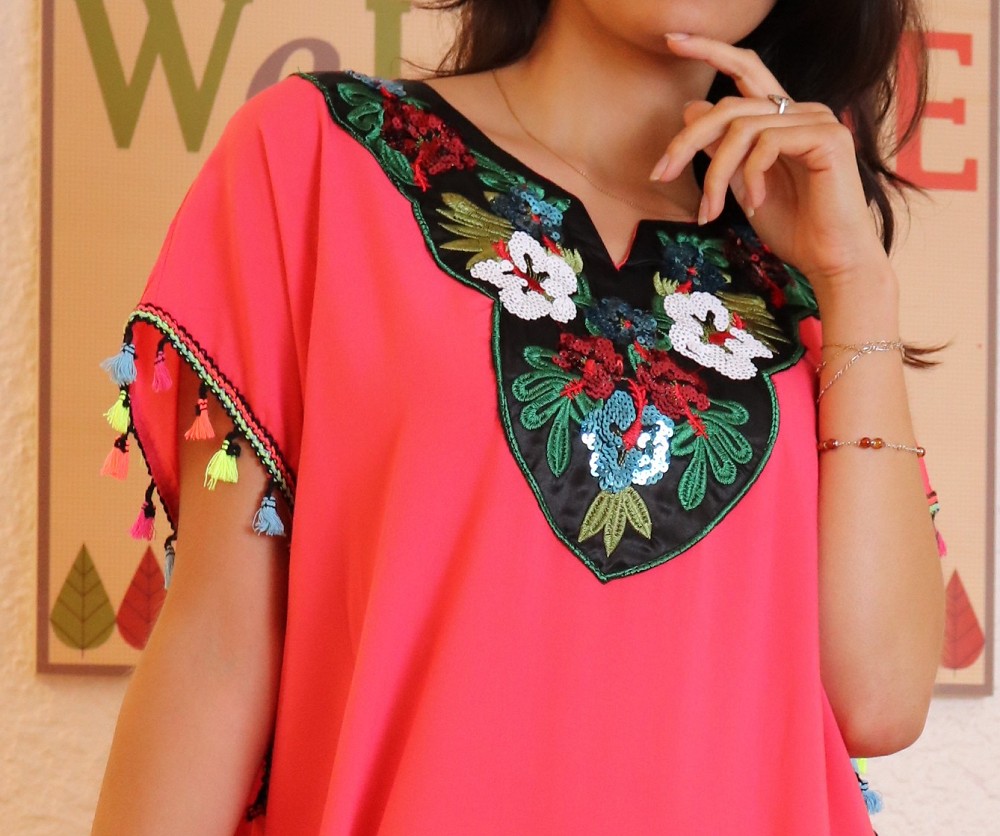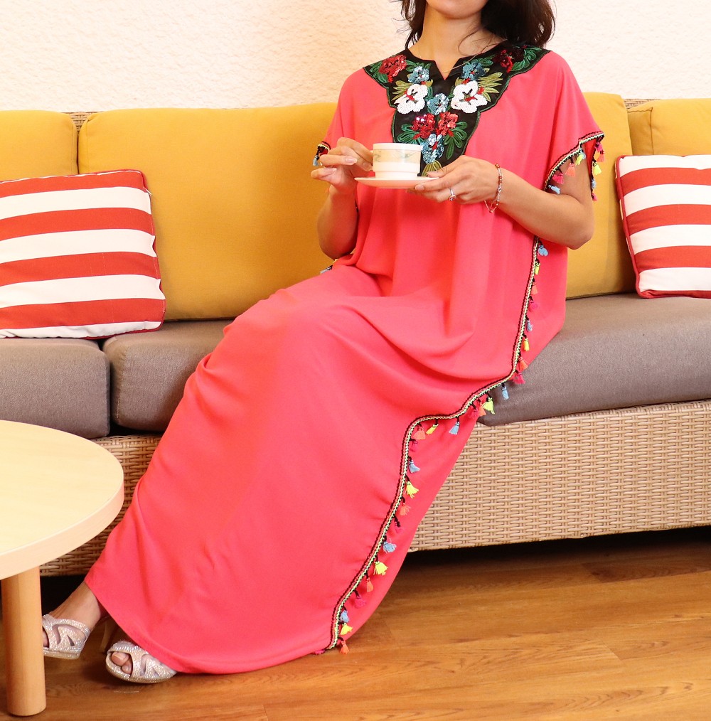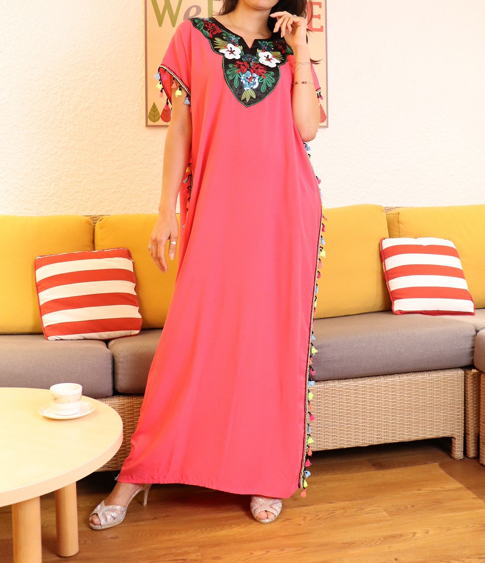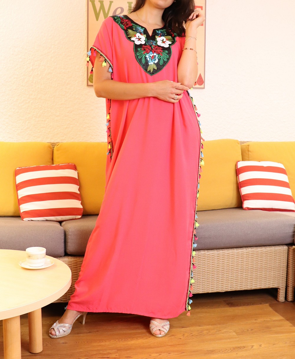 Cette belle robe longue, manches courtes, coupe droite, ornée avec de jolis strass et motifs fleuris. Décorée sur les côtés avec des pompons multi couleurs.