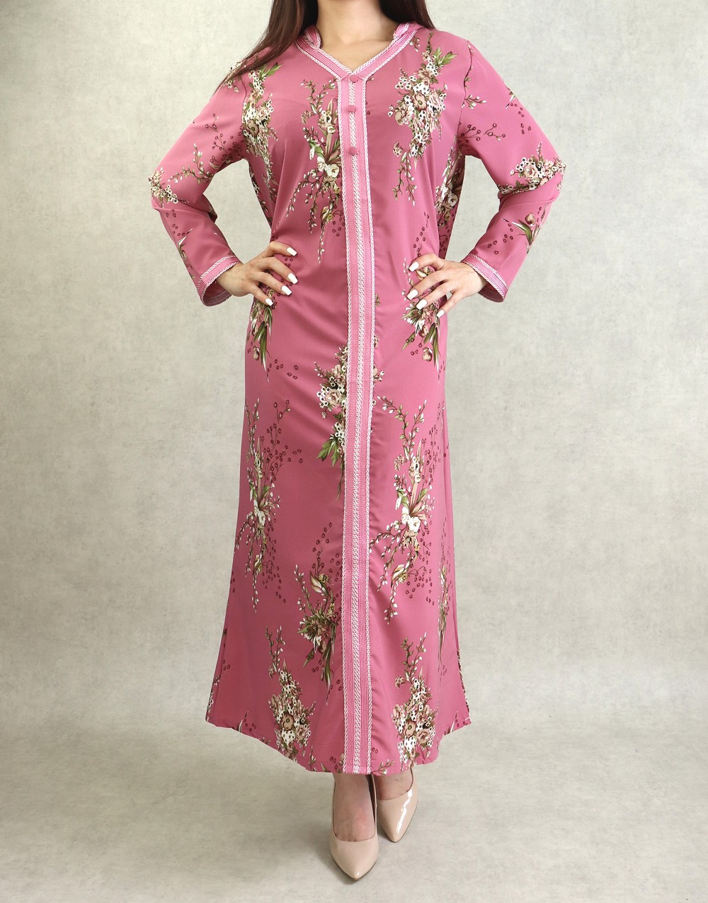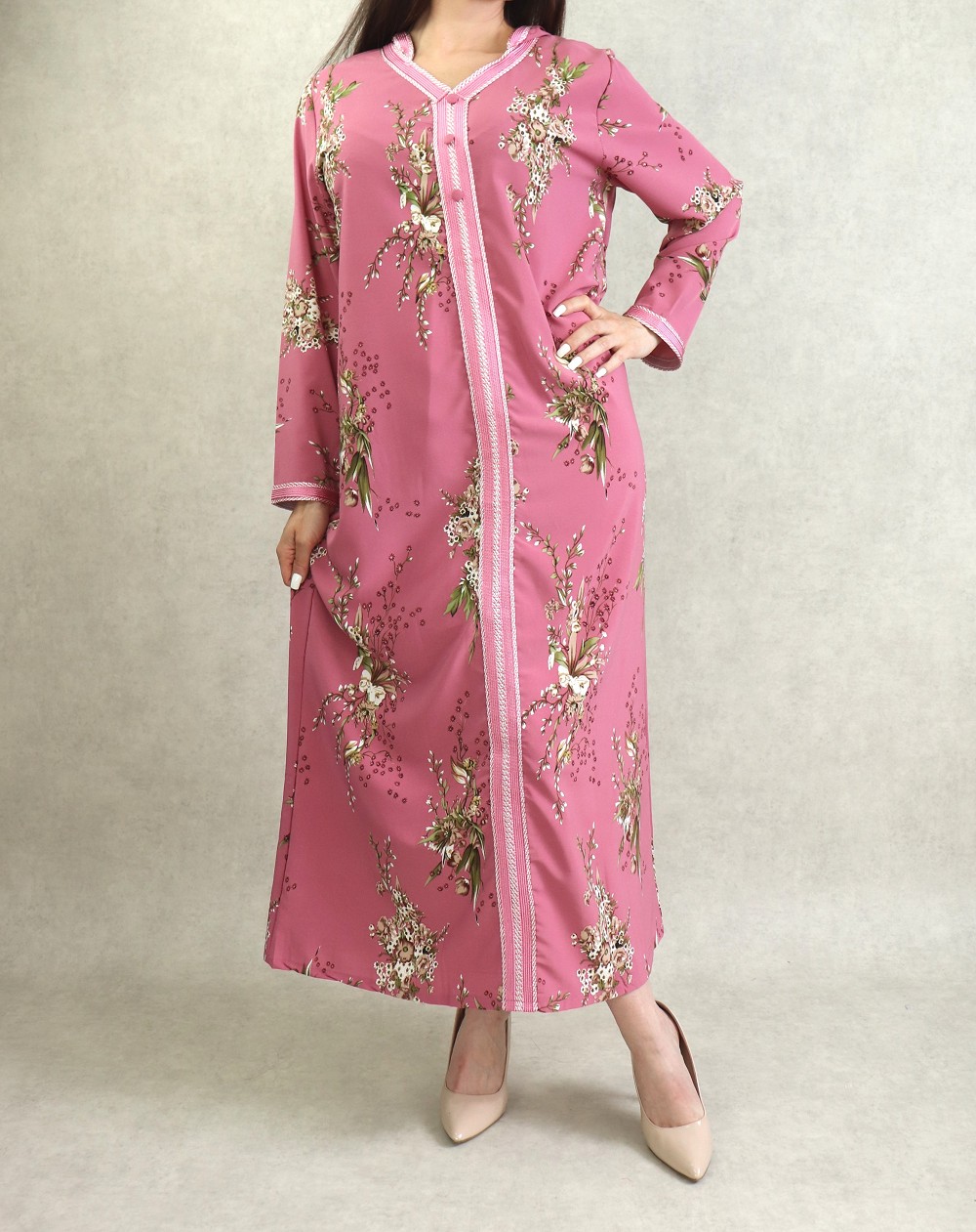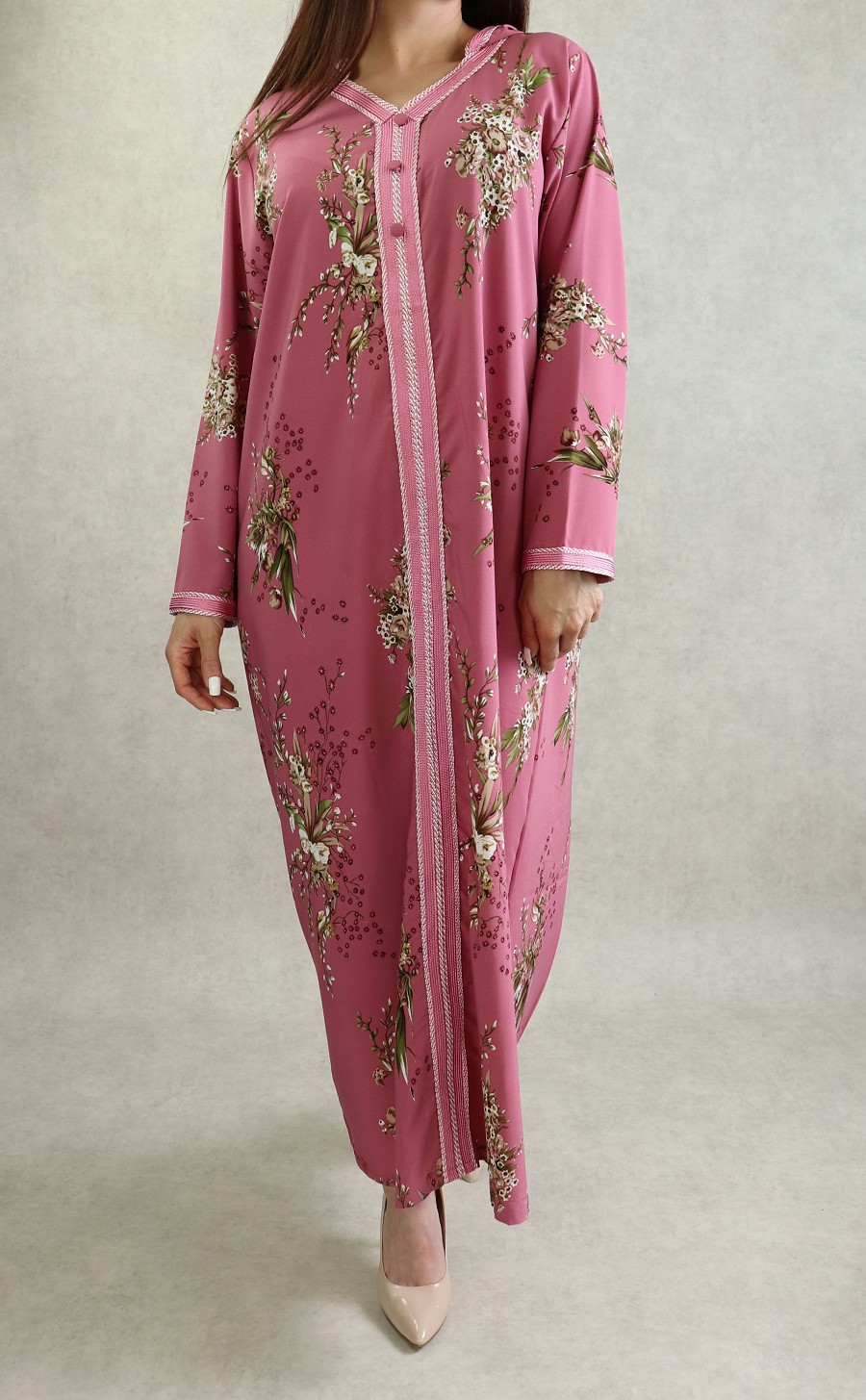 Robe fluide style djellaba marocaine à fleurs avec capuche sur un fond Vieux rose pour femme Vetement & Accessoire