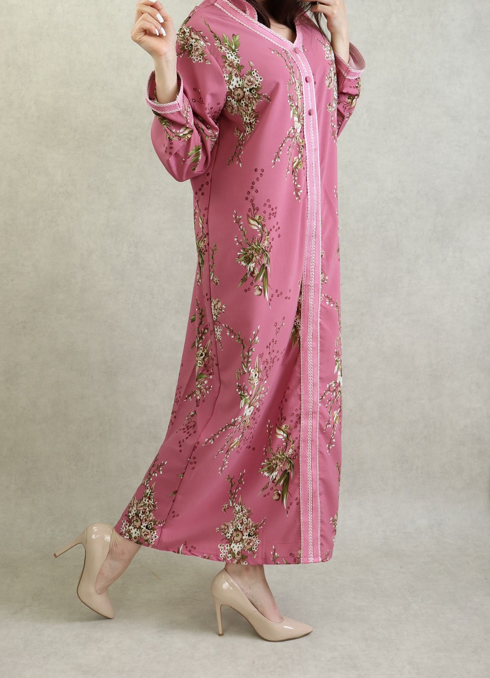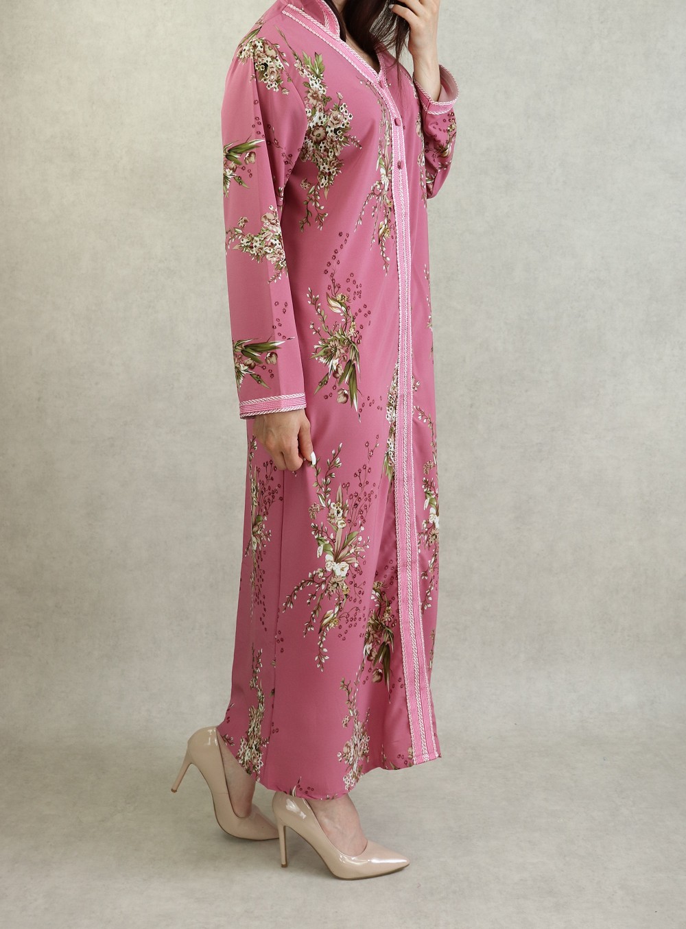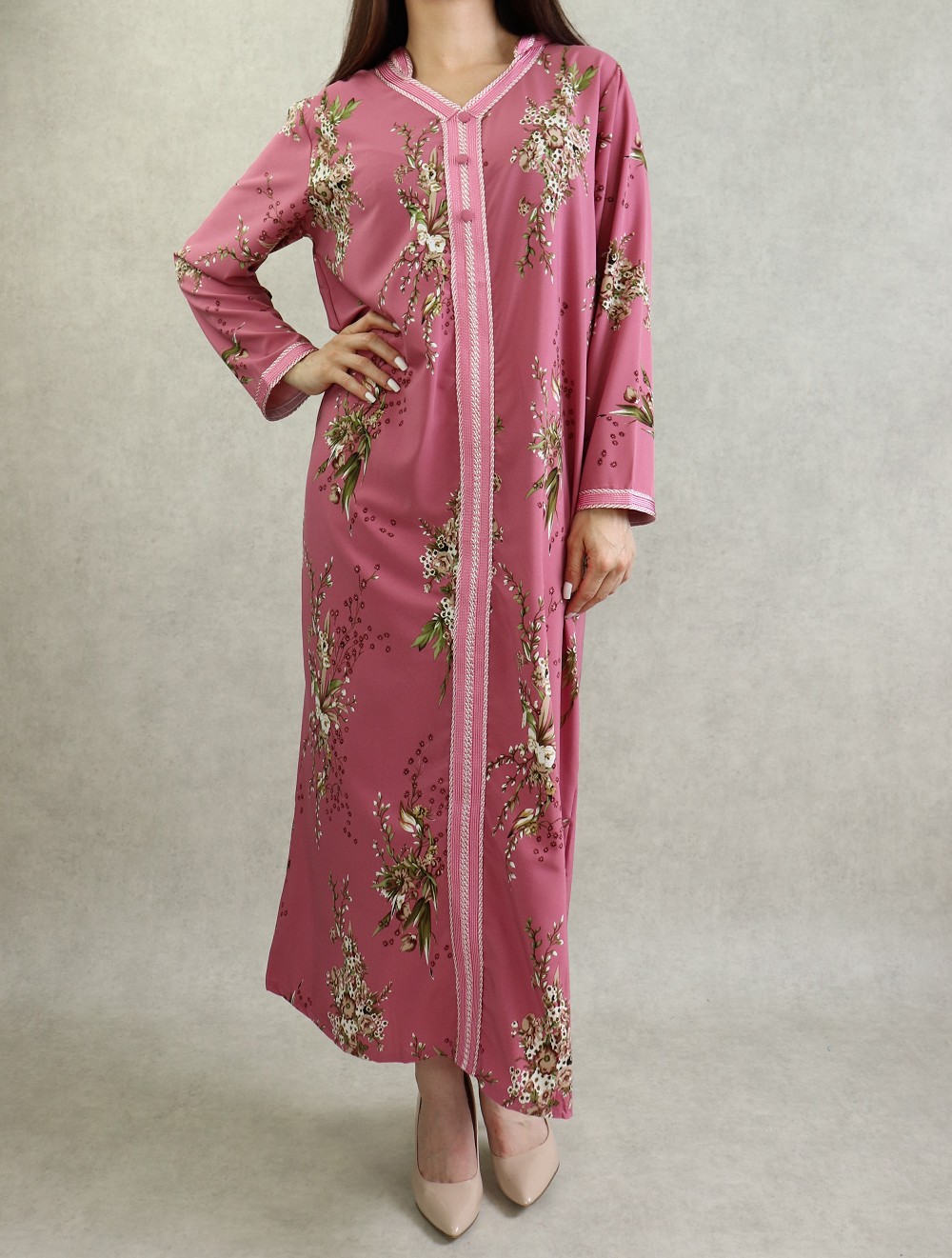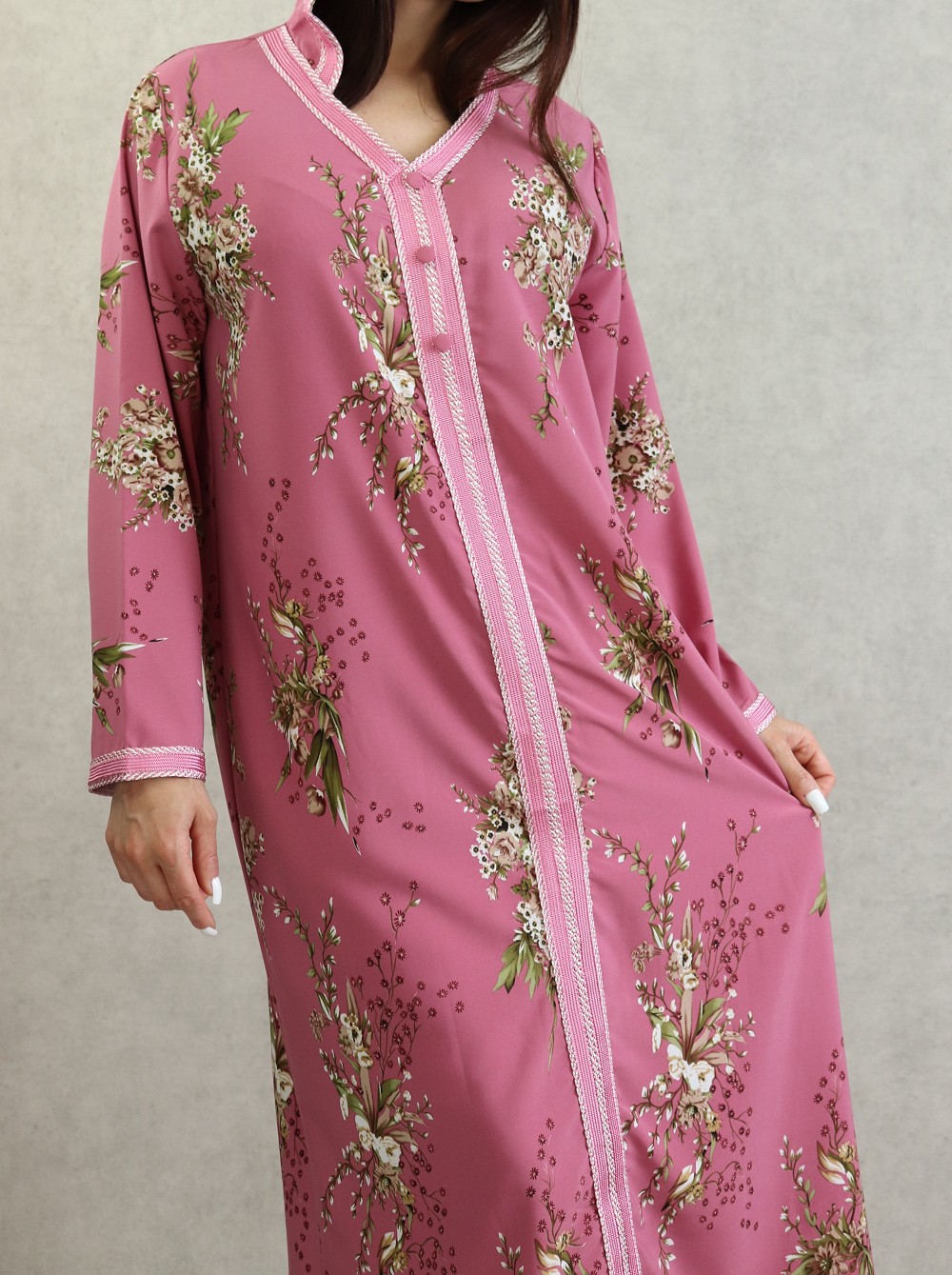 Robe fluide style djellaba marocaine à fleurs avec capuche sur un fond Vieux rose pour femme Vetement & Accessoire