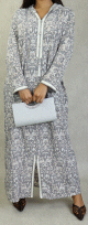 Très jolie robe style djellaba décorée de motifs à fleurs sur fond blanc cassé, avec sa capuche.