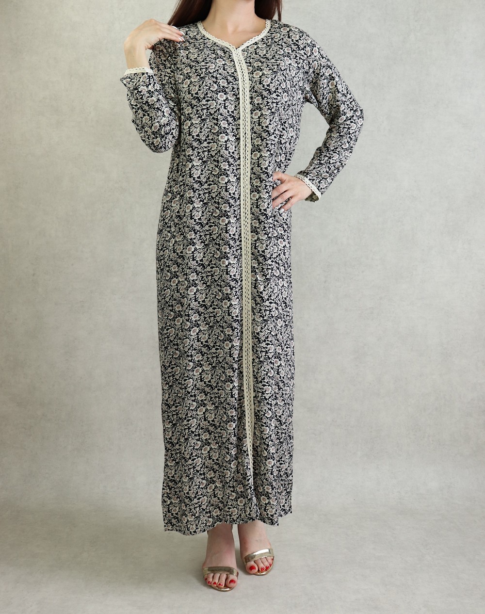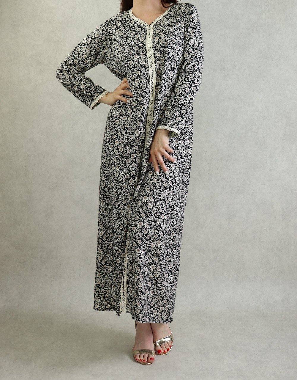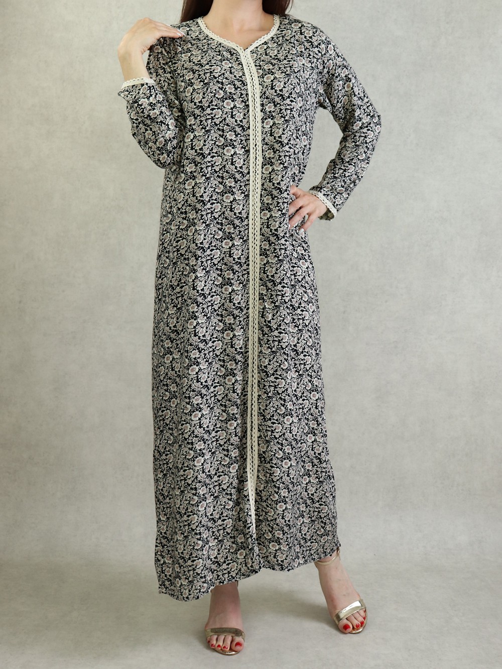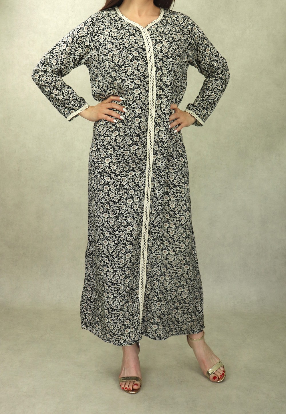 Robe longue, tissu léger de type soie (rayonne), imprimé floral, Col en V, manches longues. Ce modèle est décorée d'une fine broderie sur toute la longueur ainsi que sur les manches.