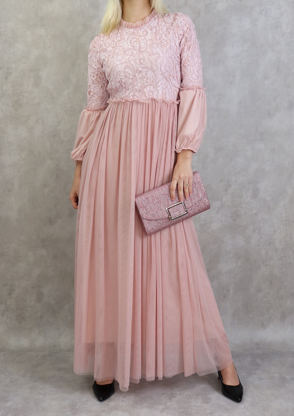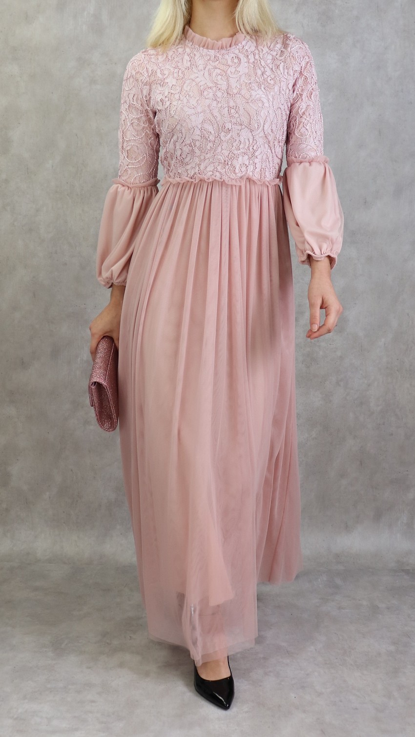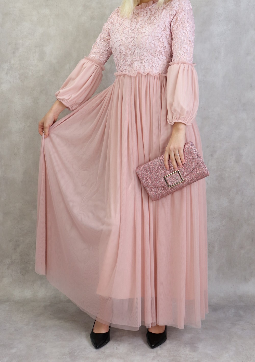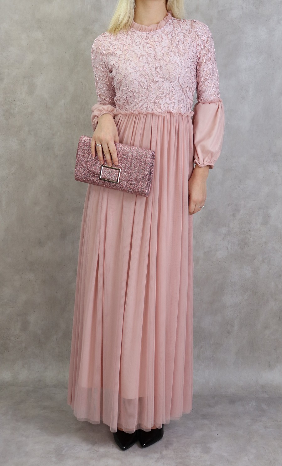 Robe de soirée en tulle et dentelle brodée longue pour femme - Couleur blanche rose poudré Vetement & Accessoire