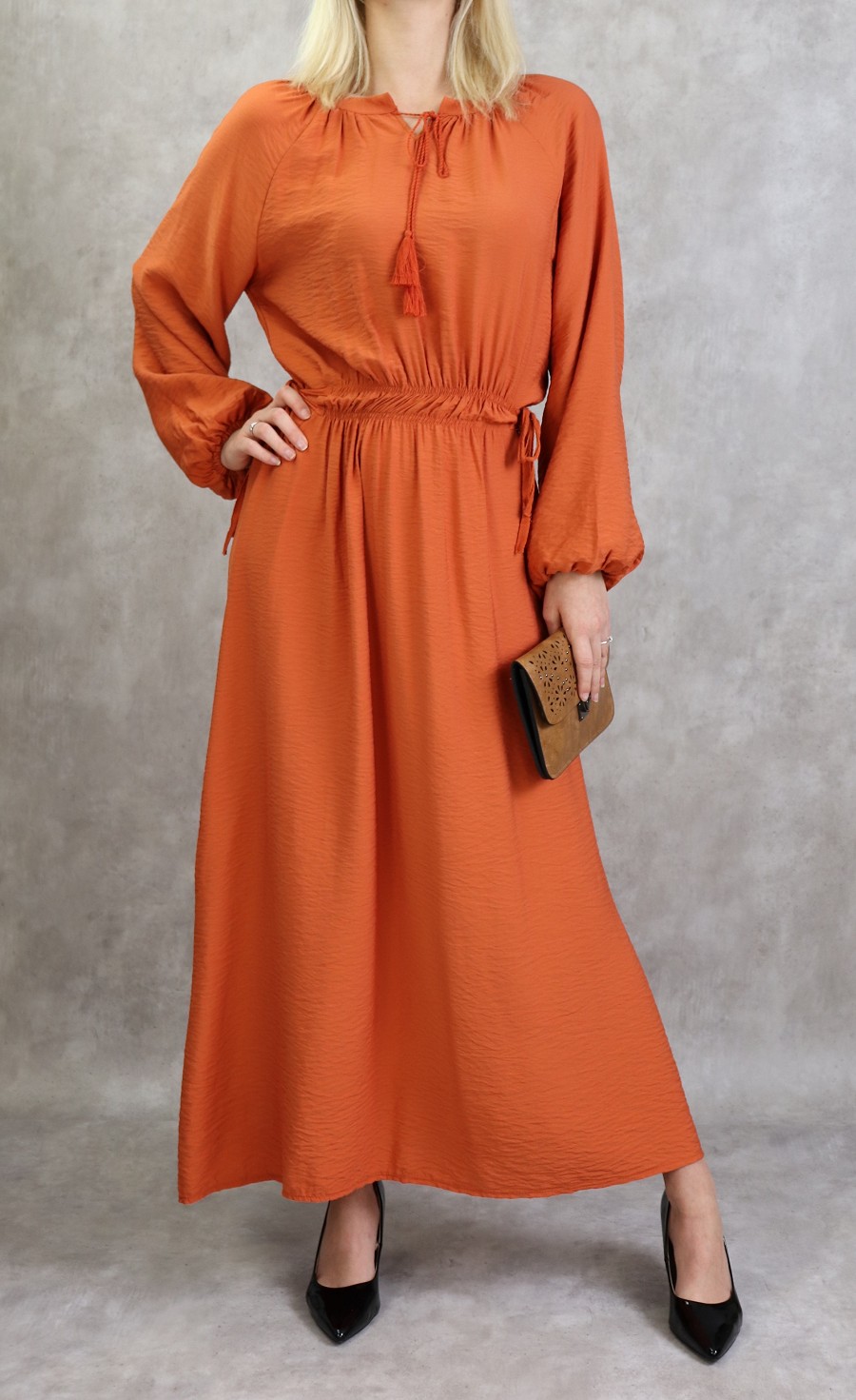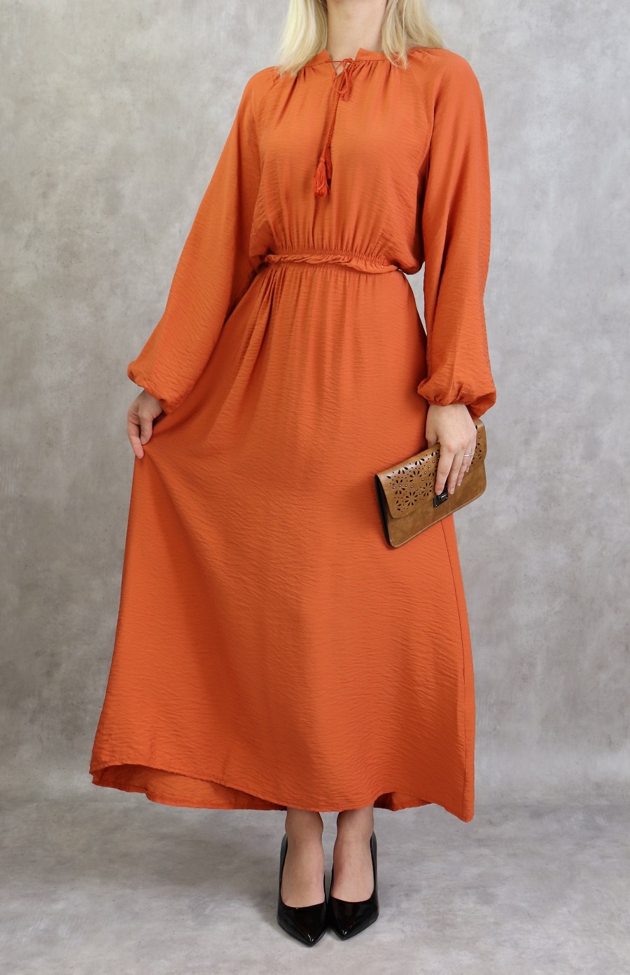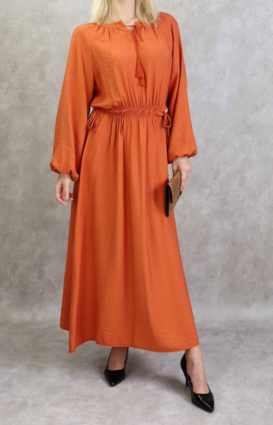 Robe longue, col semi ouvert, fermeture cordons avec pompons, manches finition élastiques, taille cintrée et élastique munie de liens de décorations, tissu fluide, léger et opaque.