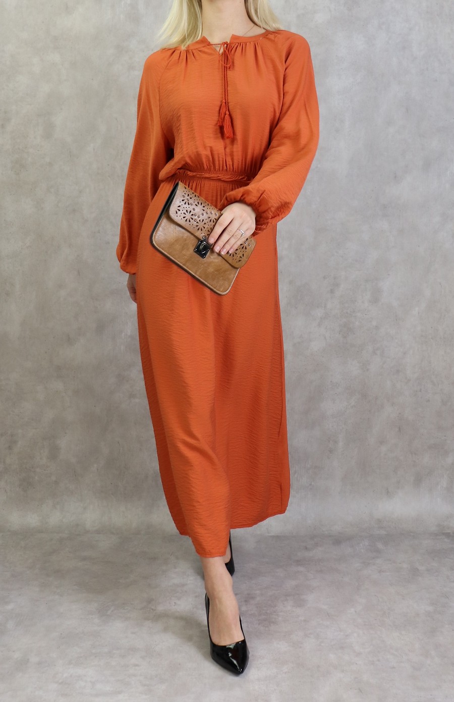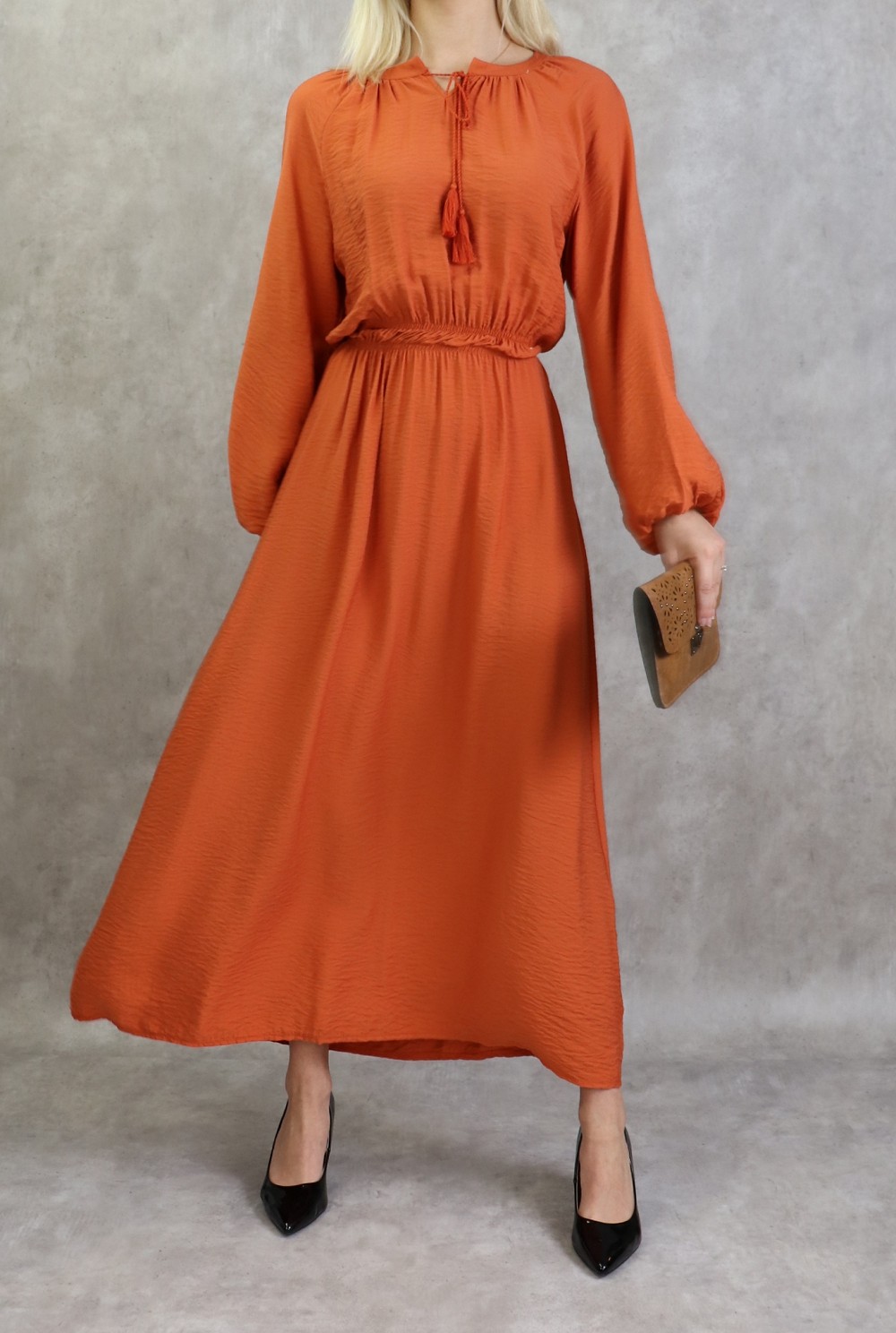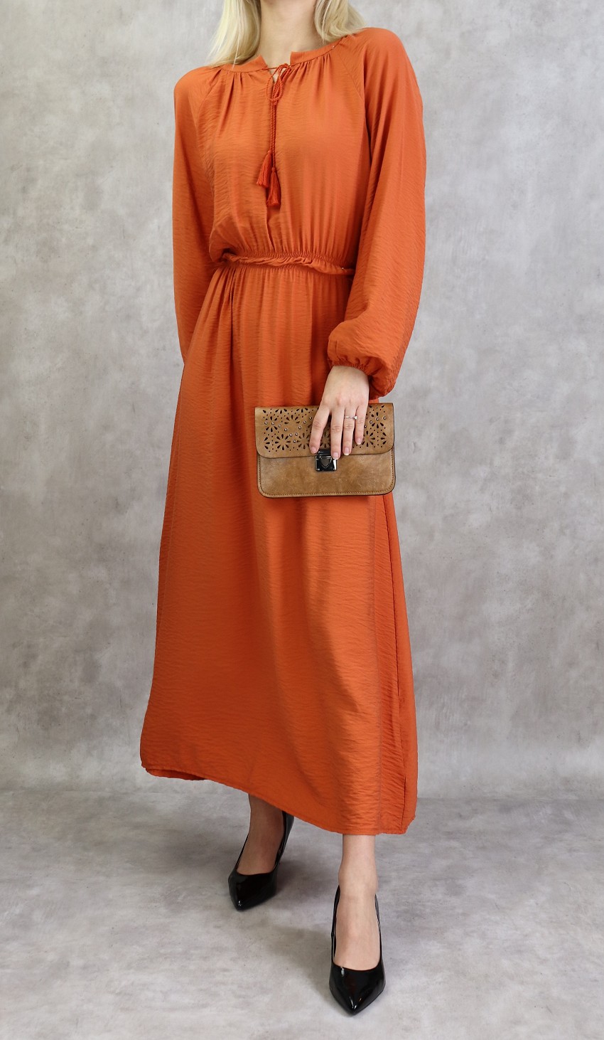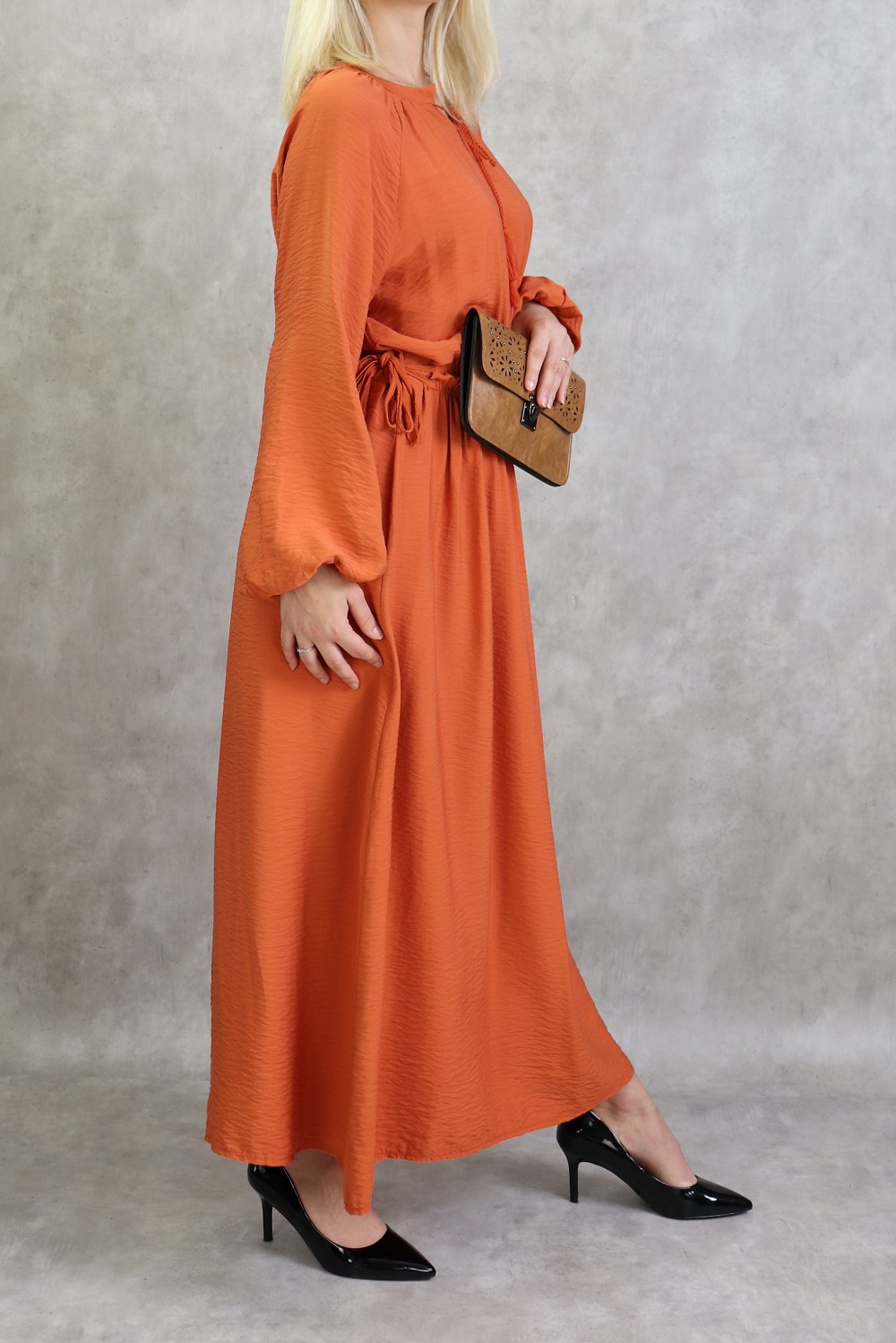 Robe longue, col semi ouvert, fermeture cordons avec pompons, manches finition élastiques, taille cintrée et élastique munie de liens de décorations, tissu fluide, léger et opaque.
