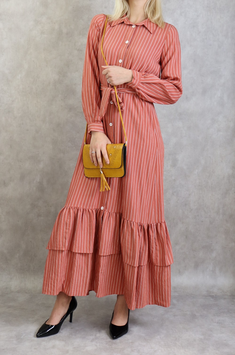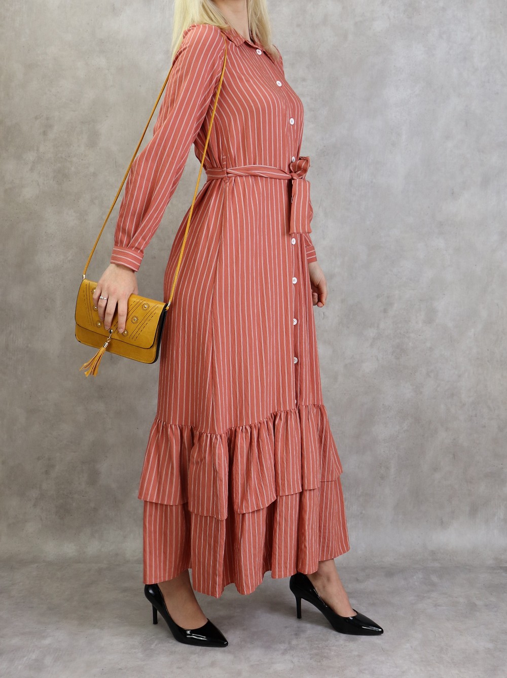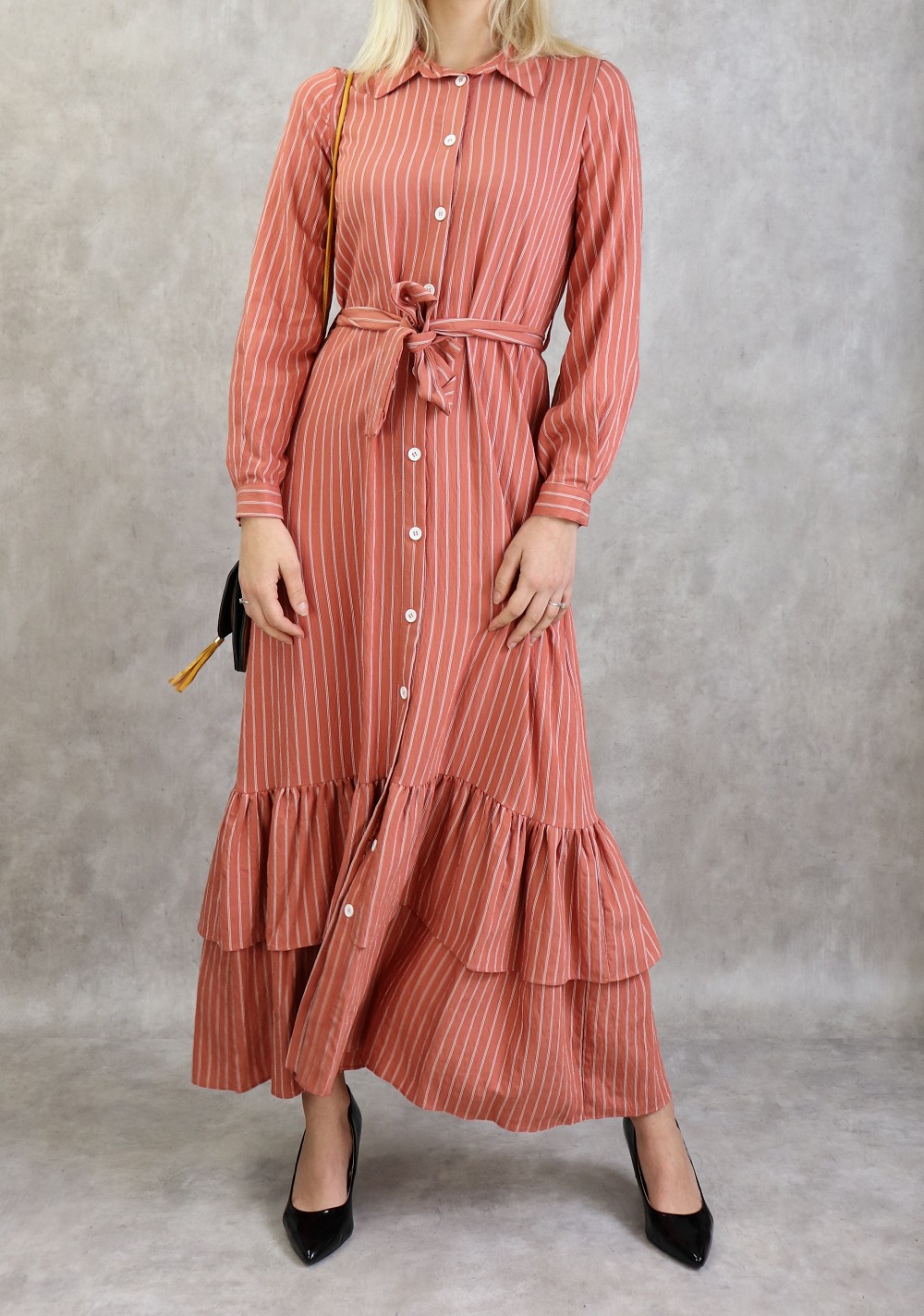 Robe longue, col chemise, fermeture boutons sur toute la longueur, manches finition bouton sur les poignets, ceinture à passants assortie, 2 volants sur la bas. Coupe légèrement évasée, tissu fluide et opaque.