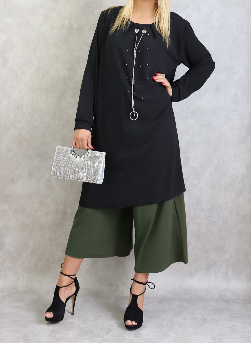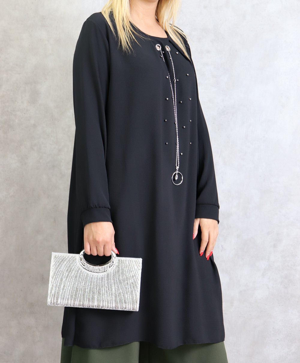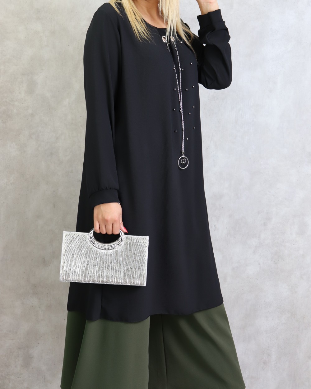 Tunique longue ornee de perles et d'une chaine avec bijoux pendentif - Couleur Noire