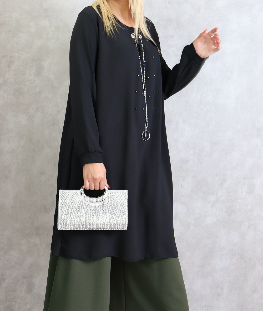 Tunique longue coupe évasée, tissu crêpe fluide, col rond, manches longues, est ornée de perles à l'avant et le tout accompagné d'un collier argenté avec un bijoux en pendentif, cette pièce sort du lot et se démarque des autres tuniques. Vous pouvez la porter avec tous types de bas.