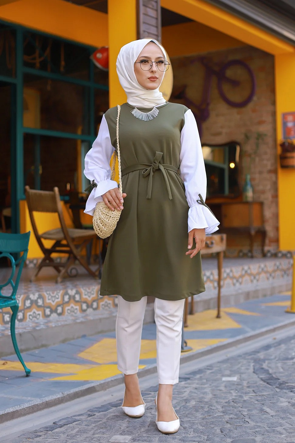 Tunique à volants (Vetement pudique pour femme musulmane) - Couleur kaki et blanc Vetement & Accessoire