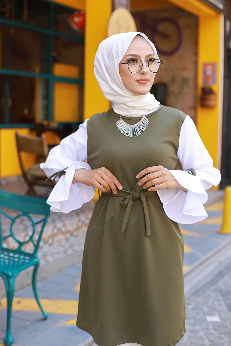 Tunique a volants (Vetement pudique pour femme musulmane) - Couleur kaki et blanc