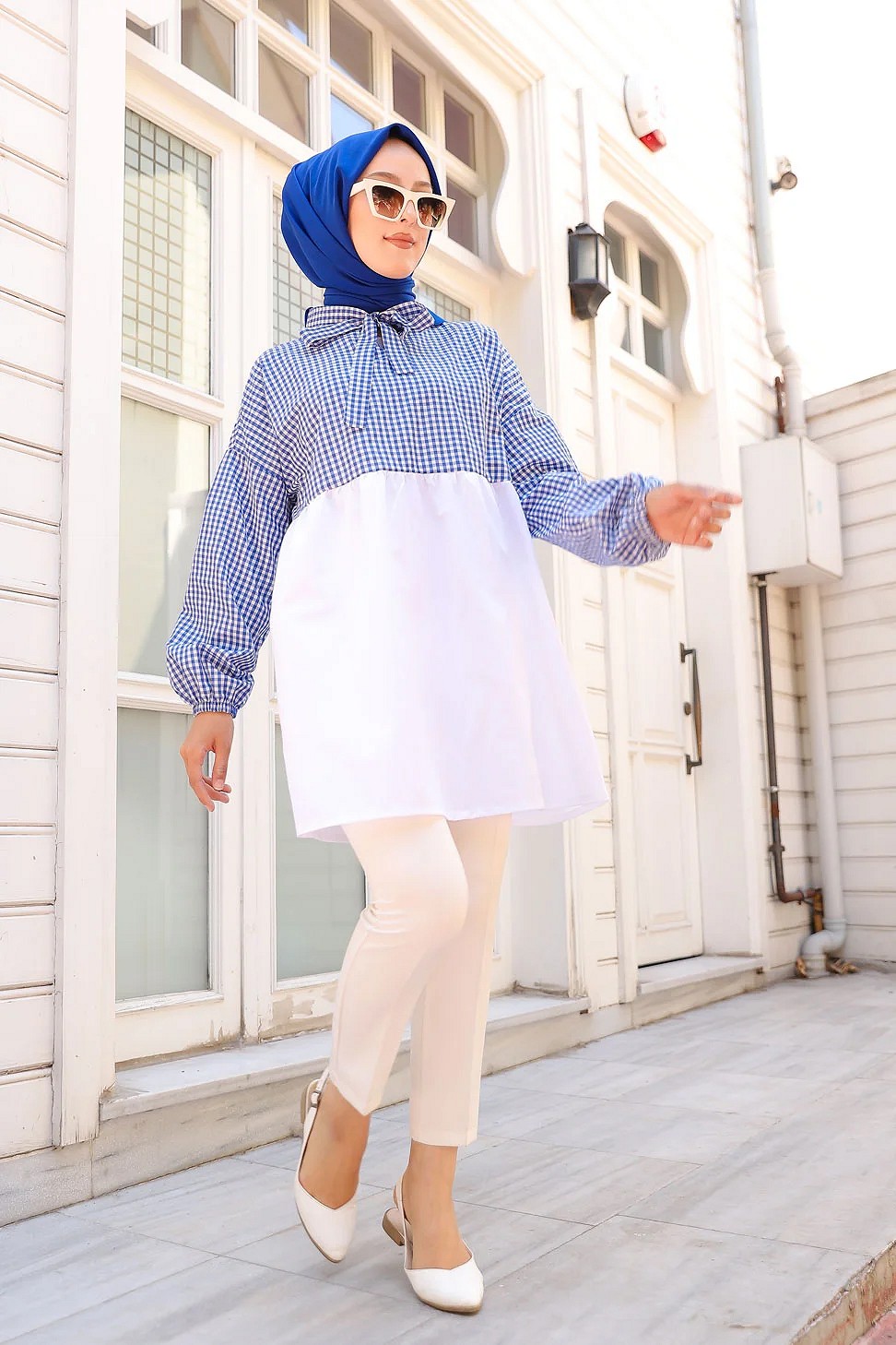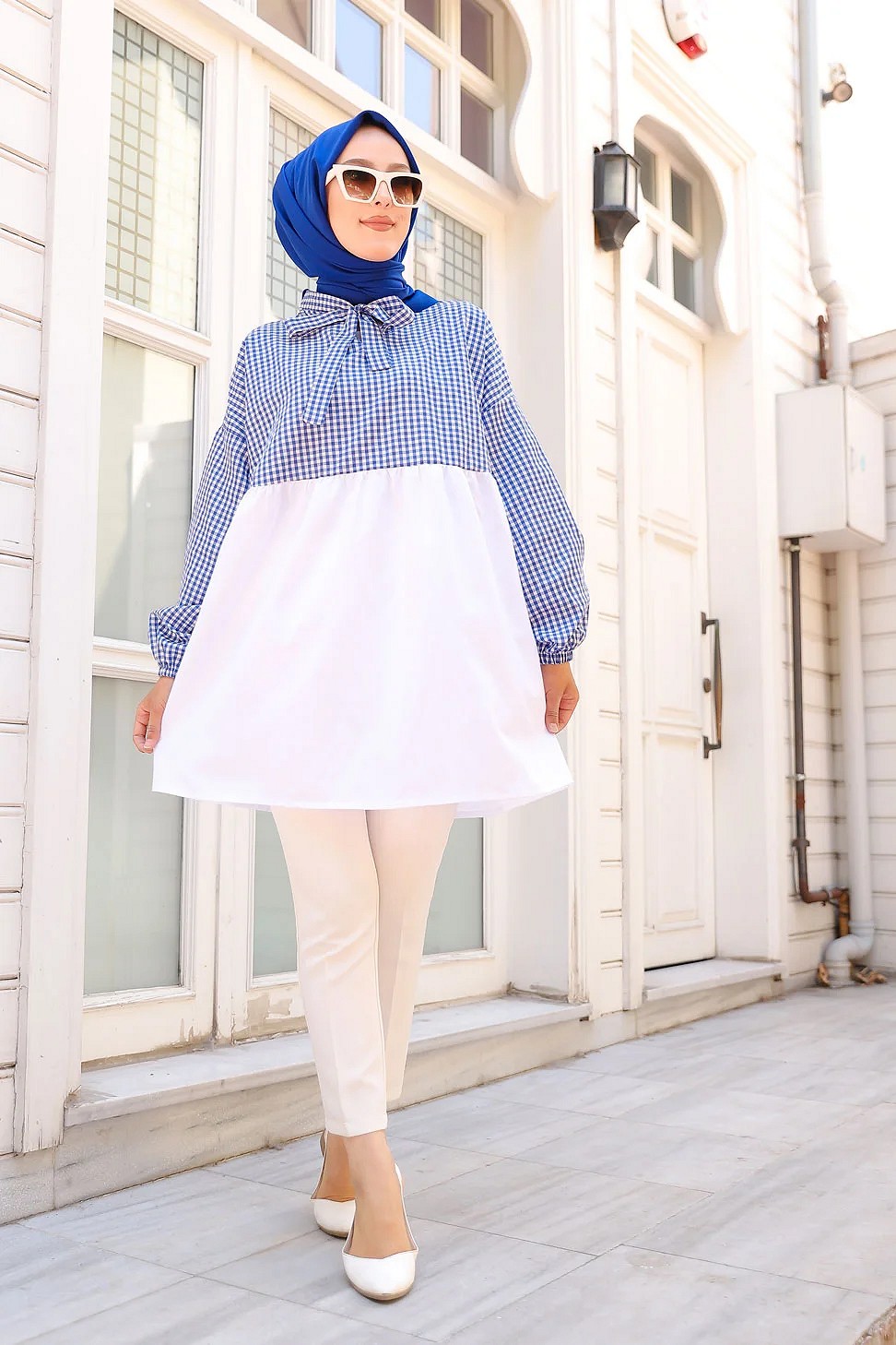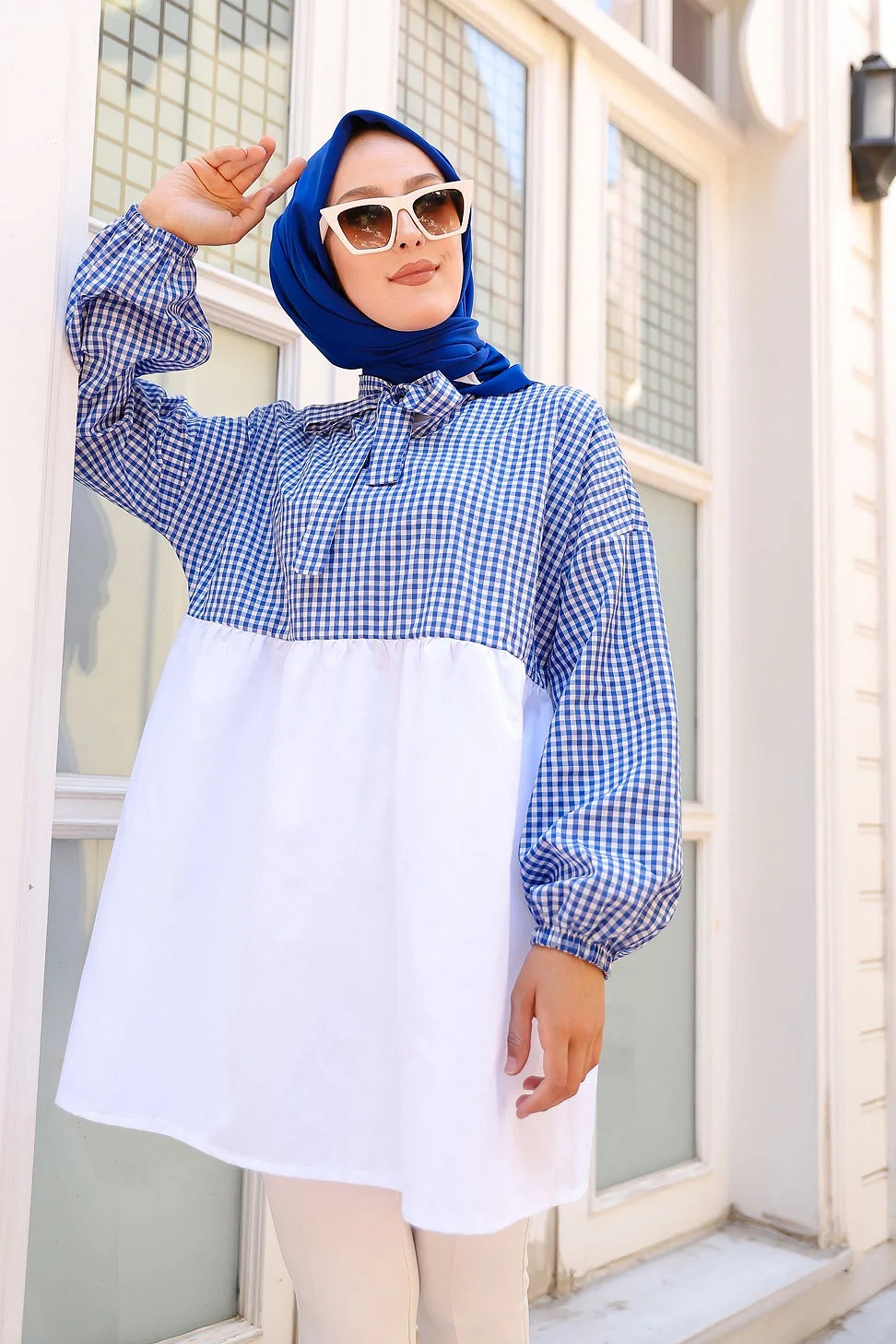 Tunique a carreaux ample et evasee (Boutique en ligne vetement femme musulmane) - Couleur blanc et bleu