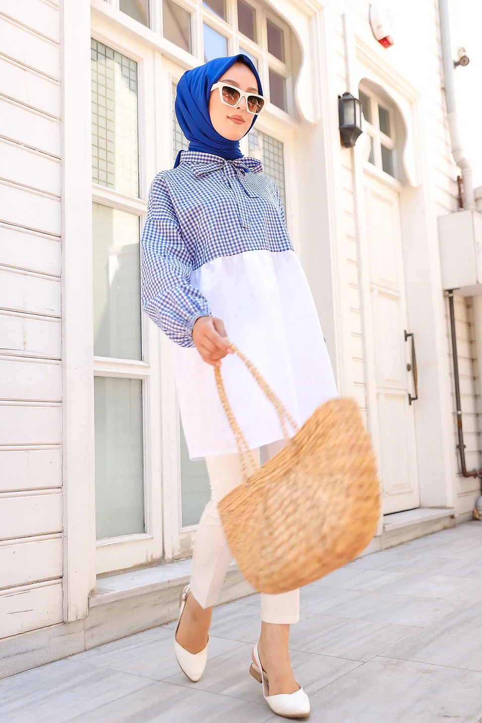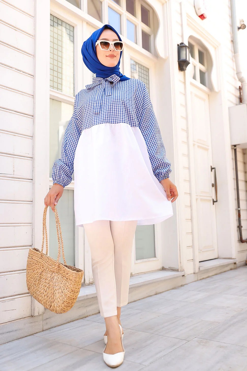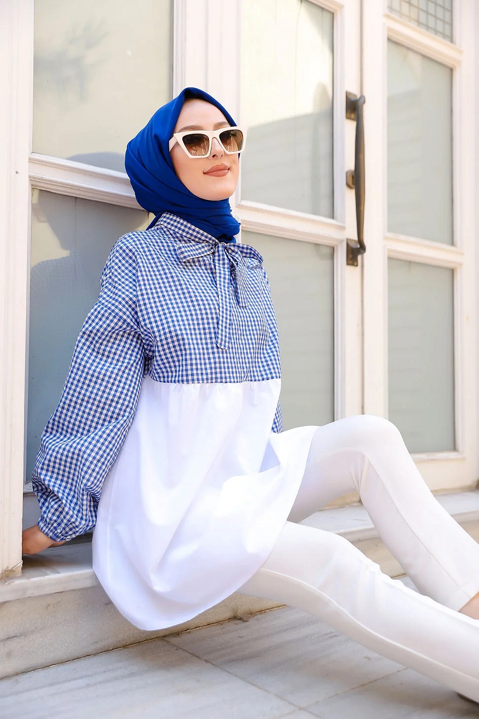 Tunique a carreaux ample et evasee (Boutique en ligne vetement femme musulmane) - Couleur blanc et bleu