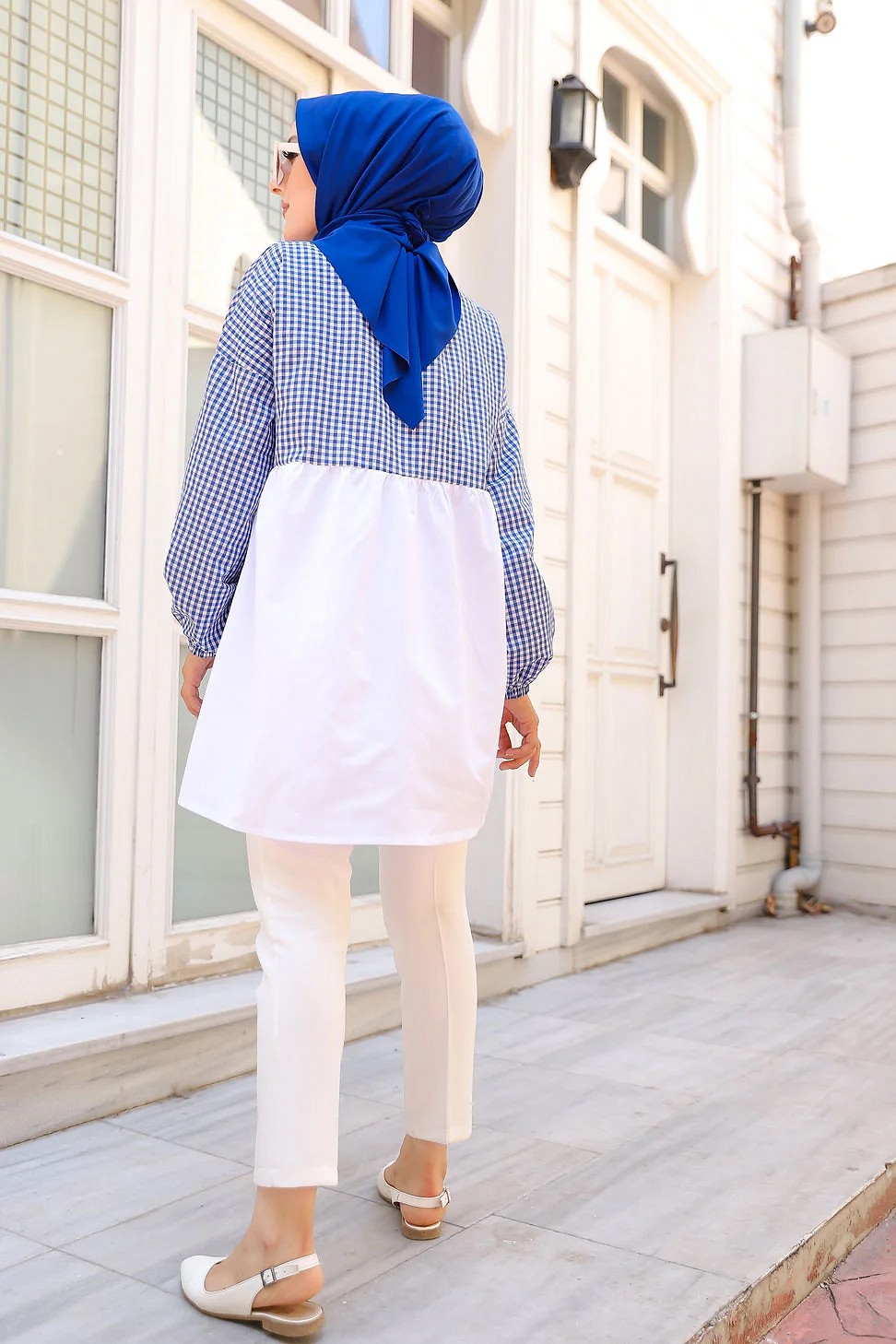 Tunique à carreaux ample et évasée (Boutique en ligne vêtement femme musulmane) - Couleur blanc et bleu Vetement & Accessoire