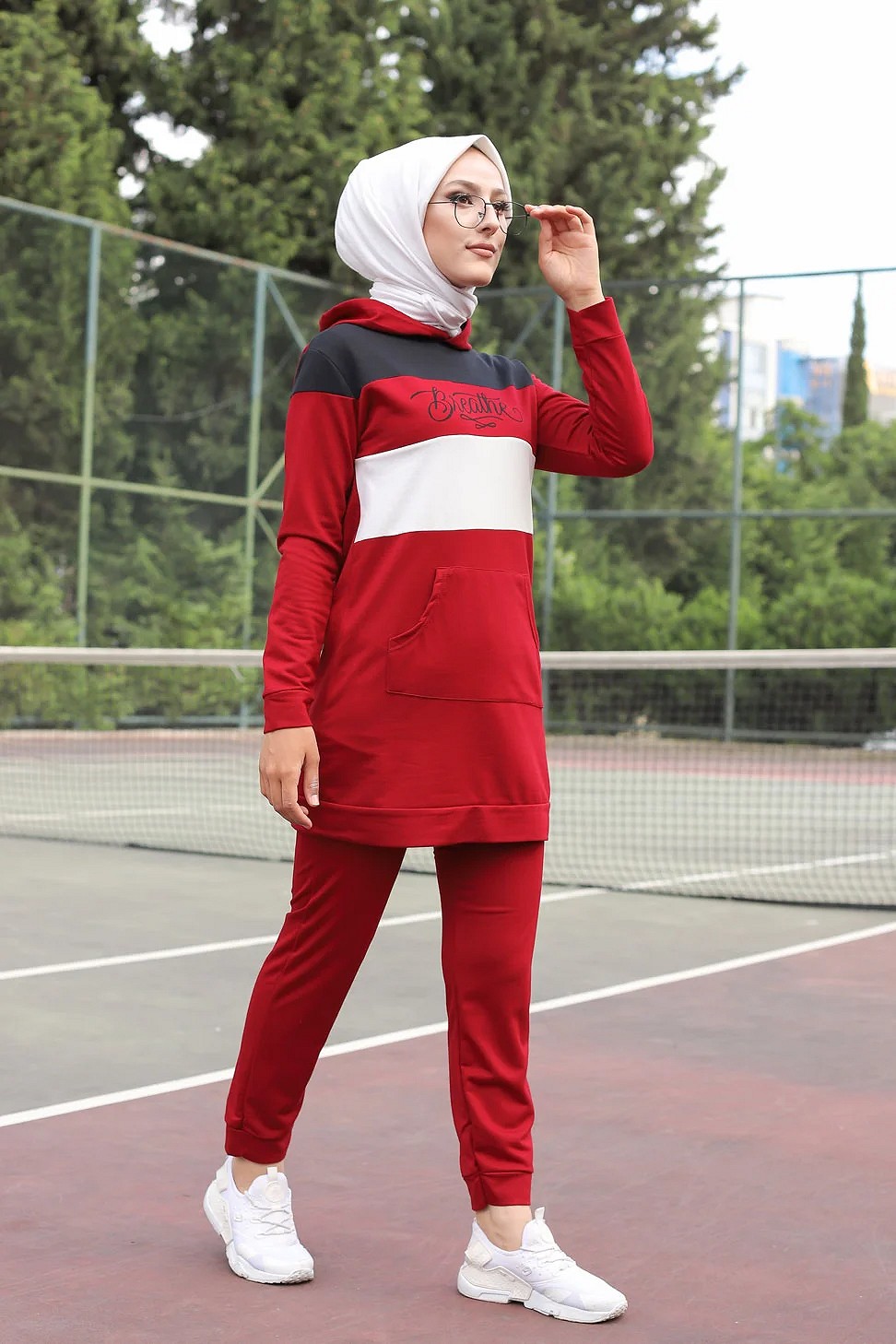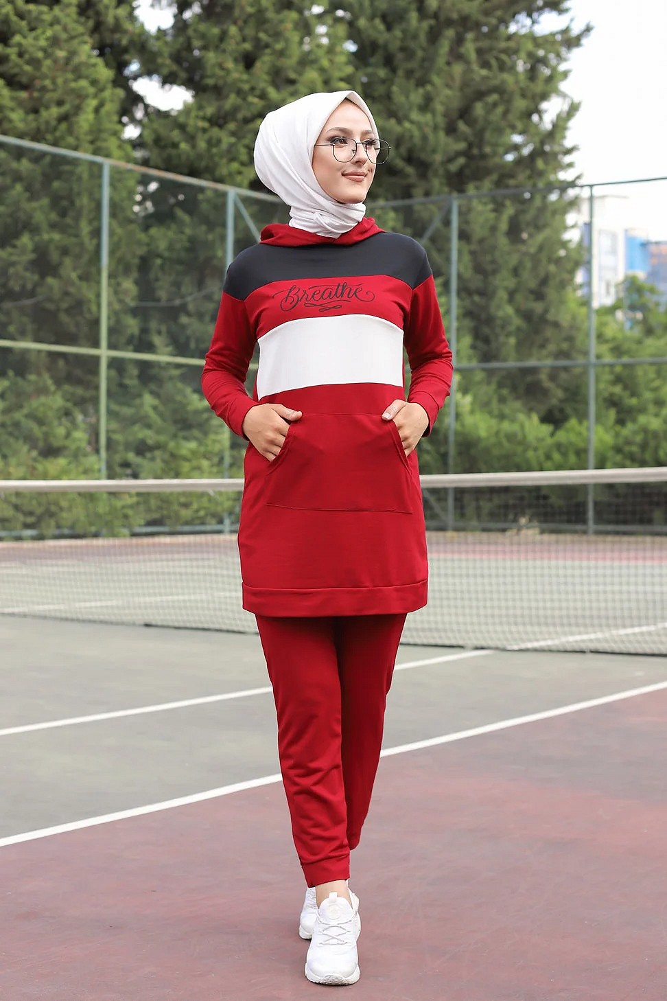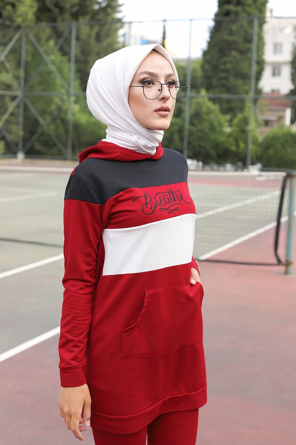 Survêtement tricolore à capuche imprimé "Breathe" (Sportwear femme voilée) - Couleur Bordeaux, noir et blanc Vetement & Accessoire