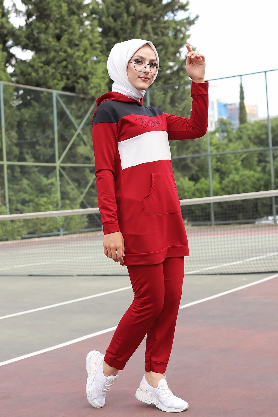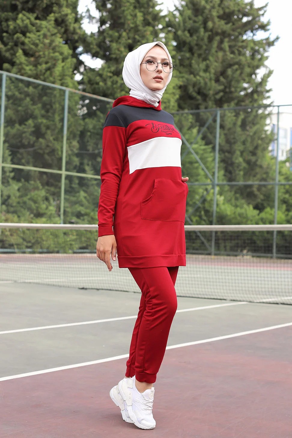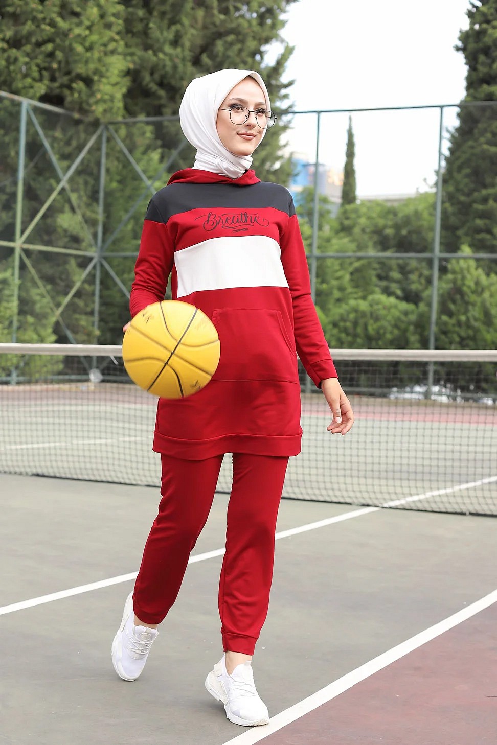 Survêtement tricolore à capuche imprimé "Breathe" (Sportwear femme voilée) - Couleur Bordeaux, noir et blanc Vetement & Accessoire