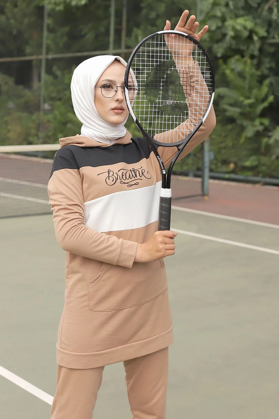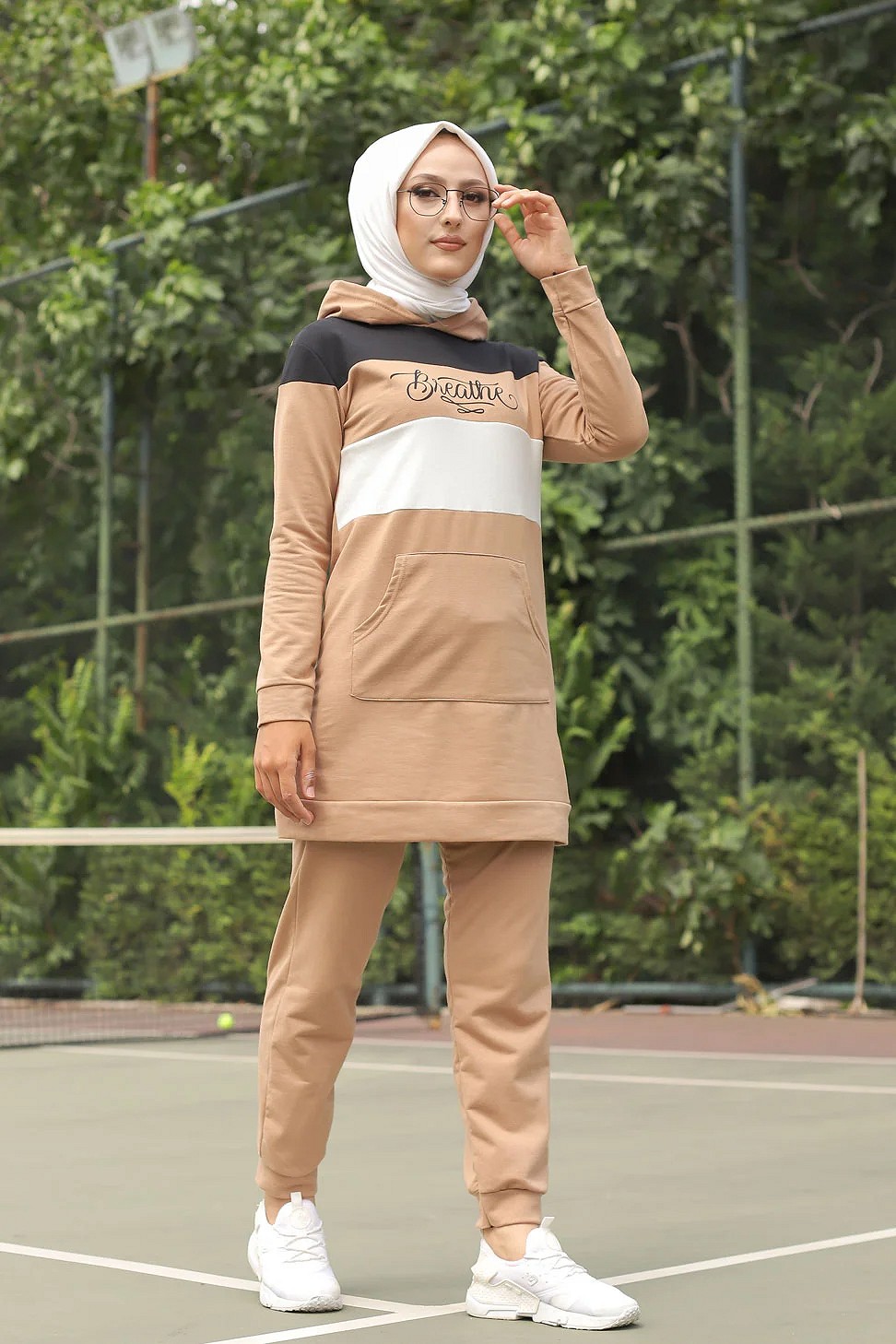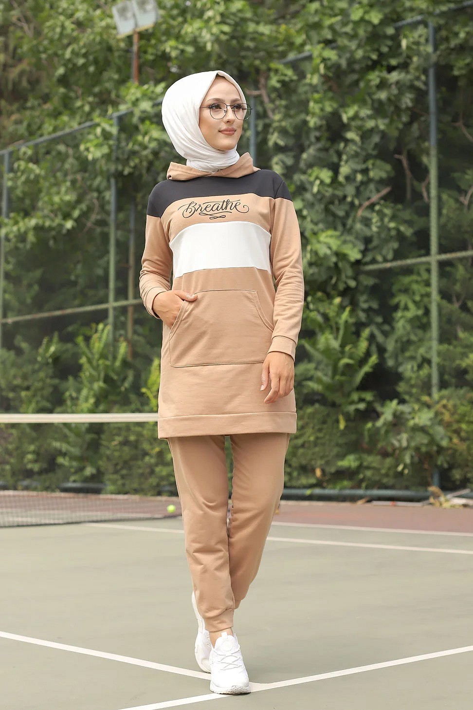 Survêtement tricolore à capuche imprimé "Breathe" (Hijab Sport-Wear) - Couleur Beige, noir et blanc Vetement & Accessoire