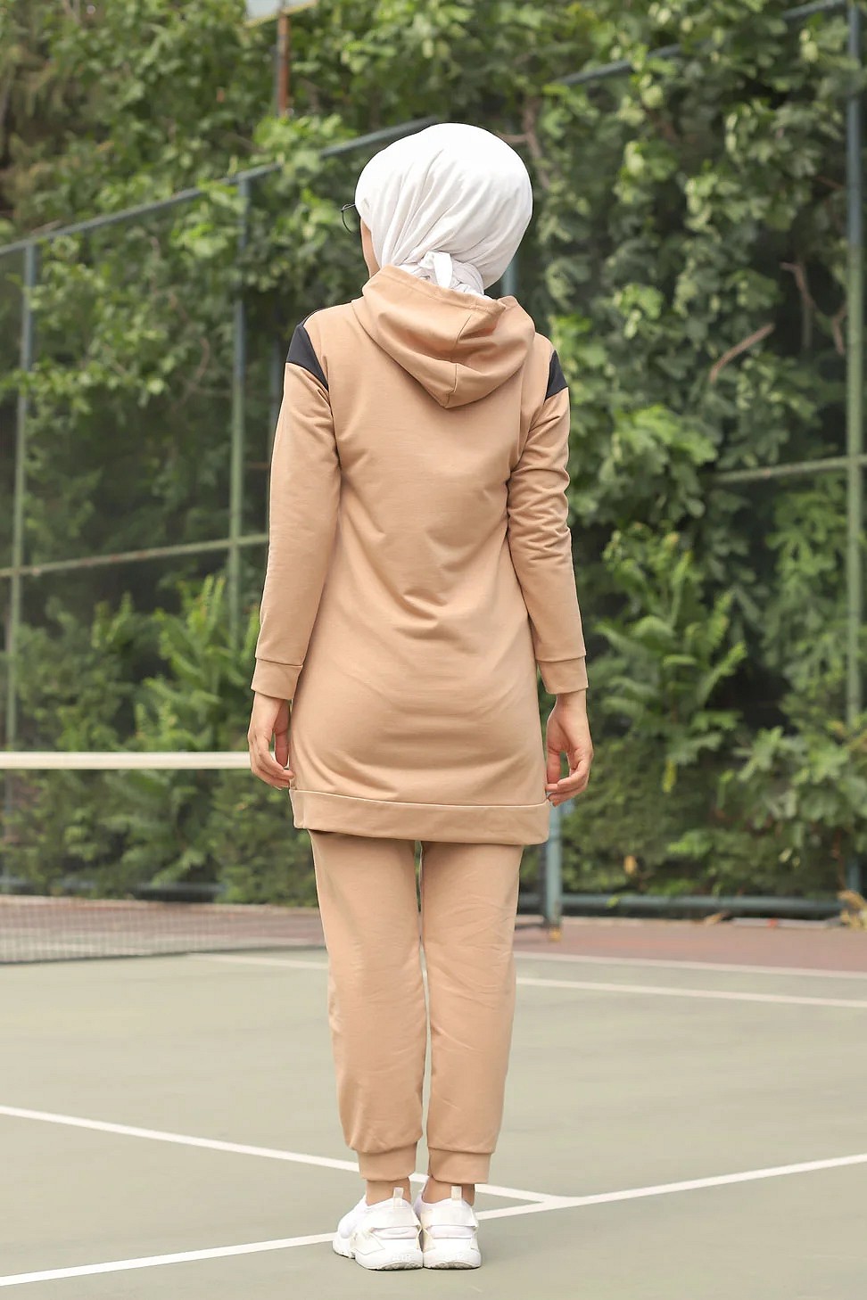 Ensemble survêtement 2 pièces (Haut à capuche et bas et jogger) pour femme voilée - Couleur blanc et Camel - REF. 32948 (28.00 €)