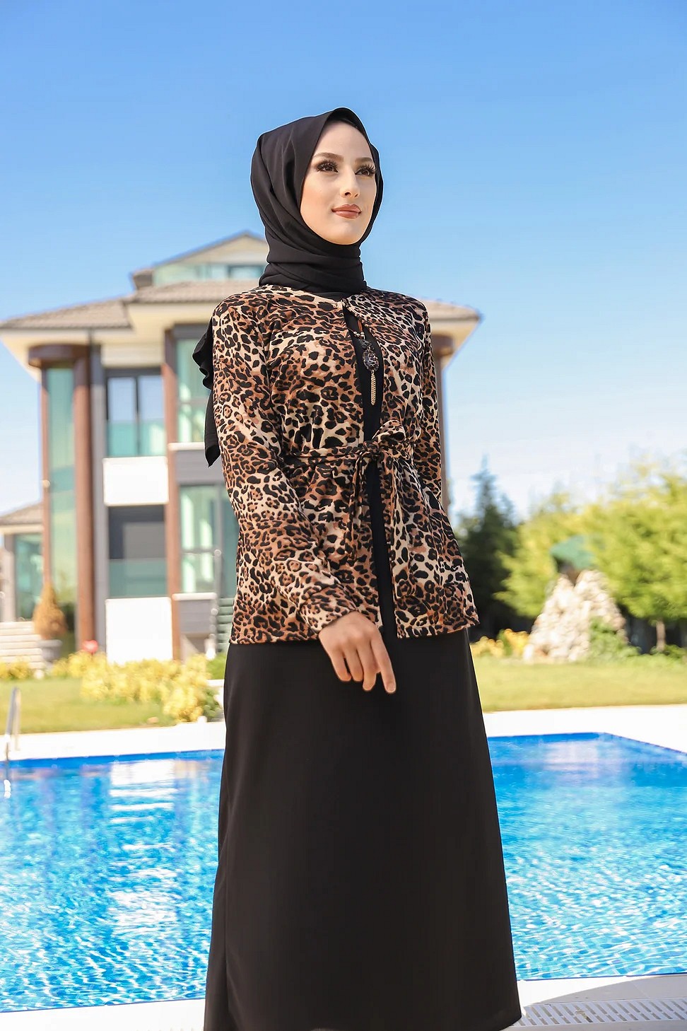 Ensemble deux pieces : veste motif leopard et robe noire avec collier assorti (Vetement hijab 2021)