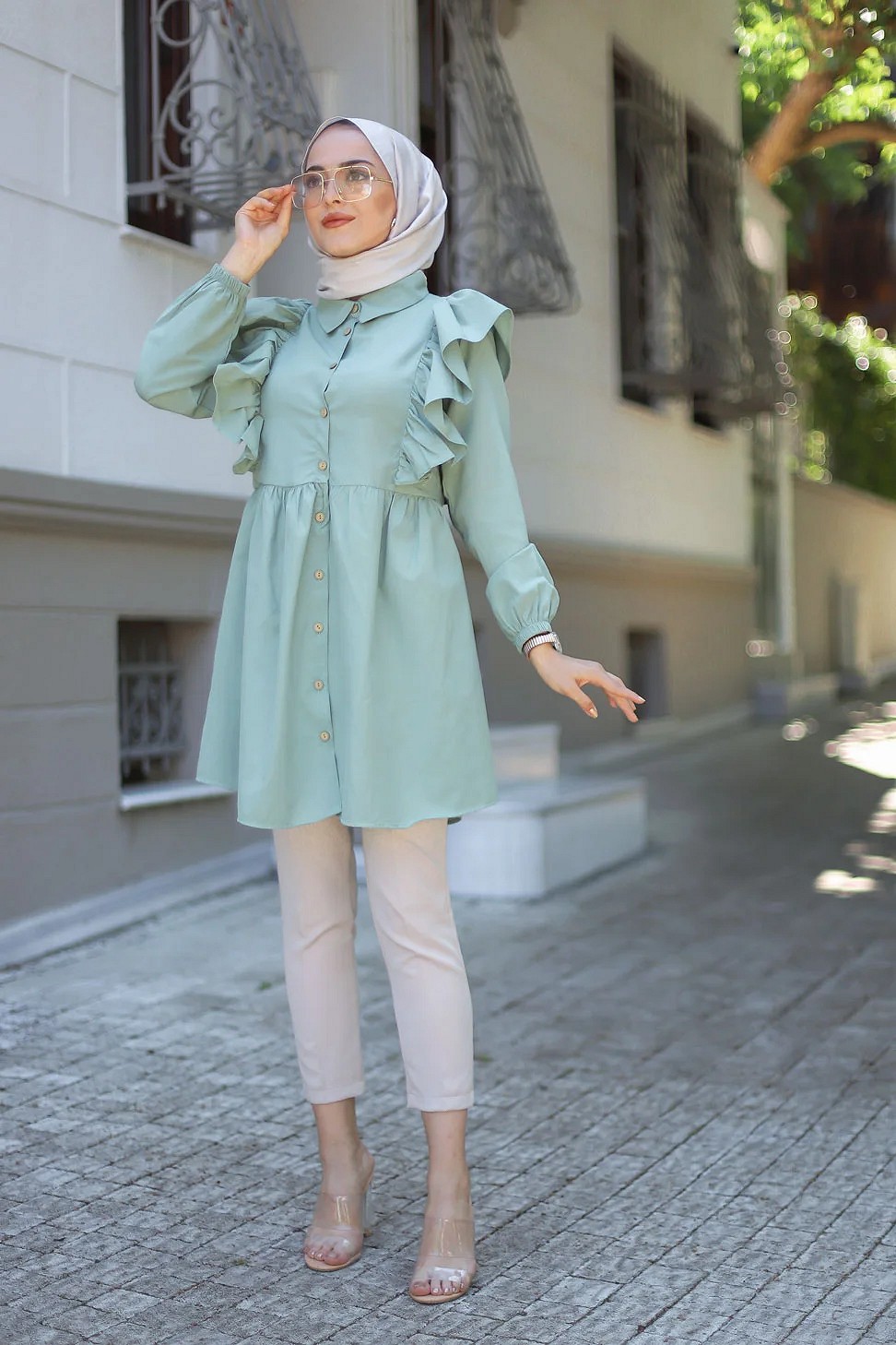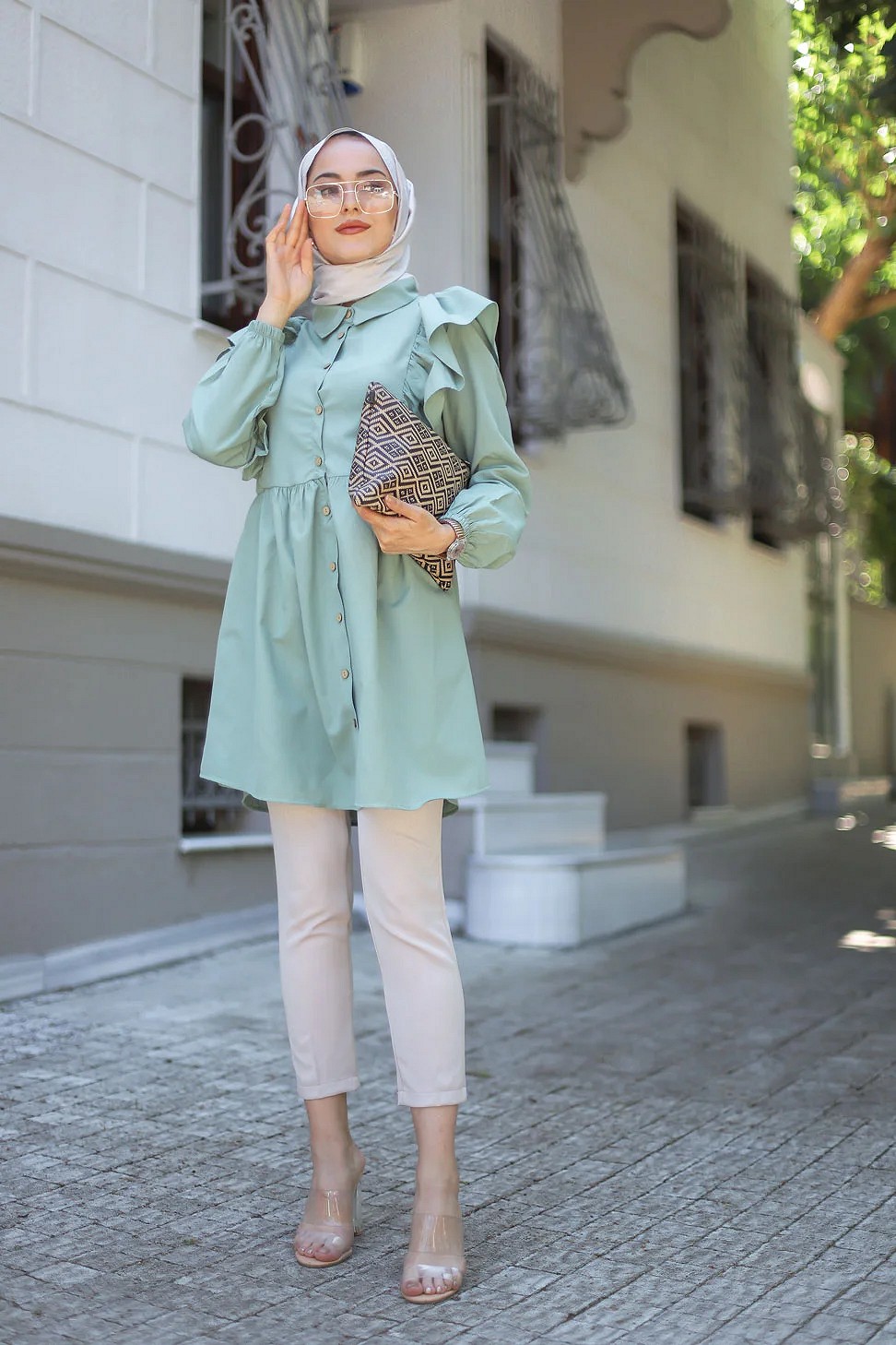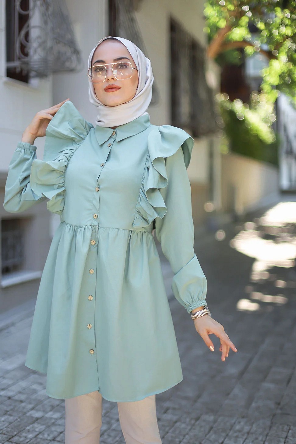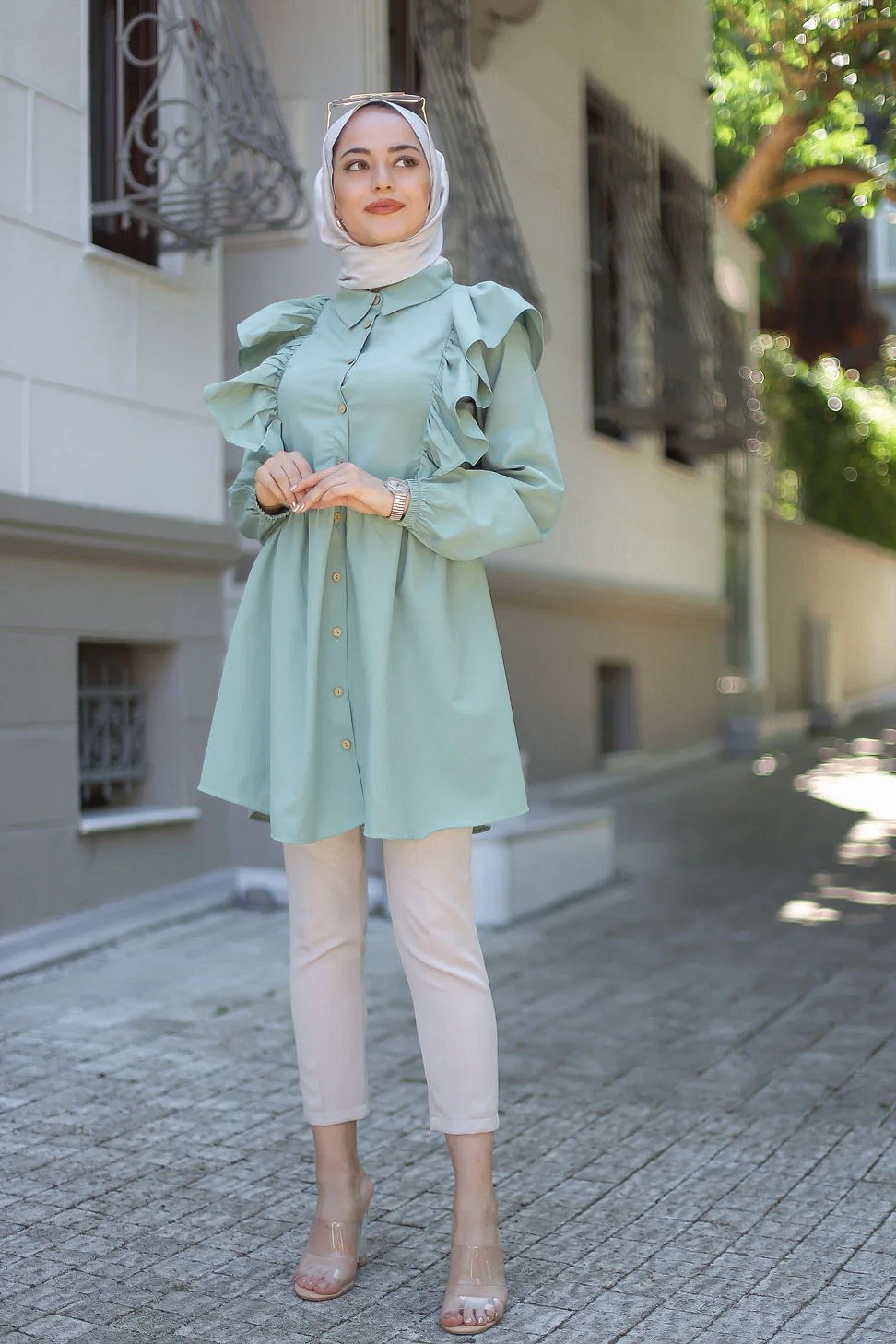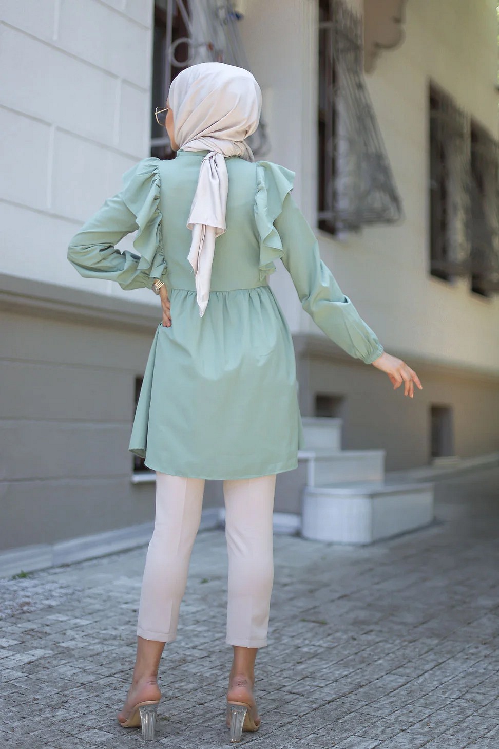 Chemise a froufrou (Vetement femme musulmane moderne) - Couleur vert amande