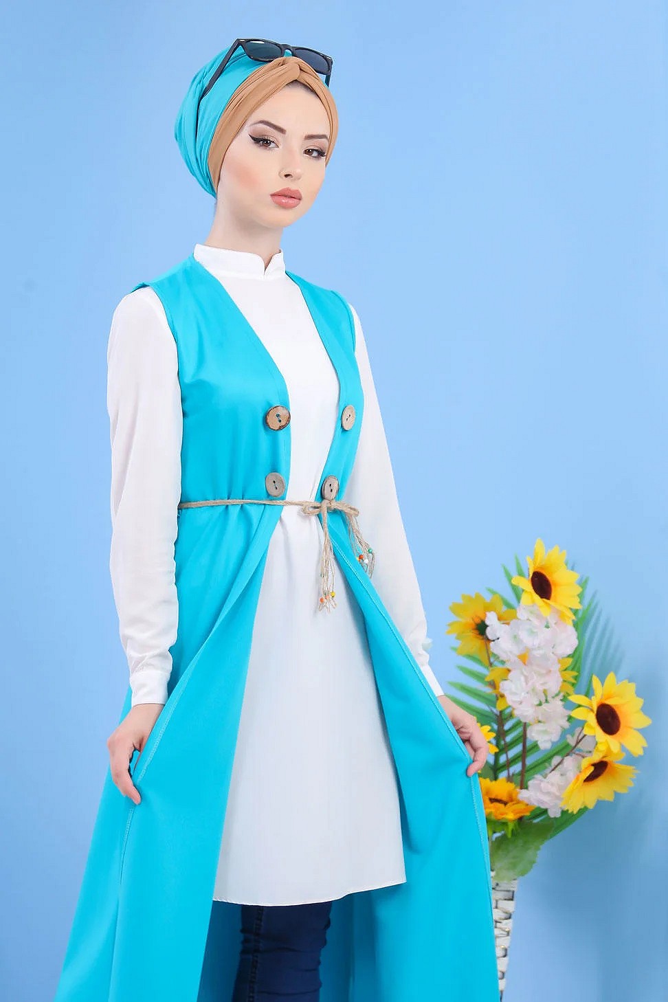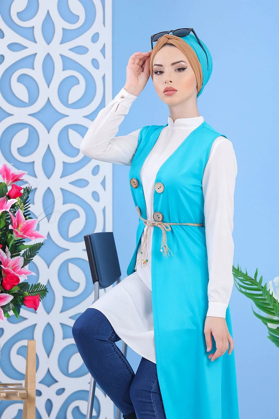 Cardigan maxi-long tricoté en grosse maille (Vêtement Hijab Automne Hiver pour femme) - Couleur bleu indigo - REF. 37727 (24.90 €)