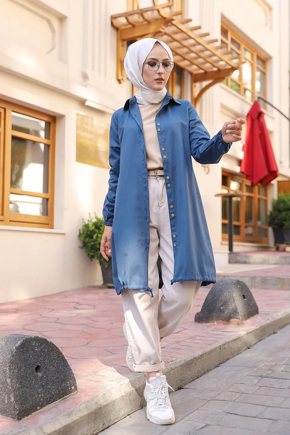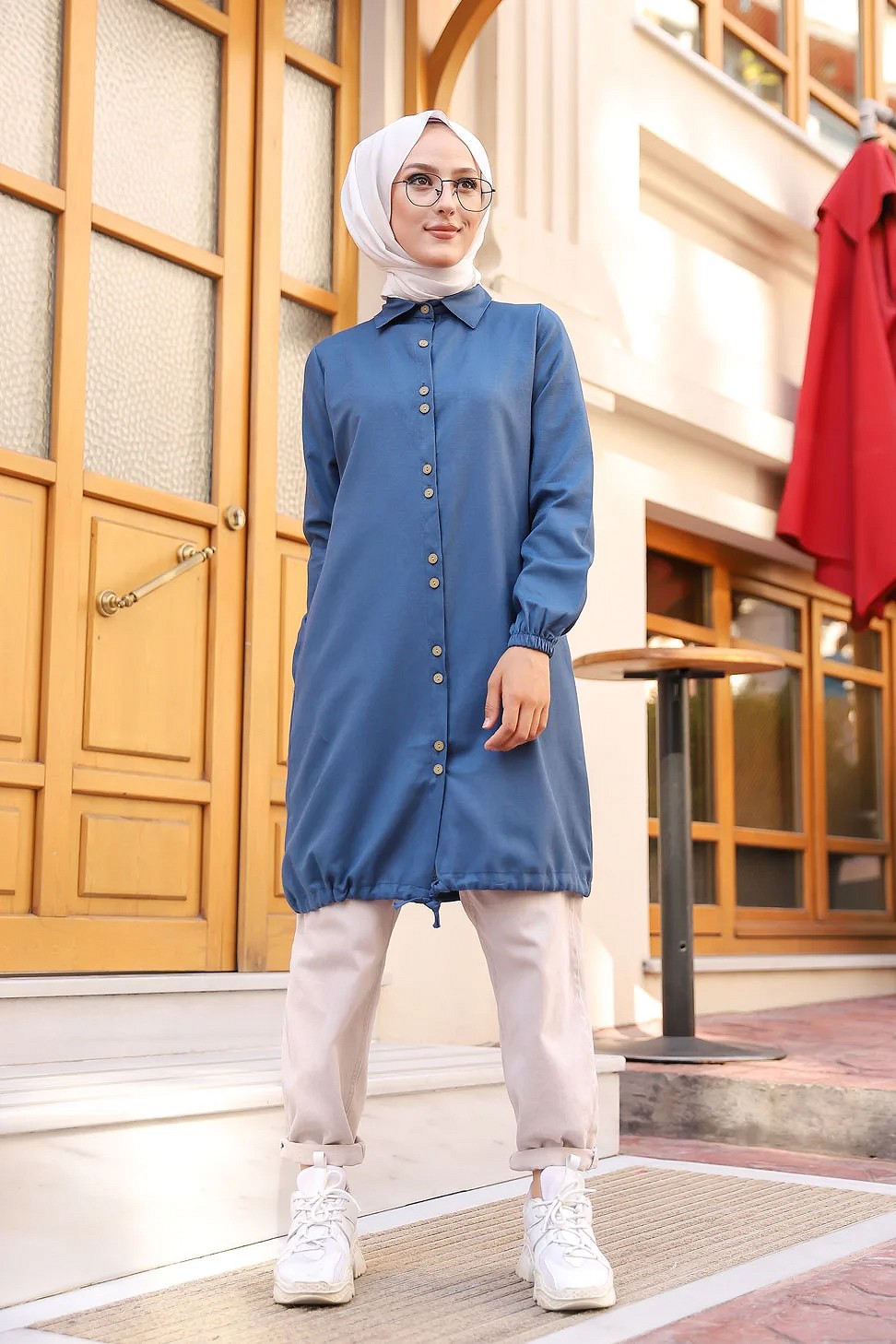 Tunique-Chemise ample boutonnée (Vetement décontracté femme voilée) - Couleur bleu Vetement & Accessoire