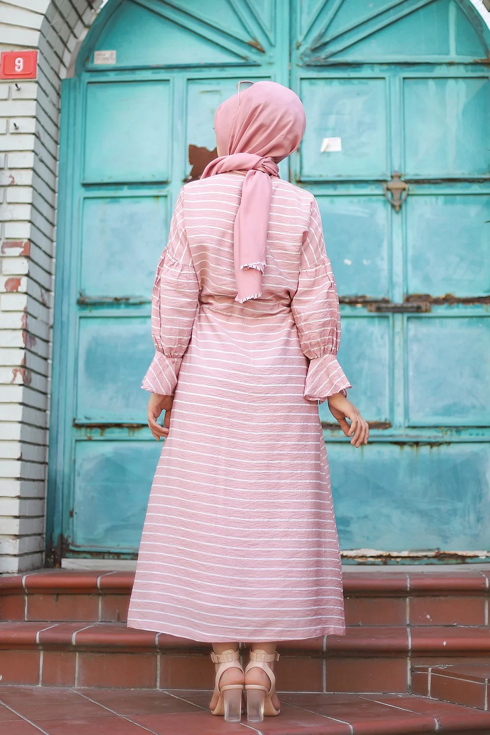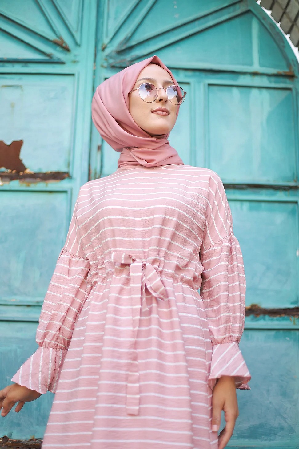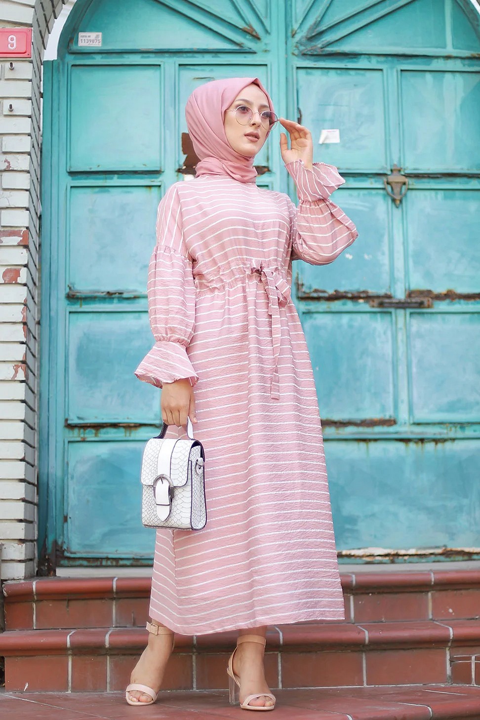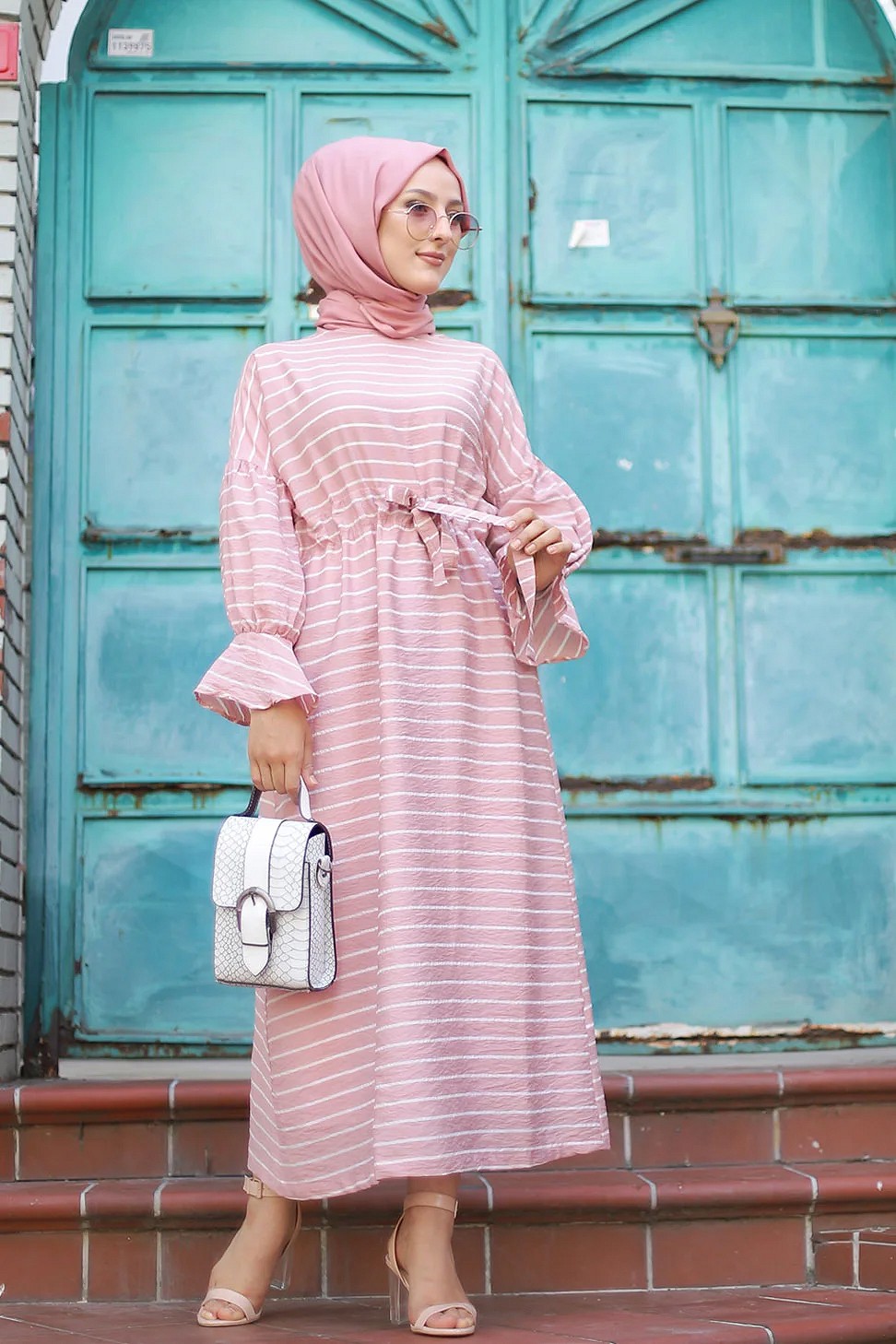 Robe longue à rayures avec ceinture pour femme voilée - Couleur rose poudré Vetement & Accessoire