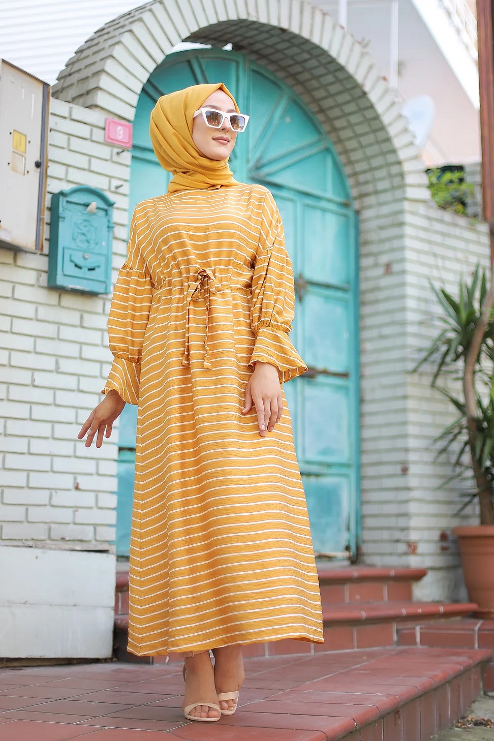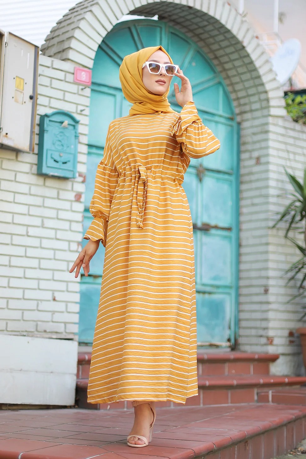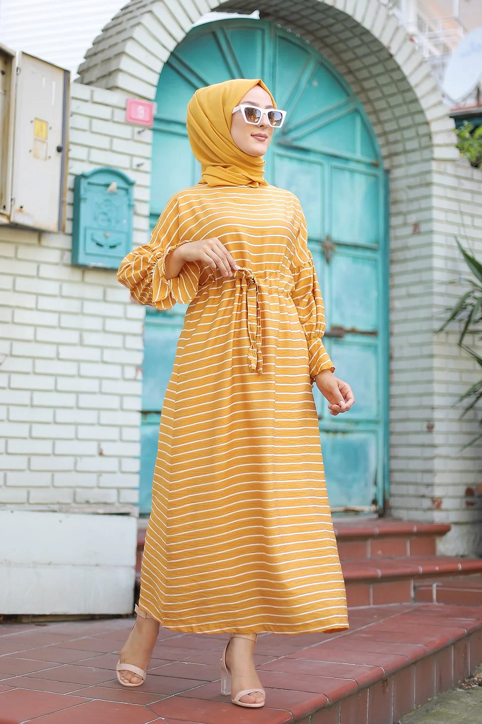 Robe longue à rayures avec ceinture pour femme voilée - Couleur moutarde Vetement & Accessoire