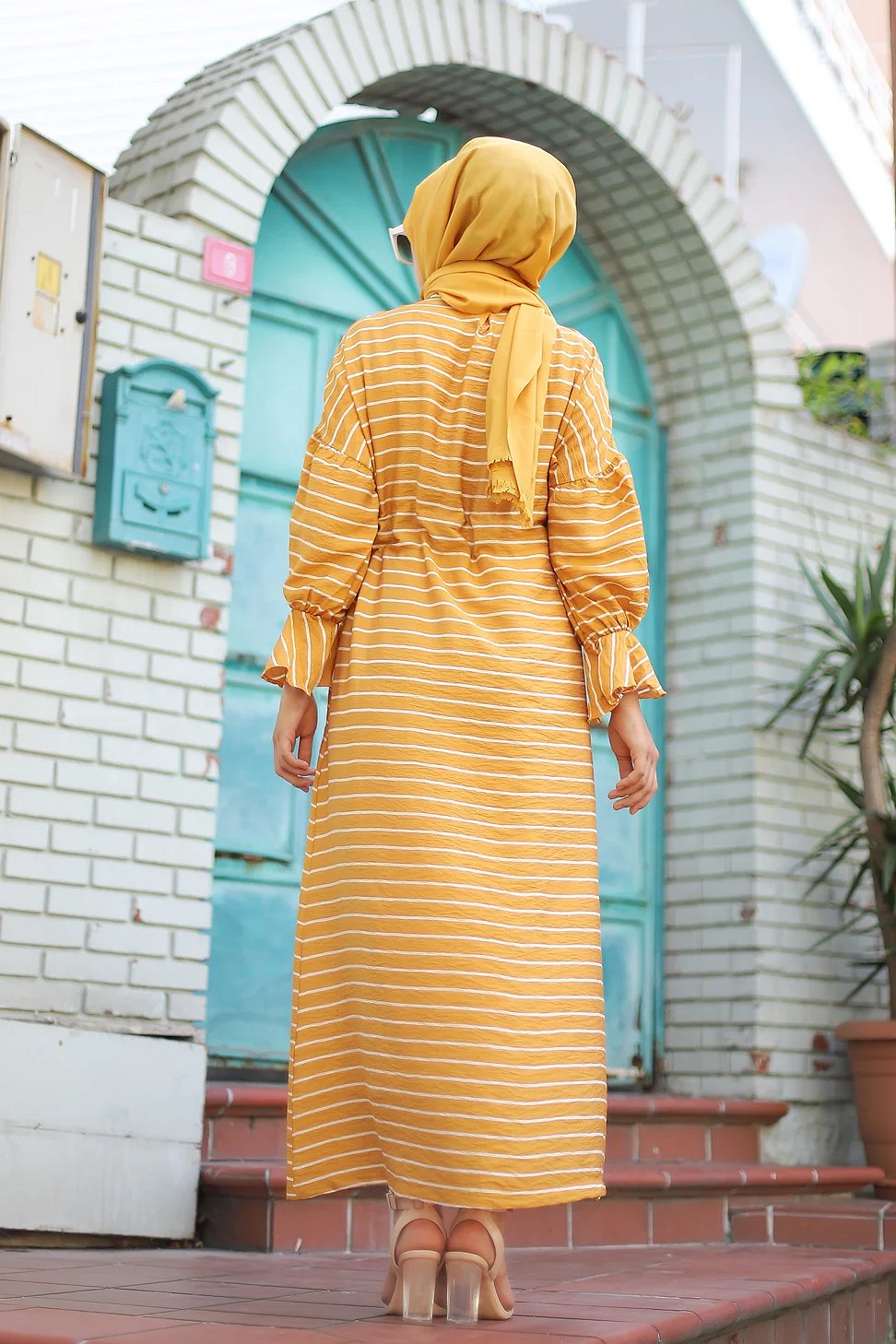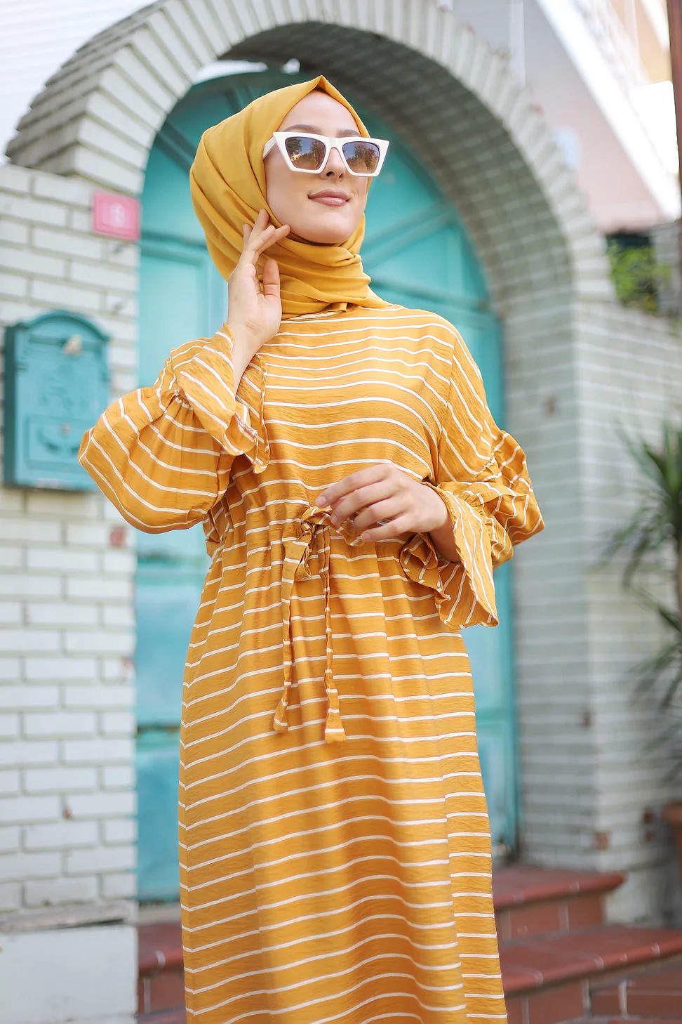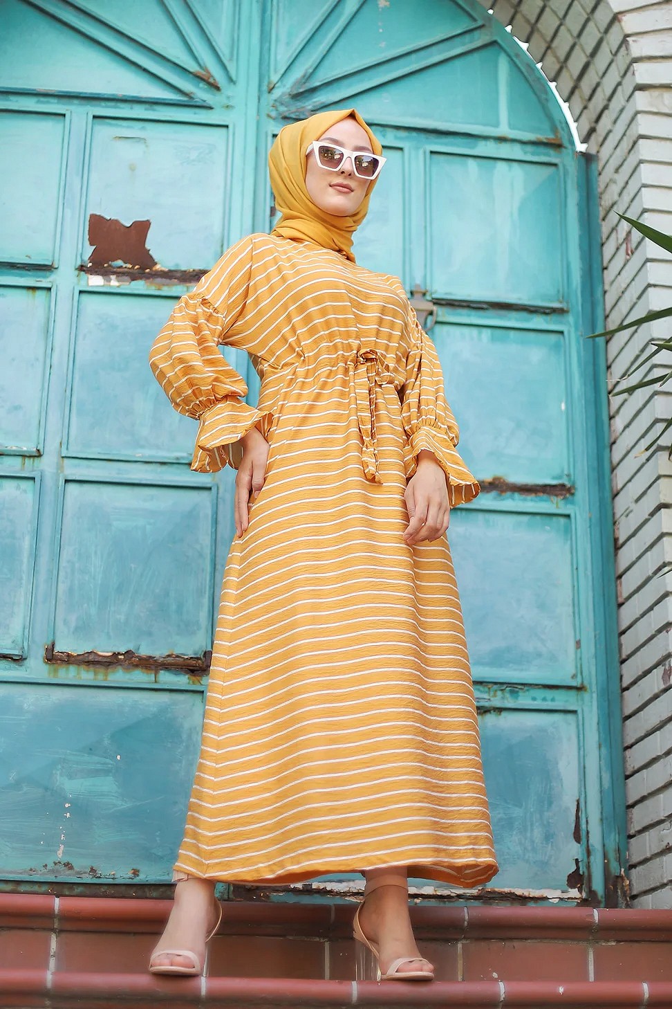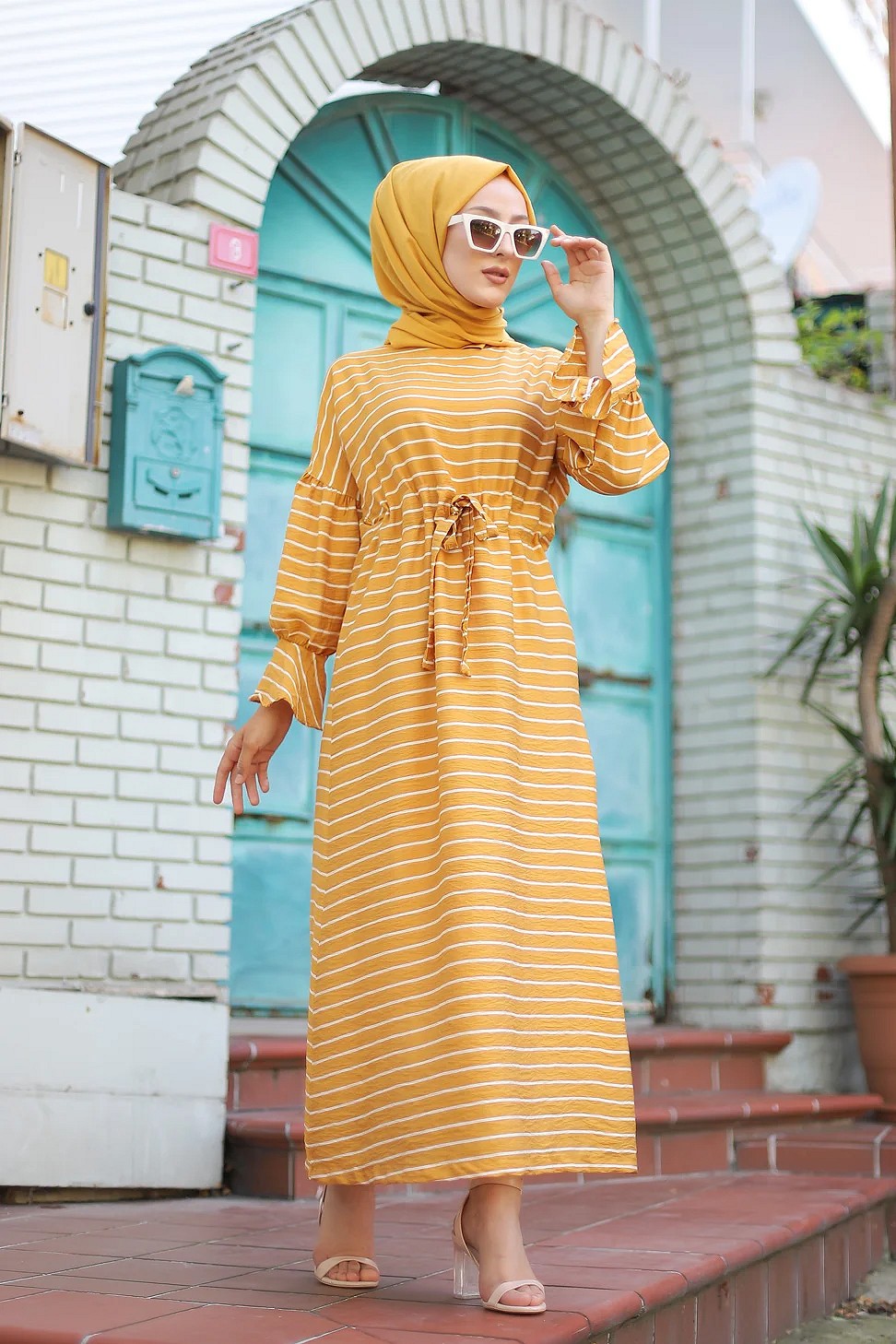 Robe longue à rayures avec ceinture pour femme voilée - Couleur moutarde Vetement & Accessoire