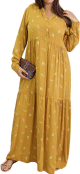 Robe longue ample à motifs plumes - Couleur jaune moutarde - REF. 30752 (29.90 €)