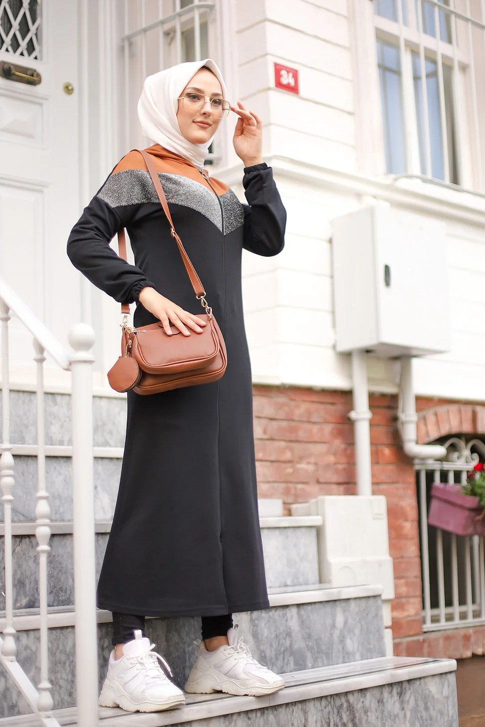 Cardigan long à capuche avec partie argentée - Robe zippée style sport pour femme voilée - Couleur noir et marron clair Vetement & Accessoire