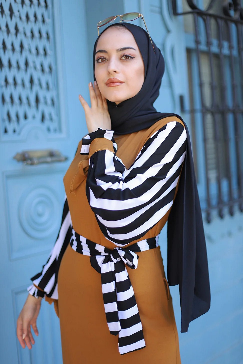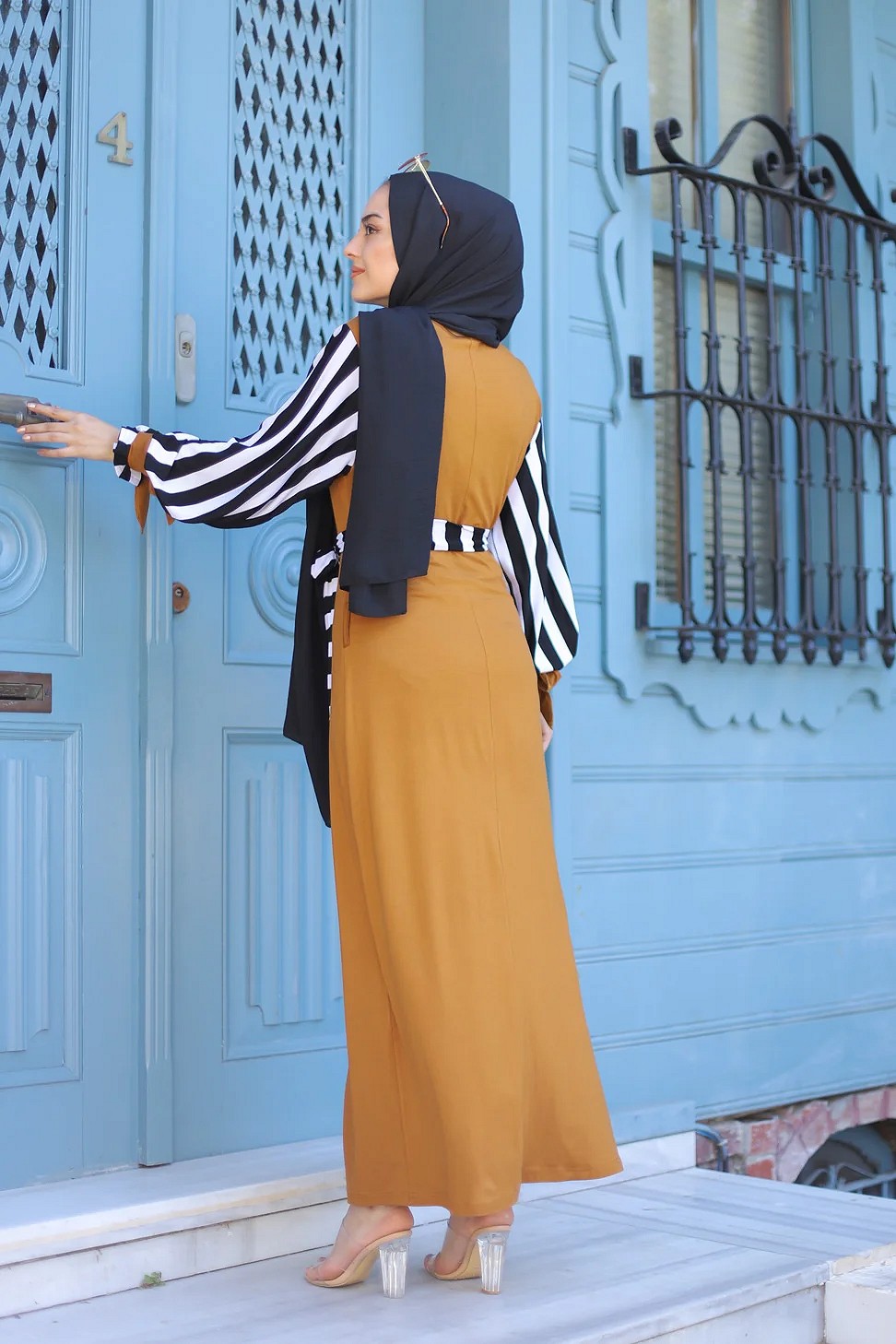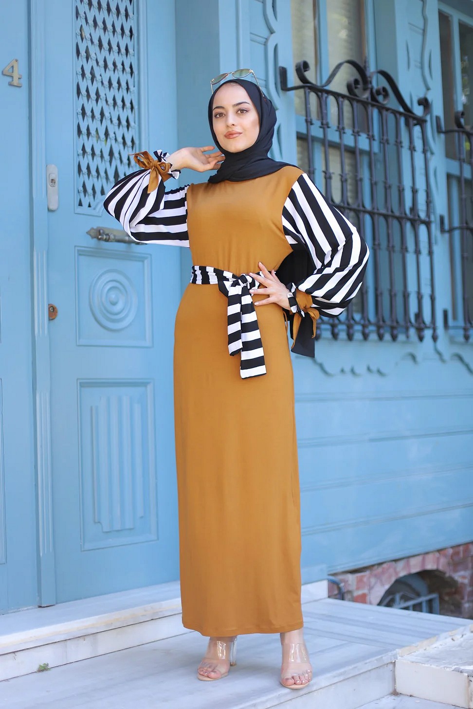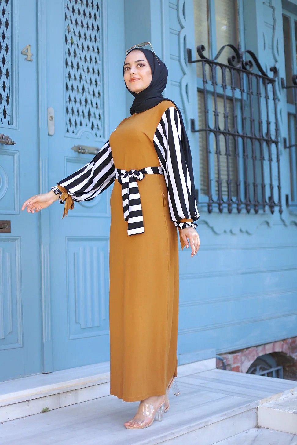Robe pour femmes musulmanes - Ceinture et manche à rayure noir et blanc (Grandes tailles disponibles) - Couleur moutarde Vetement & Accessoire