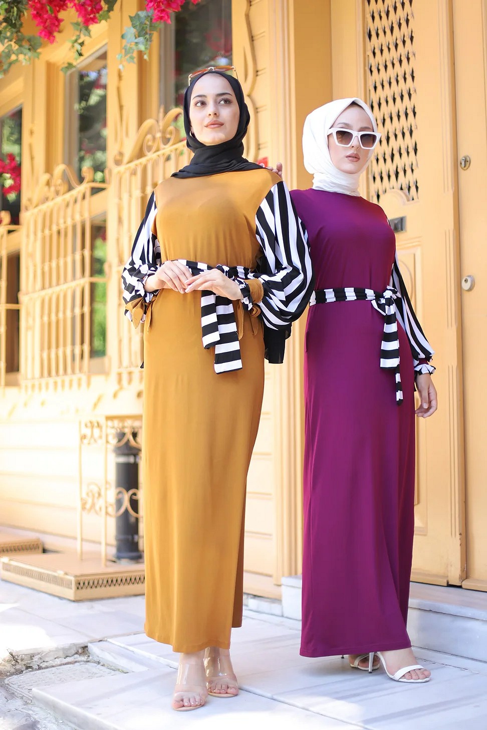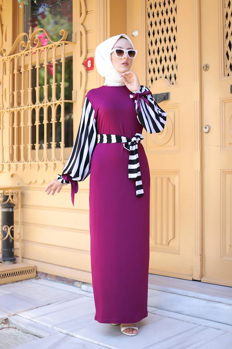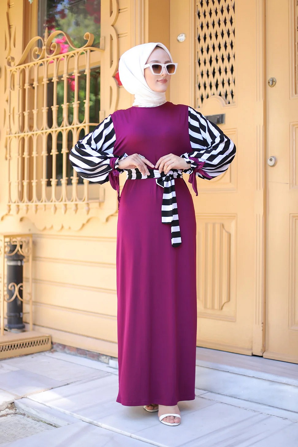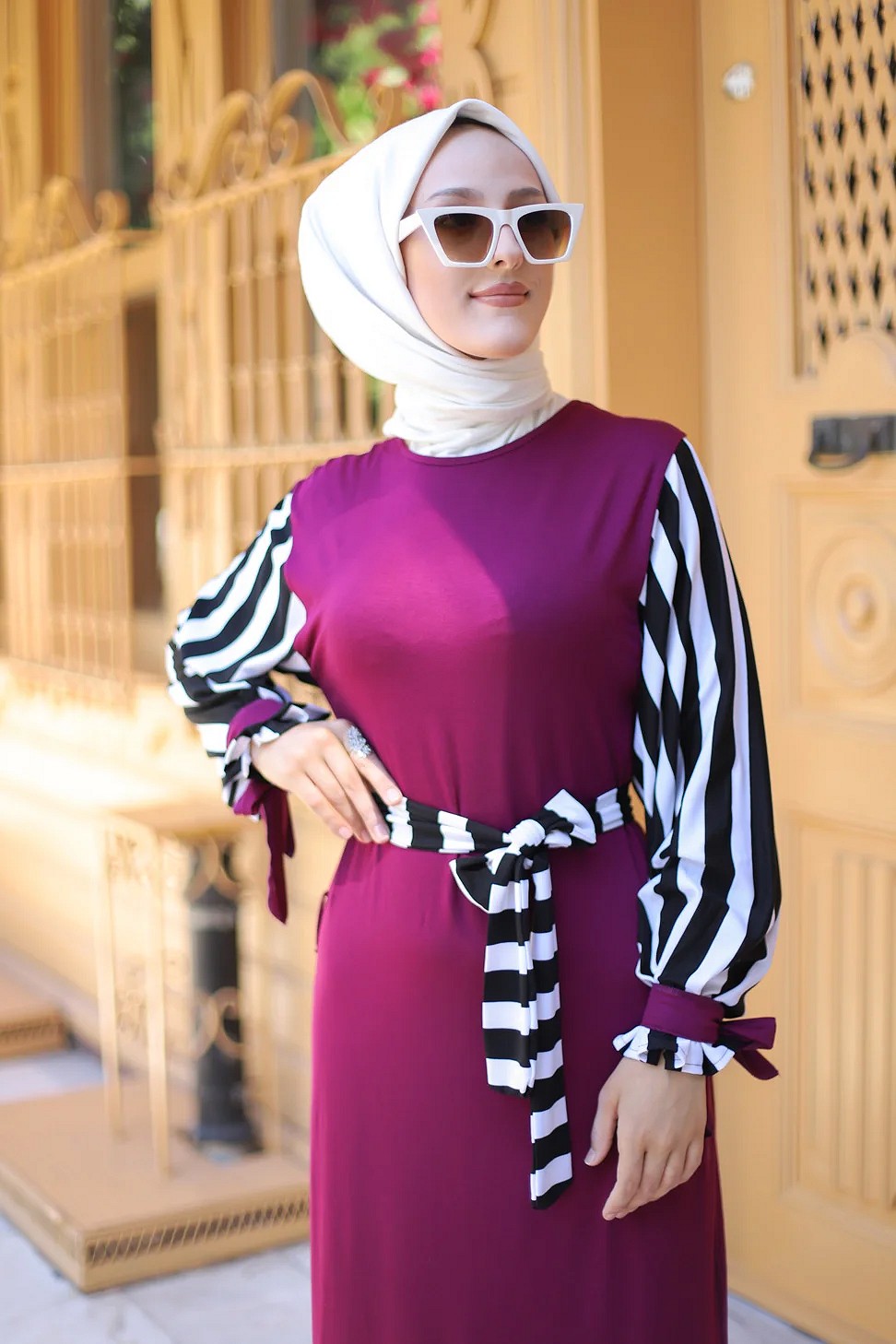 Robe pour femme musulmane - Ceinture et manche à rayure noir et blanc (Grande taille disponible) - Couleur prune - REF. 33256 (24.90 €)