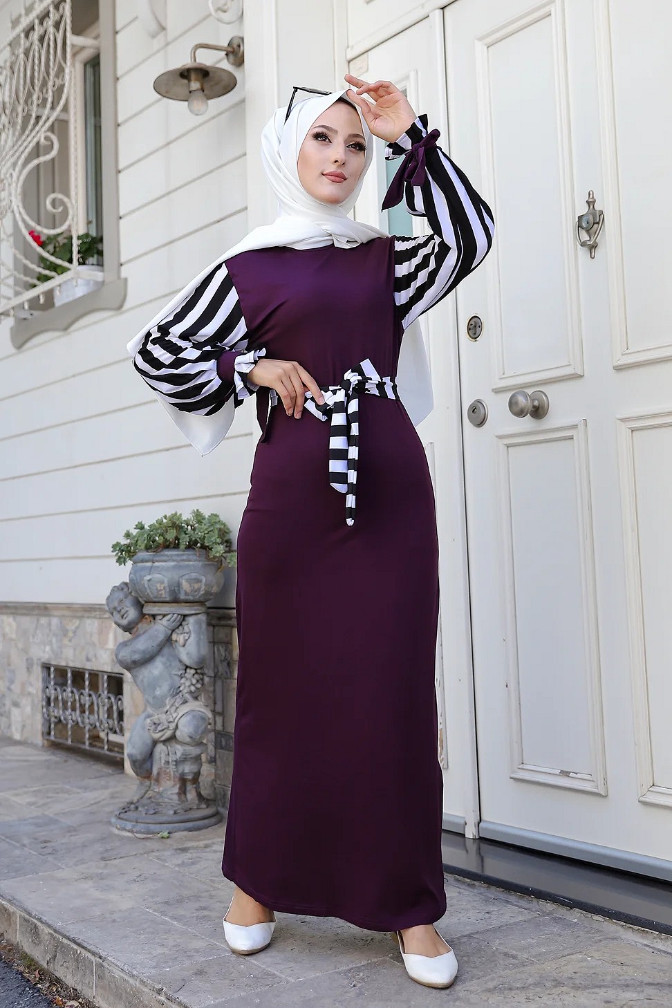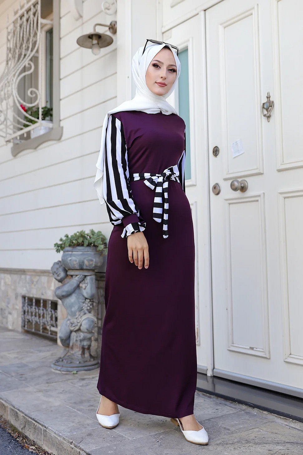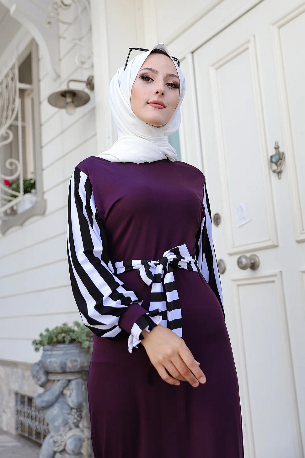 Robe pour femme musulmane - Ceinture et manche à rayure noir et blanc (Grande taille disponible) - Couleur prune Vetement & Accessoire