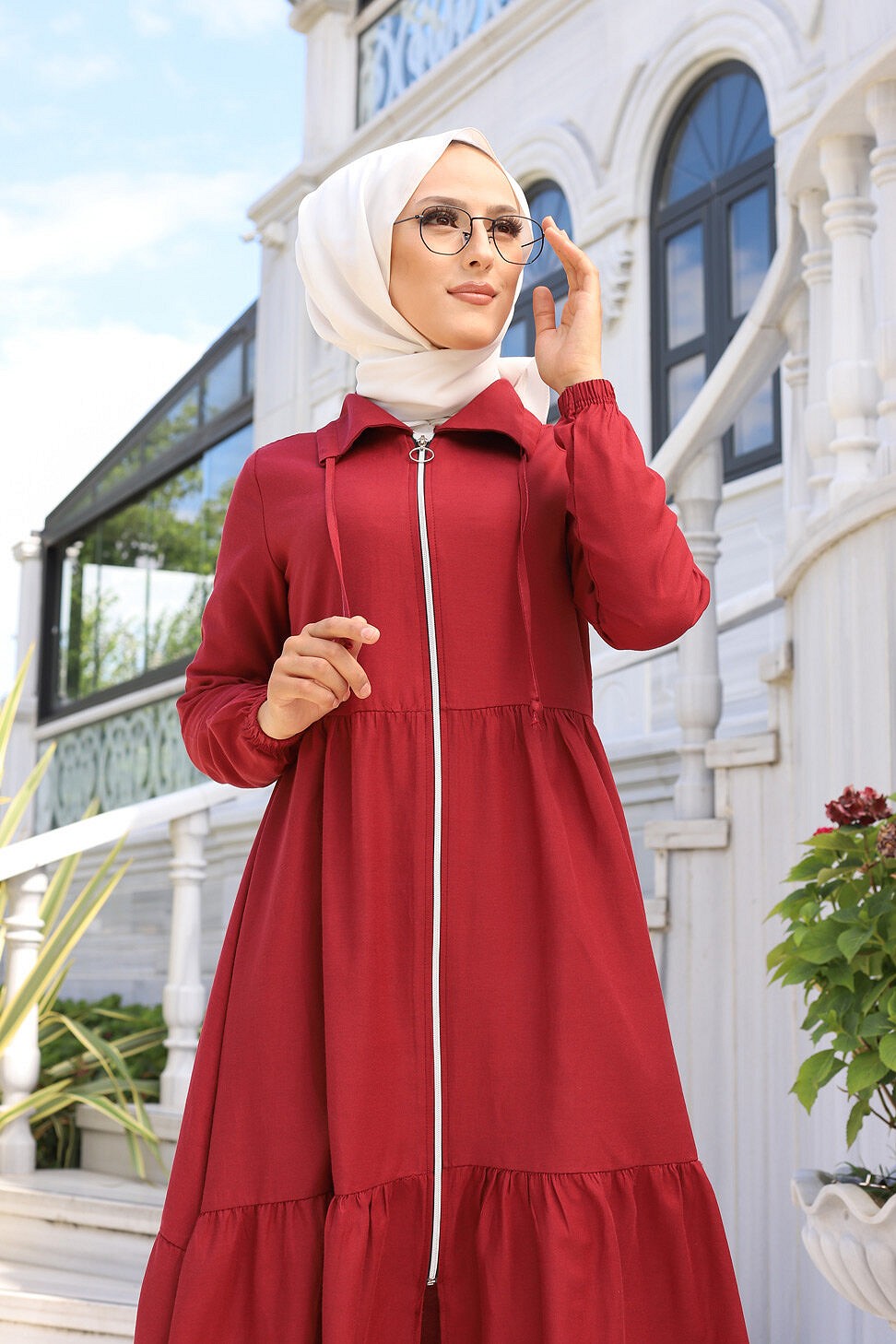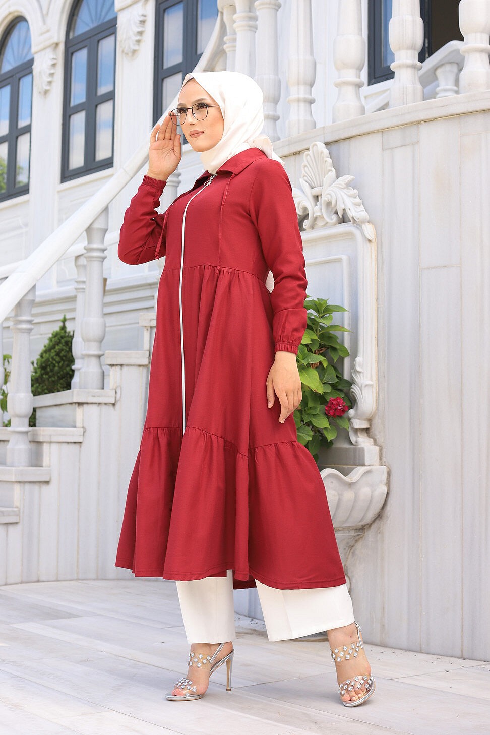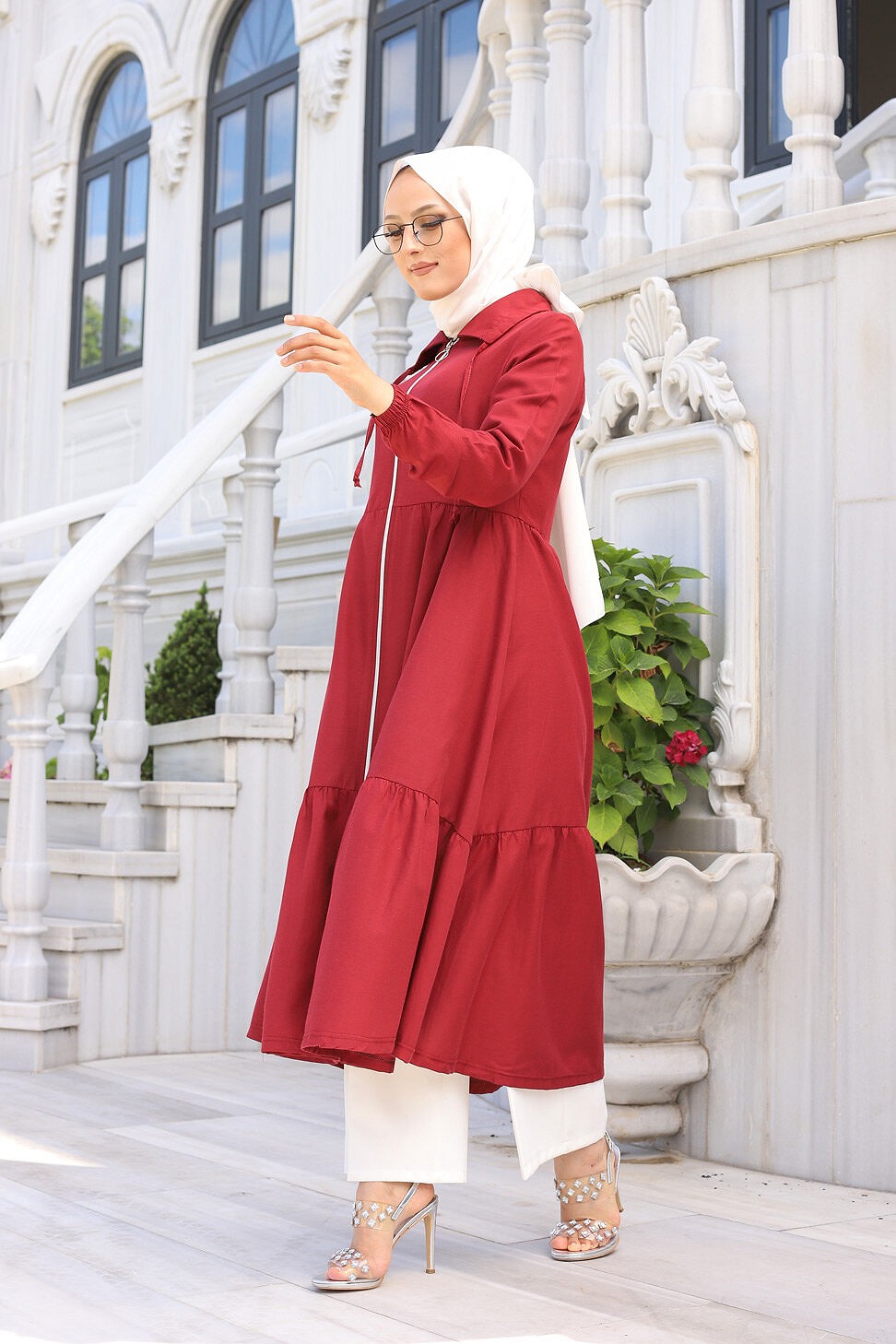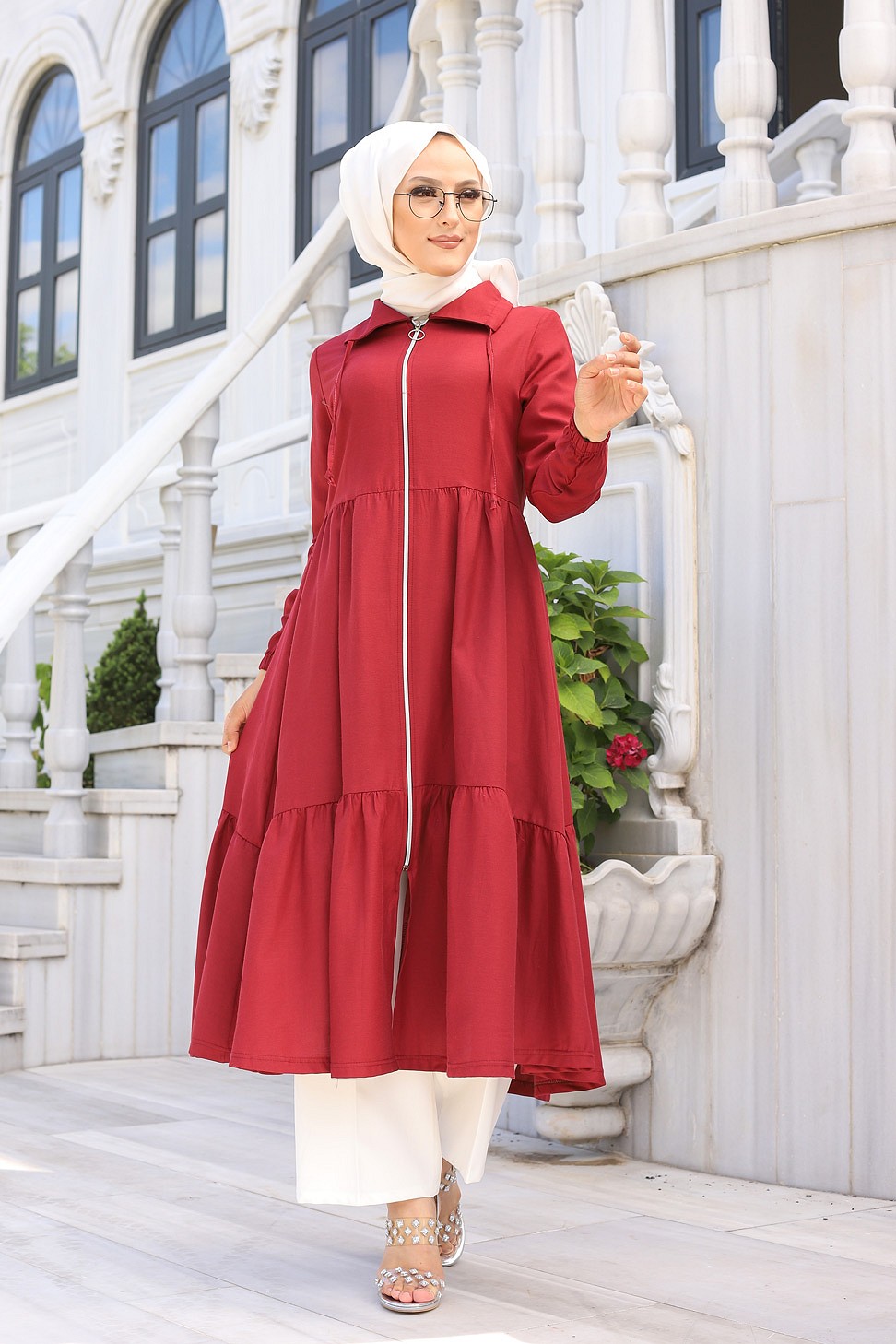 Veste zippee legere mi longue (Vetement ample pour femme voilee) - Couleur rouge bordeaux