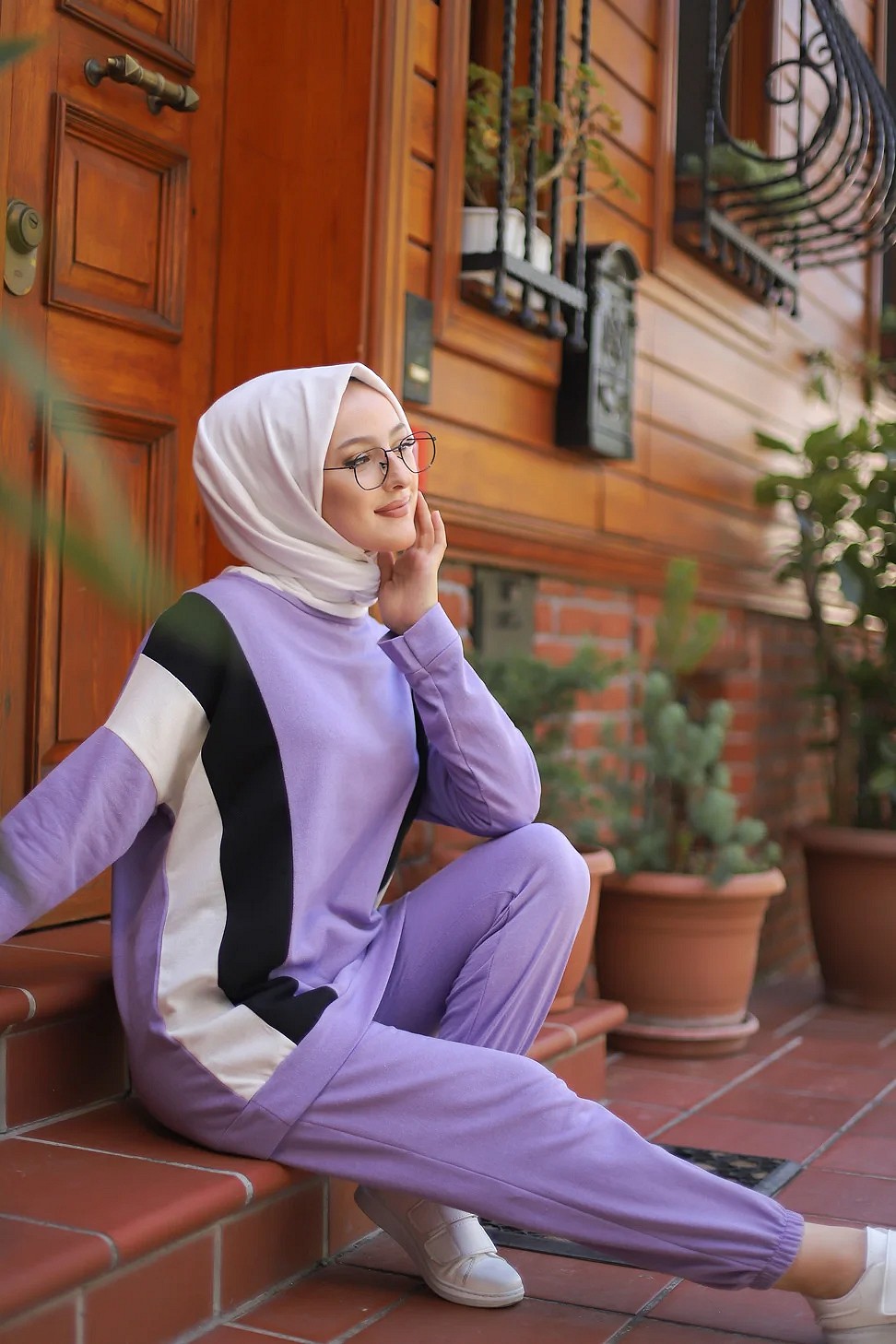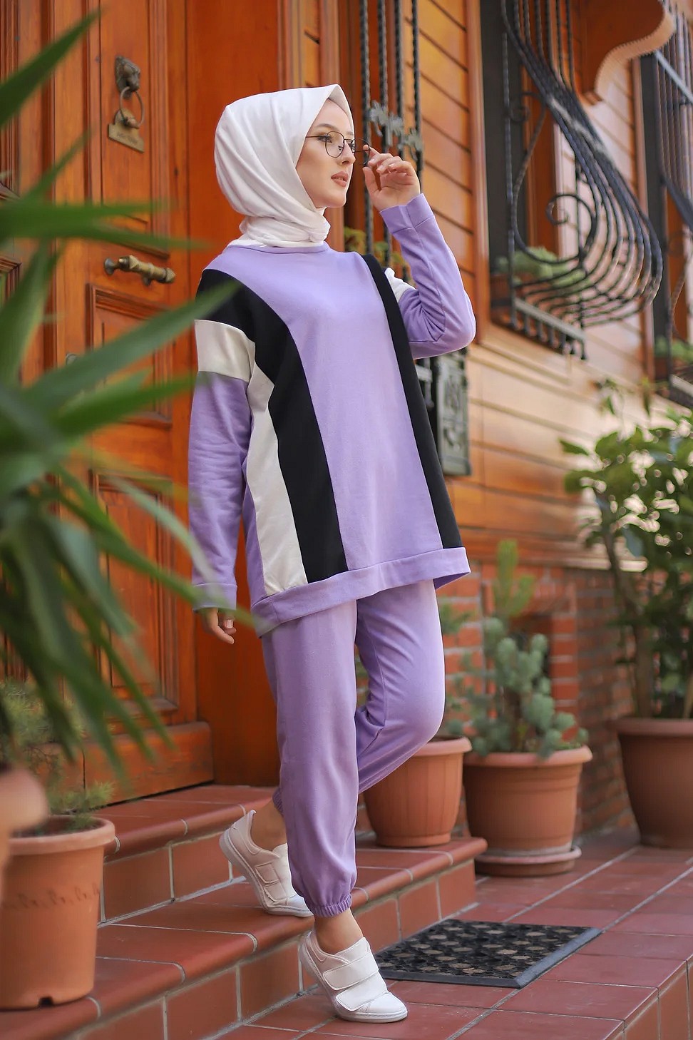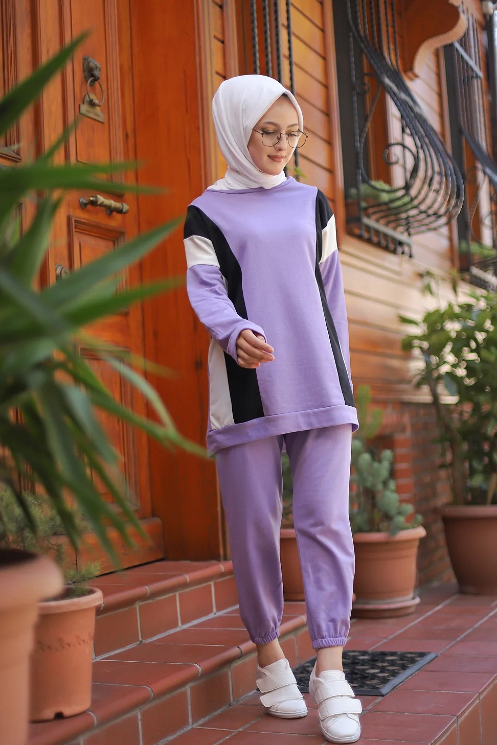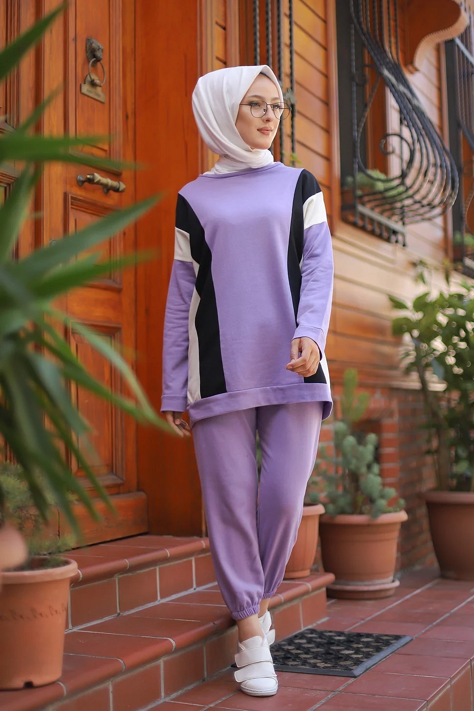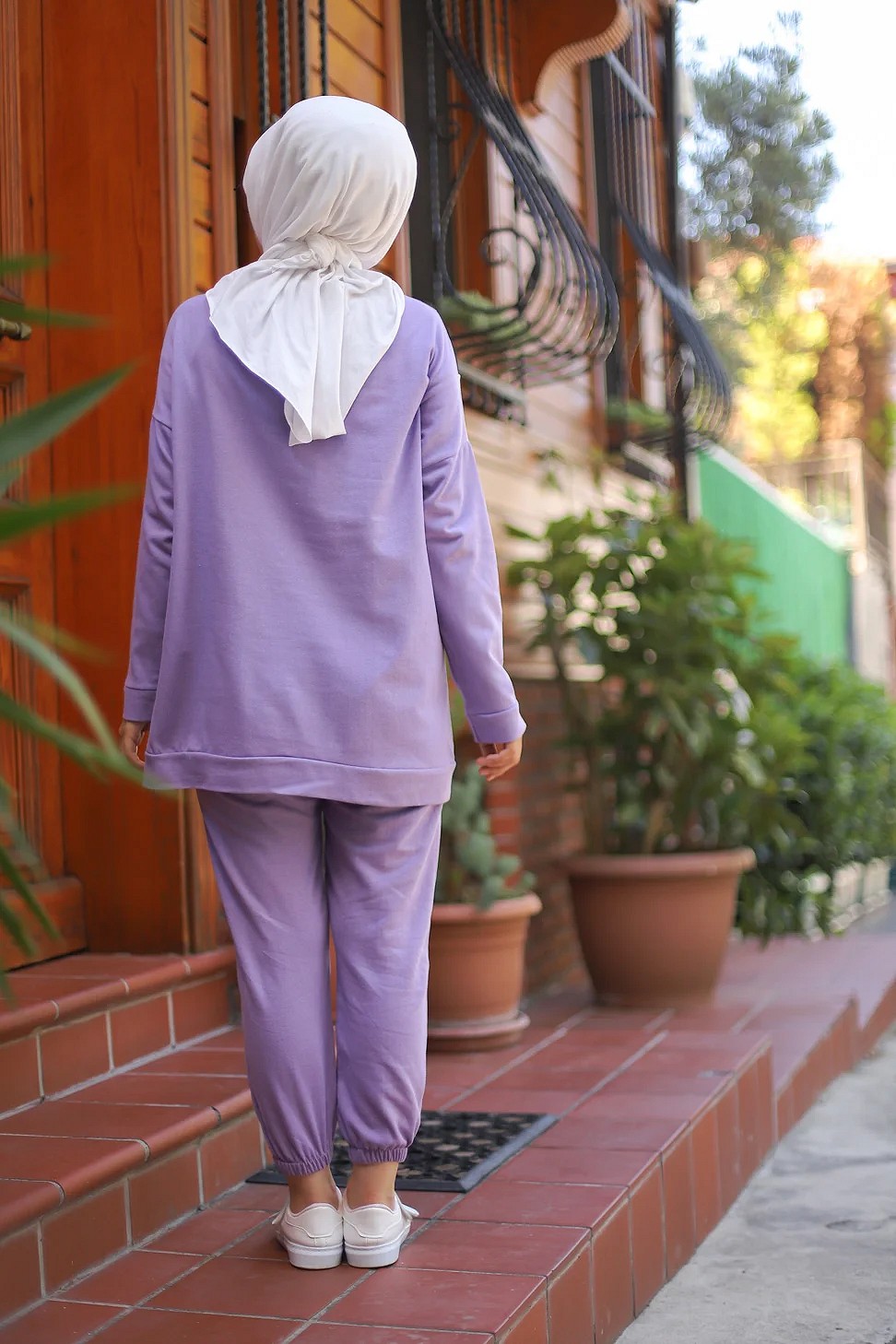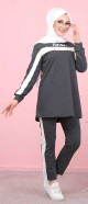 Ensemble 2 pièces pour femme voilée. Haut mi long, coupe droit. Pantalon taille élastique, coupe droite. Matière sweat.