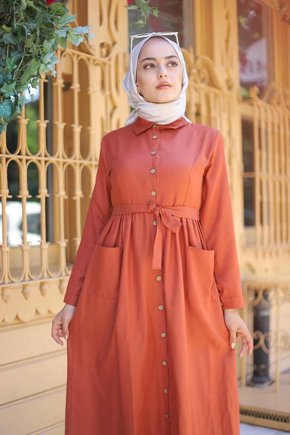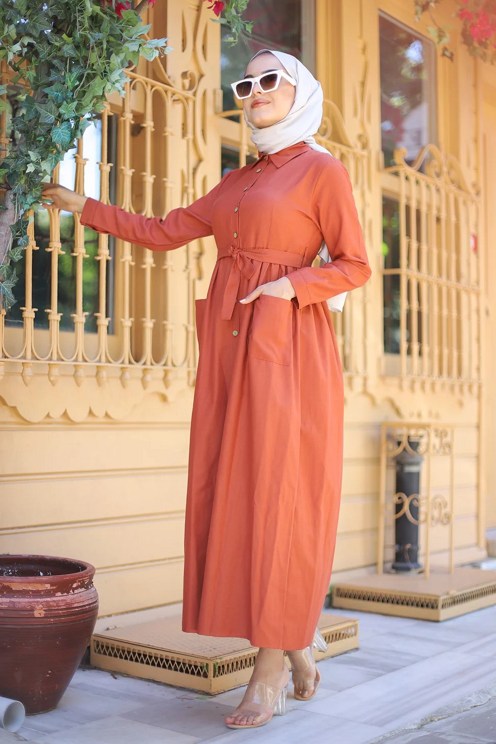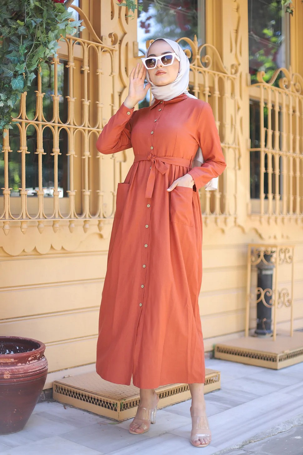 Robe chemise longue avec ceinture et grandes poches (Vetement ample pour femme voilée) - Couleur brique Vetement & Accessoire