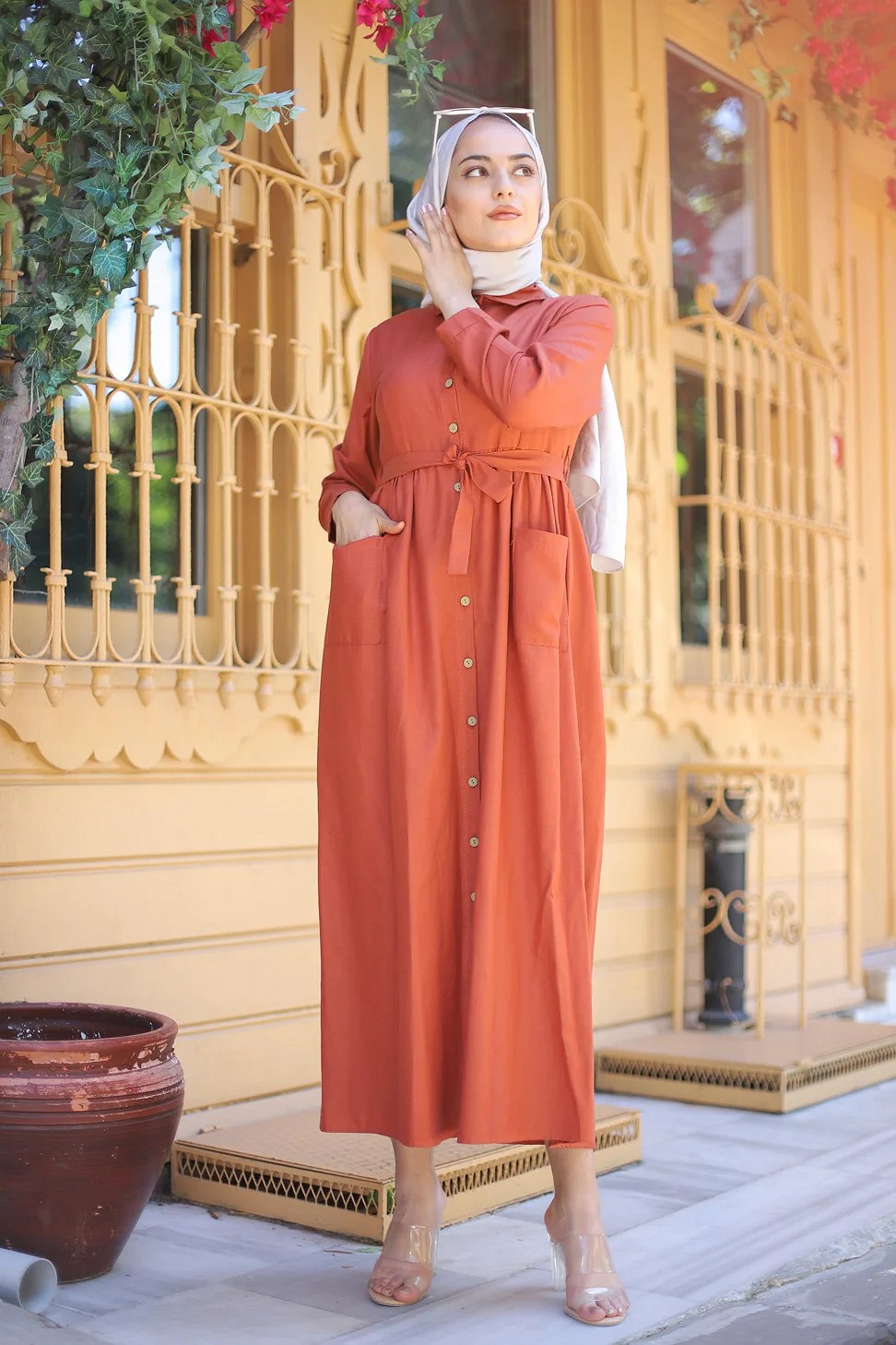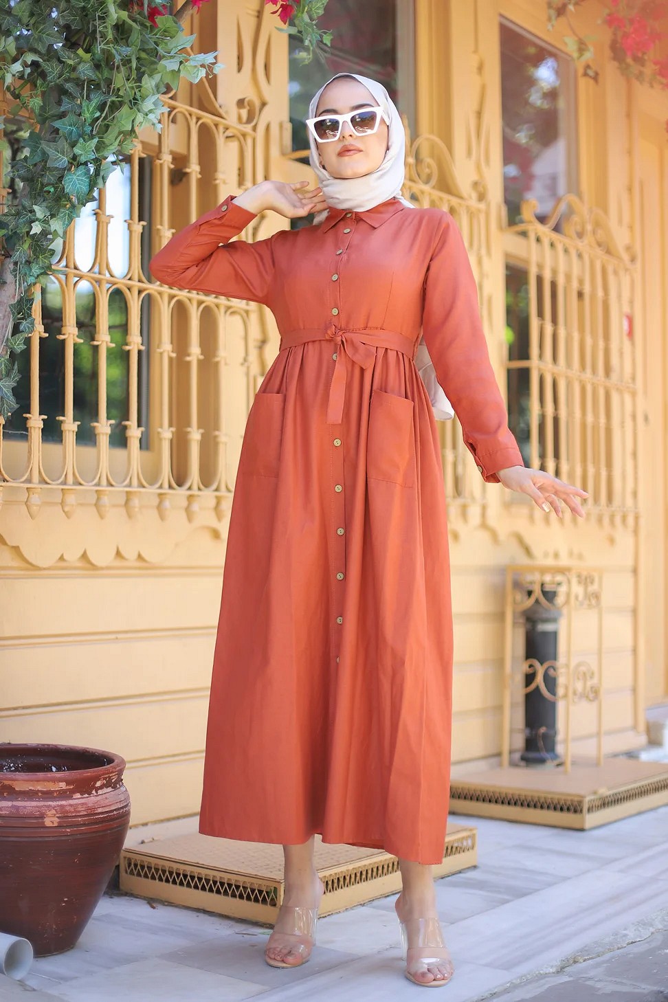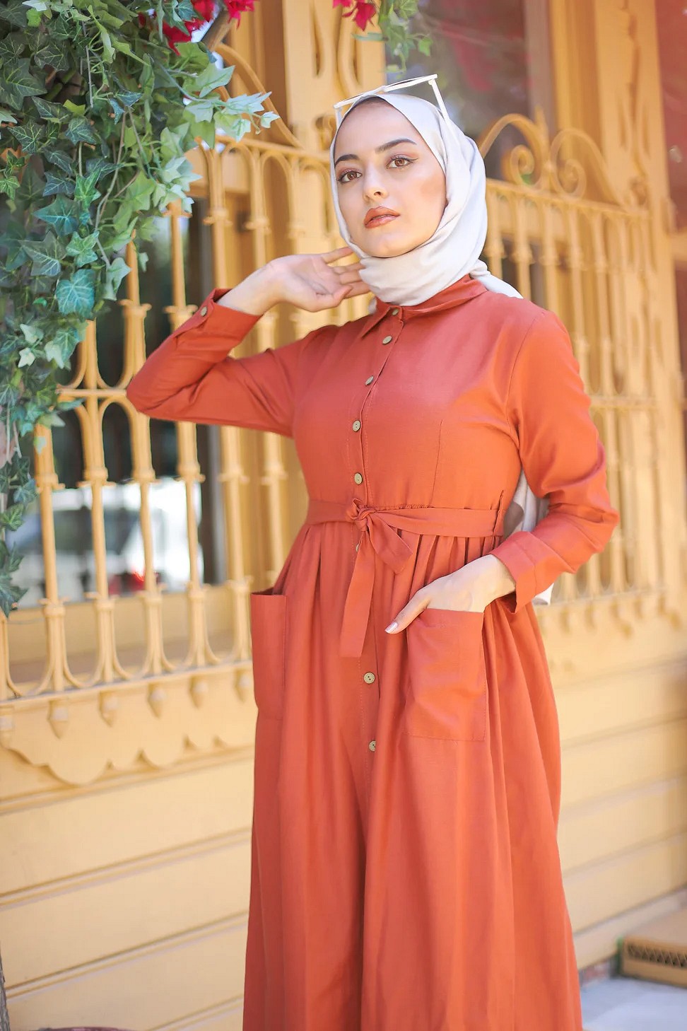 Robe chemise longue avec ceinture et grandes poches (Vetement ample pour femme voilée) - Couleur brique Vetement & Accessoire