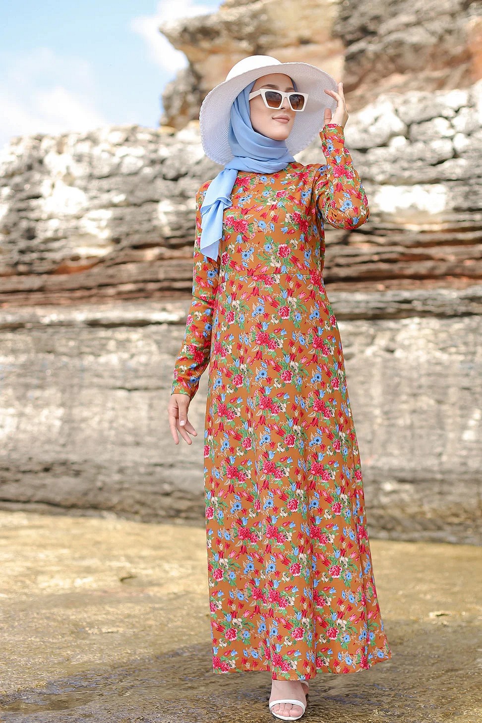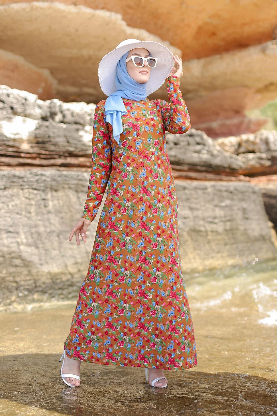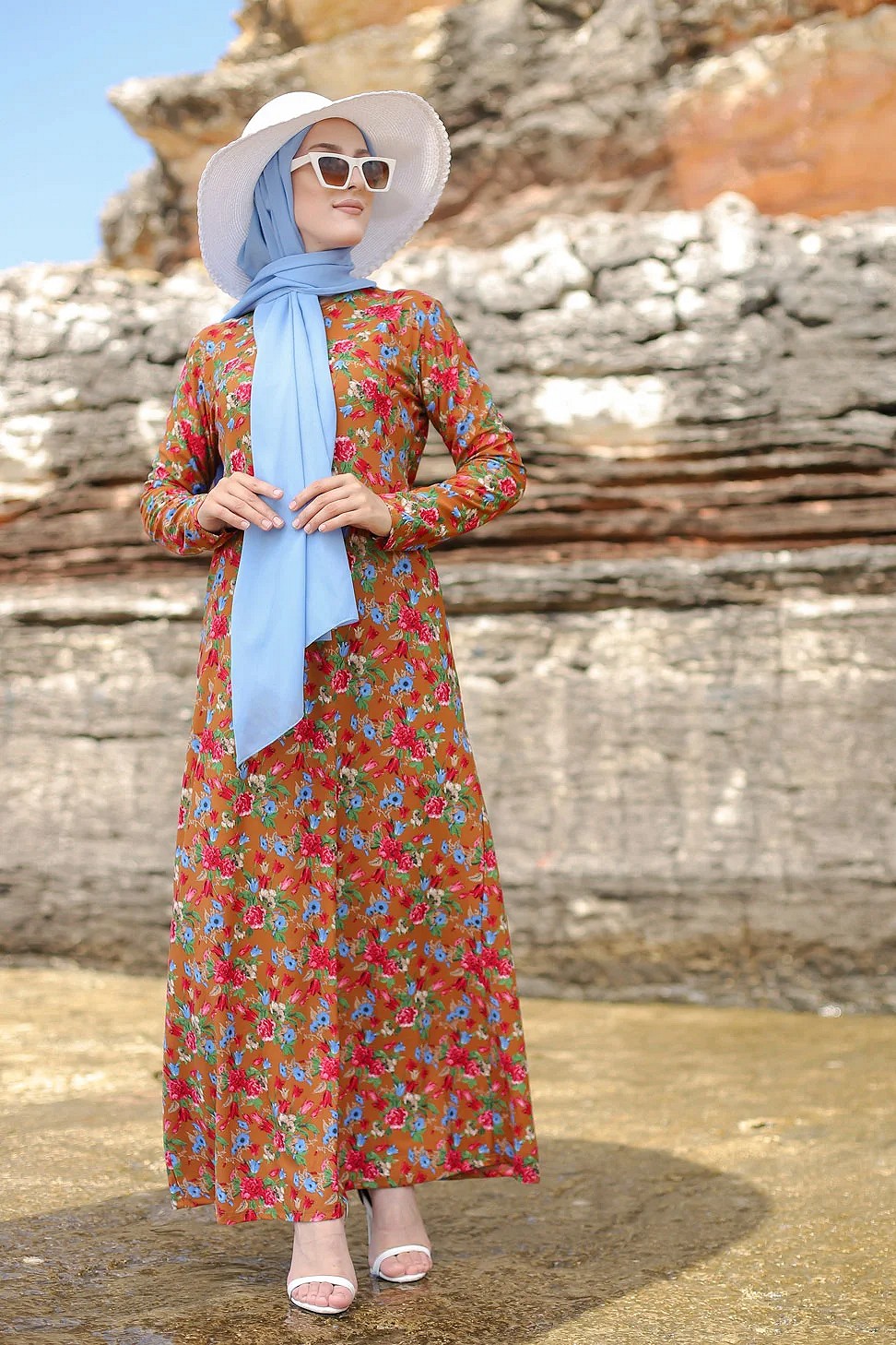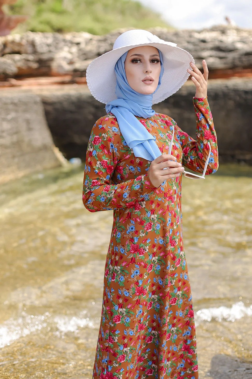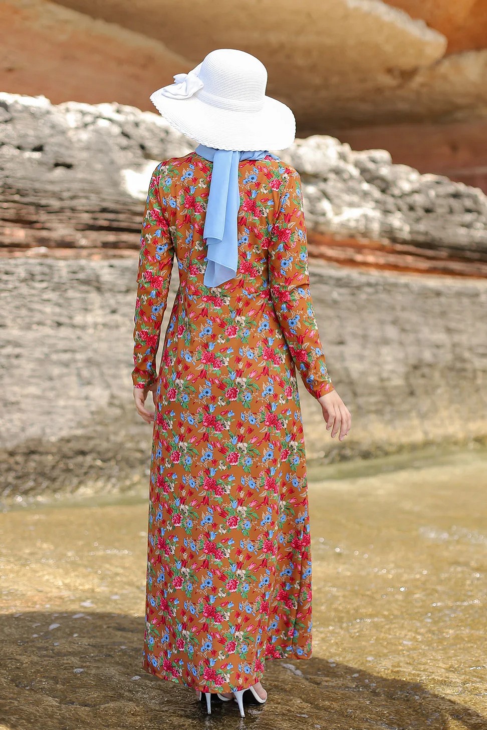Robe musulmane longue à motif fleur multicouleur sur un fond de couleur Marron Vetement & Accessoire