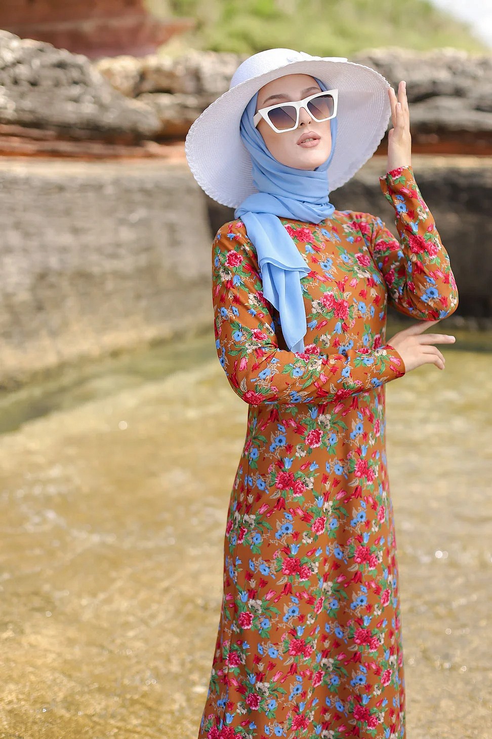 Robe musulmane longue a motif fleur multicouleur sur un fond de couleur Marron